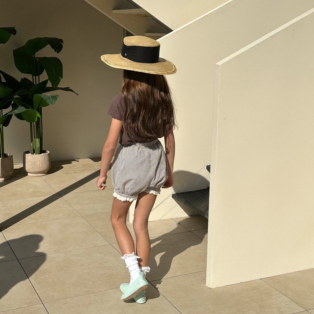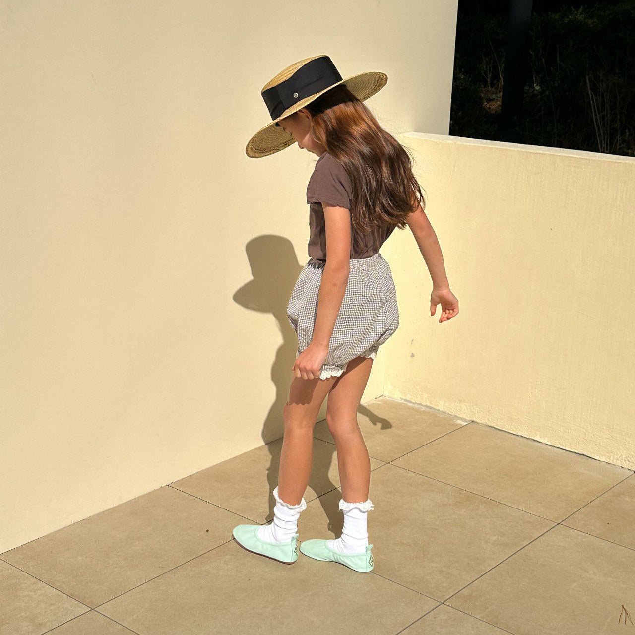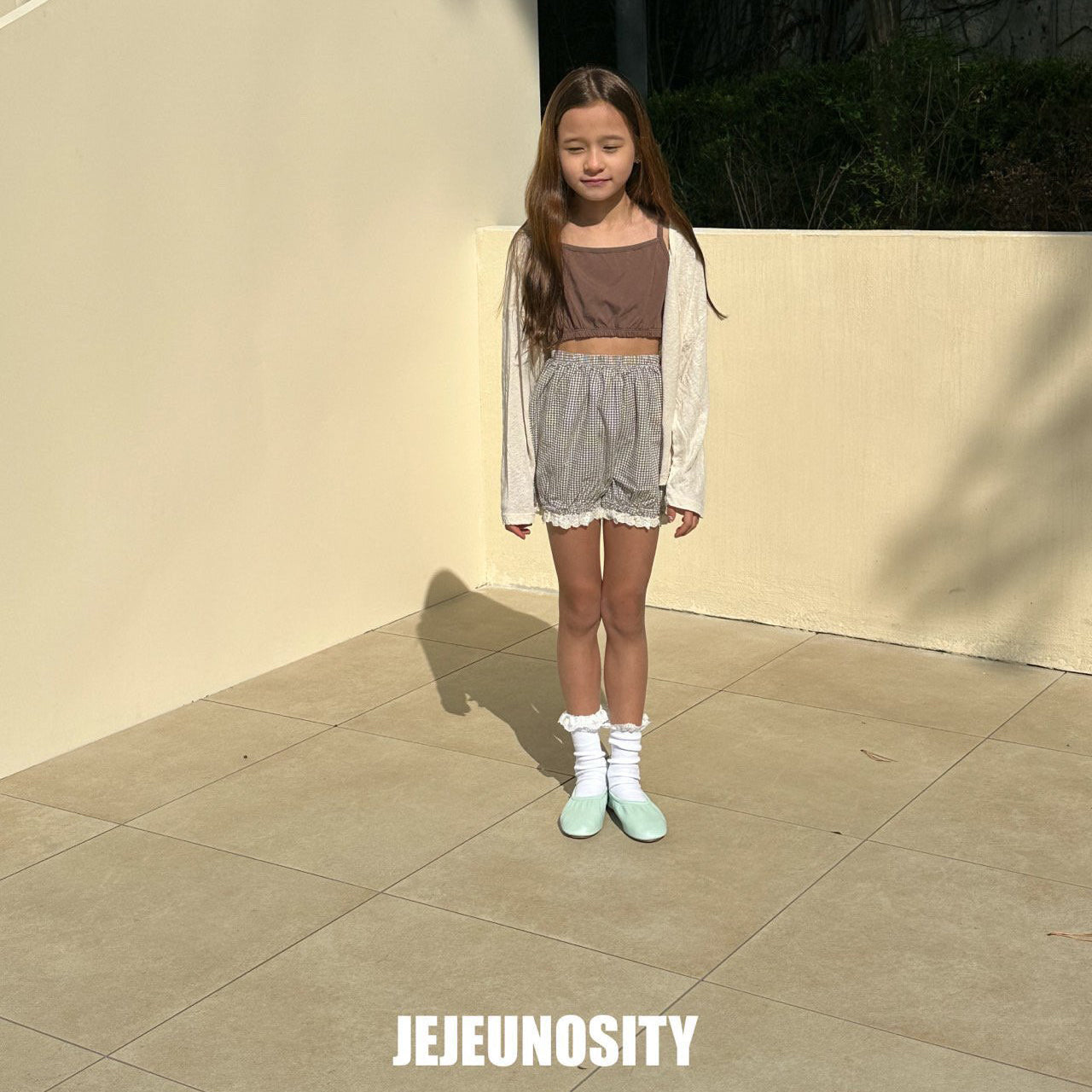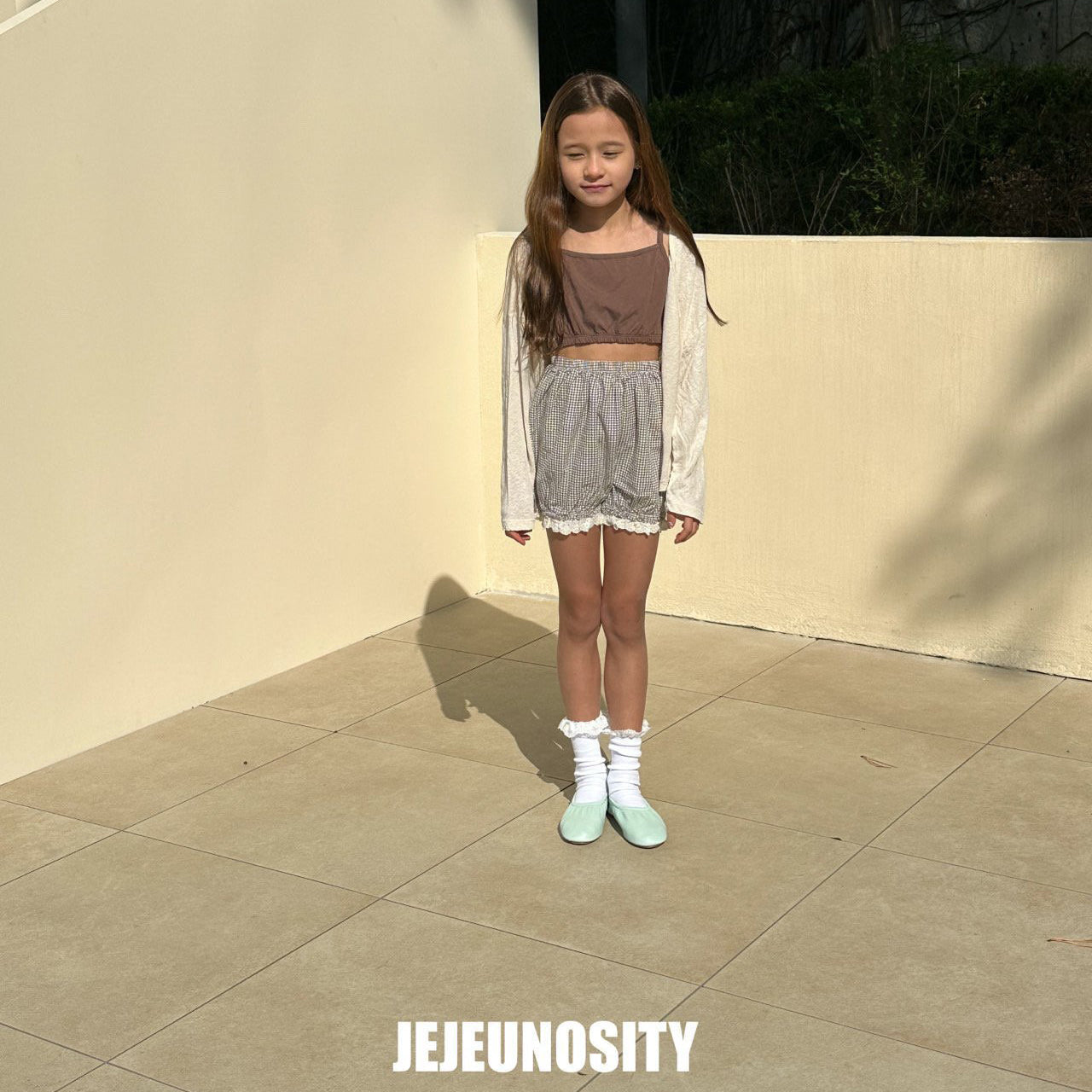 女童浅绿色格子棉短裤