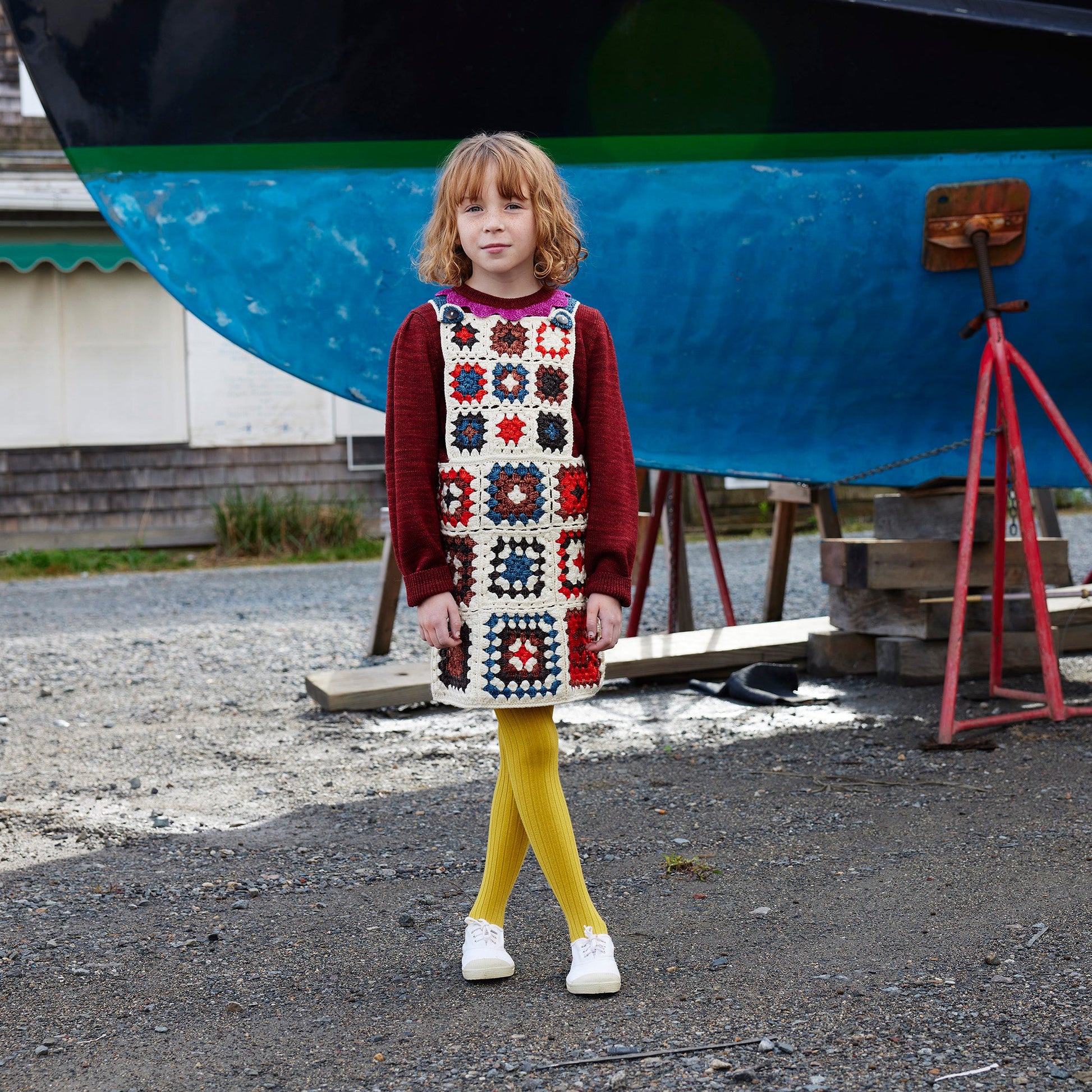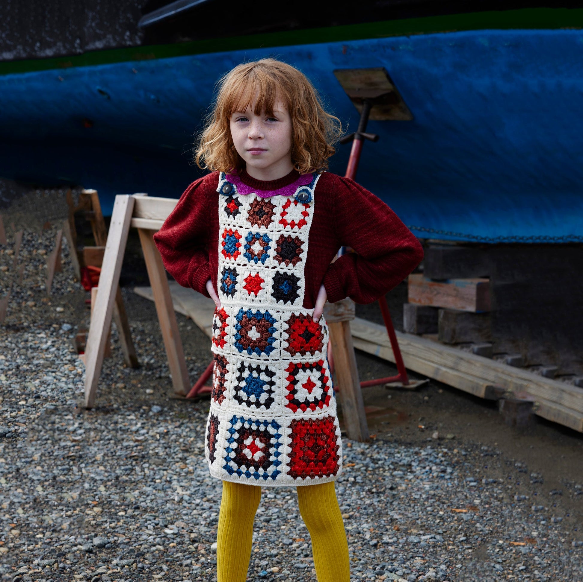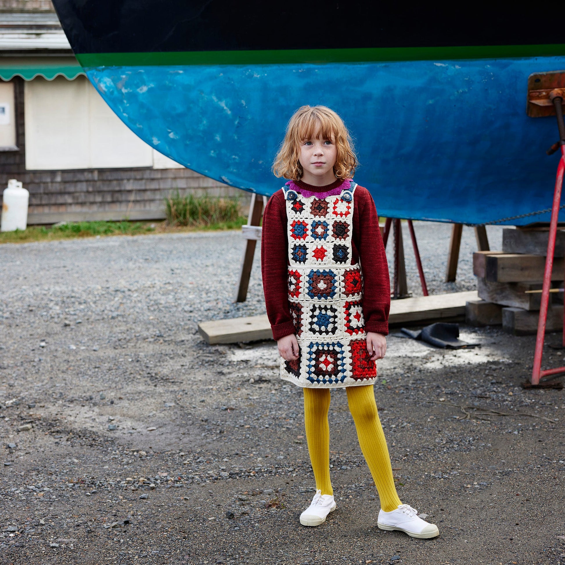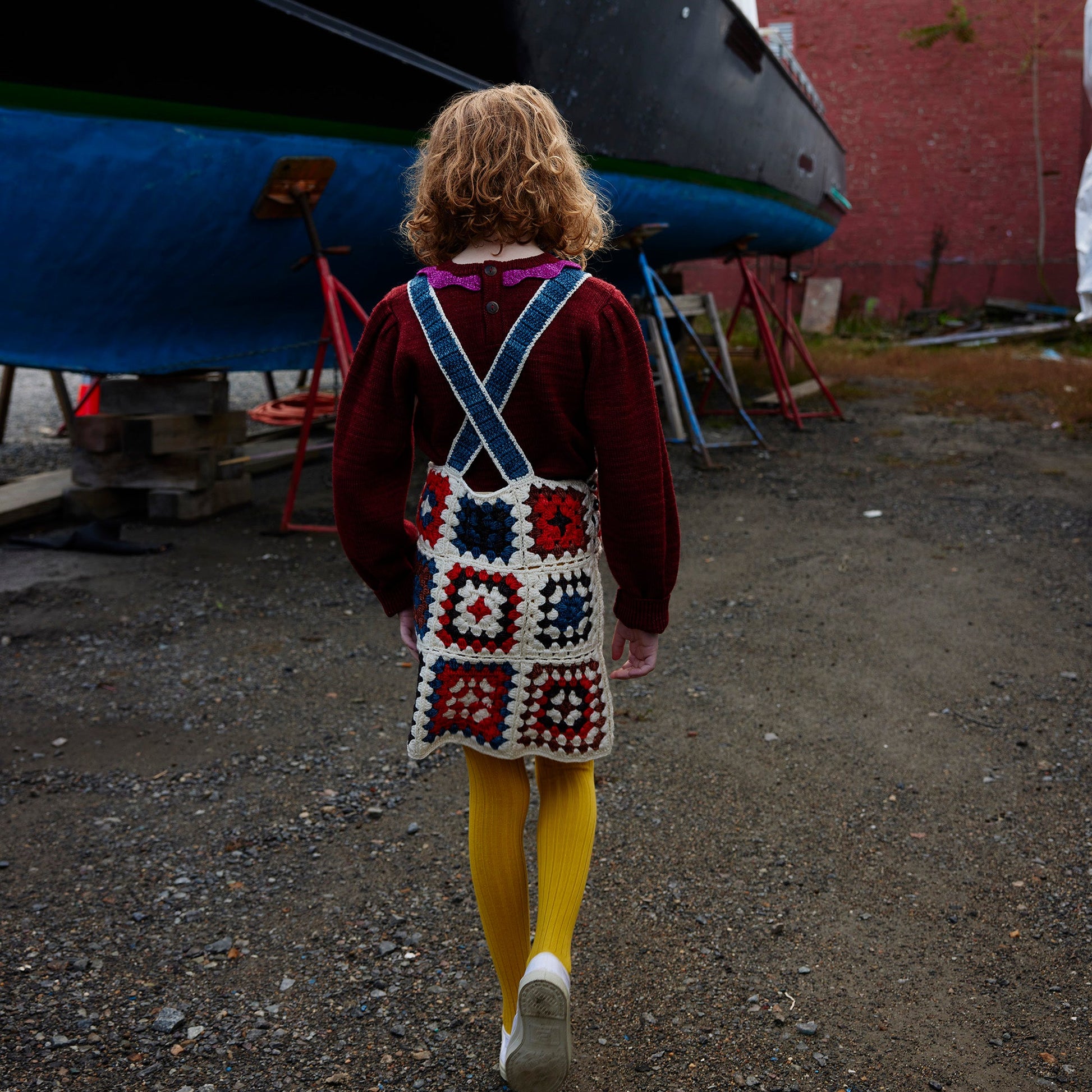 女童白色钩花羊毛背带裙