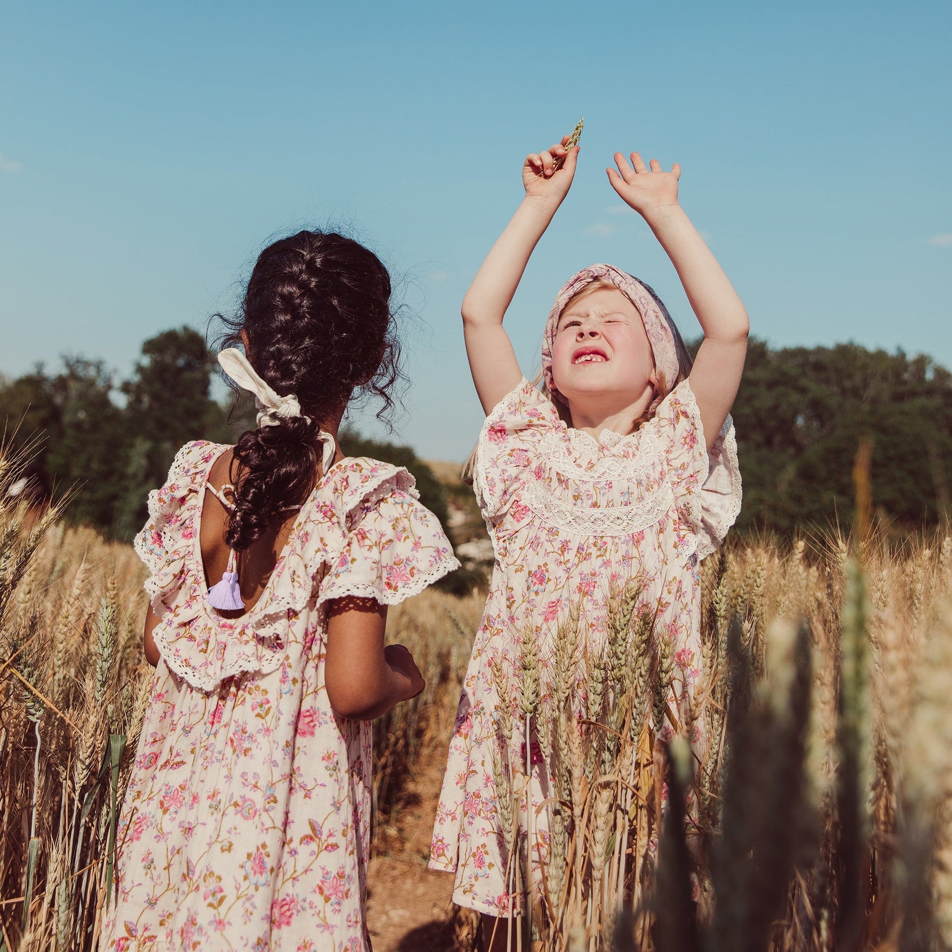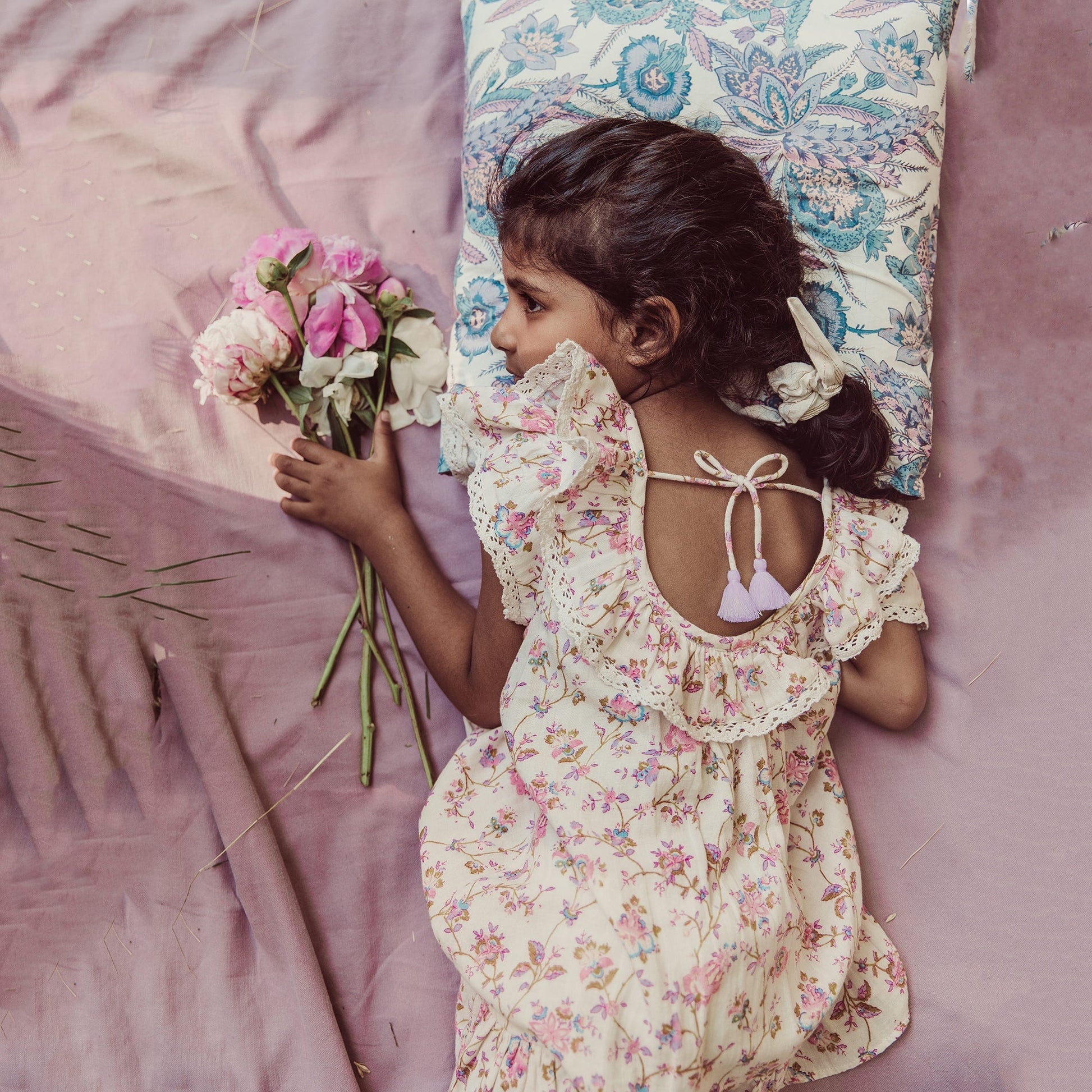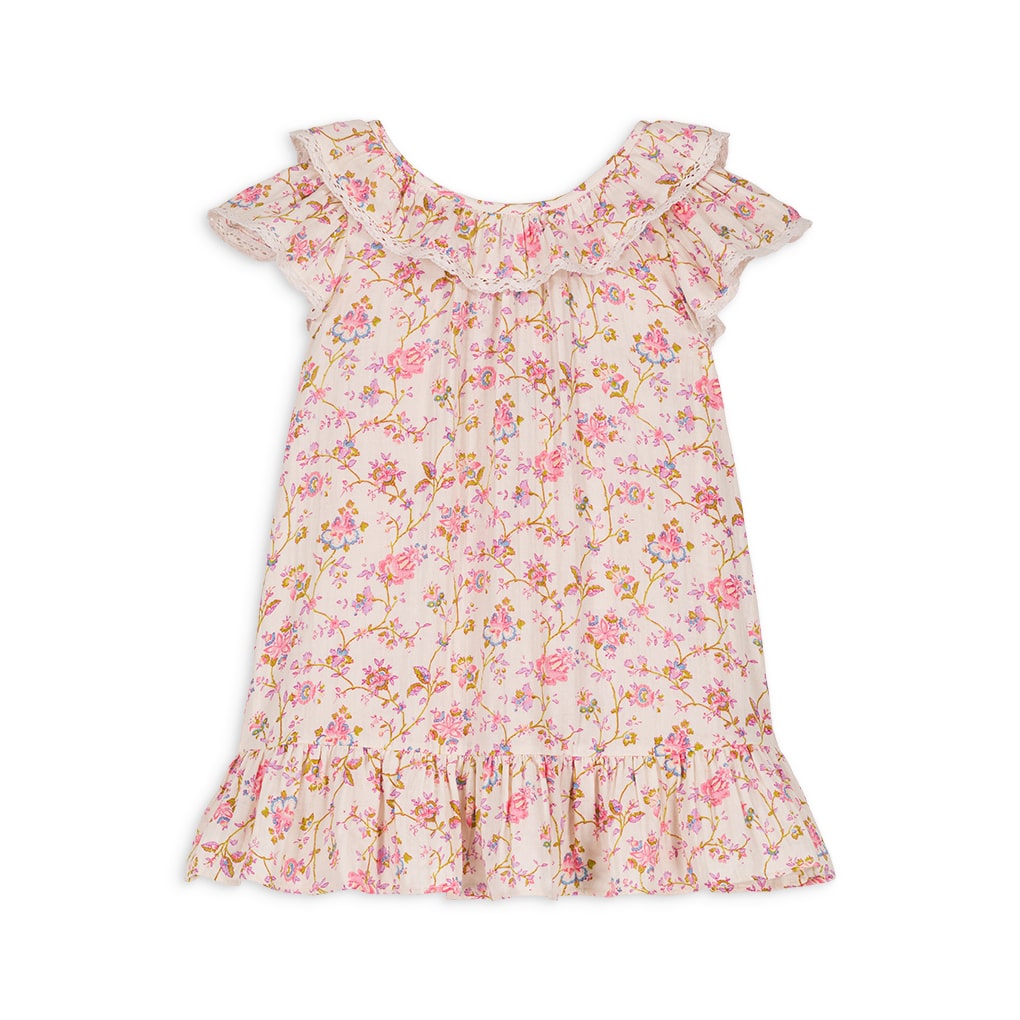 女童粉色碎花荷叶领棉连衣裙