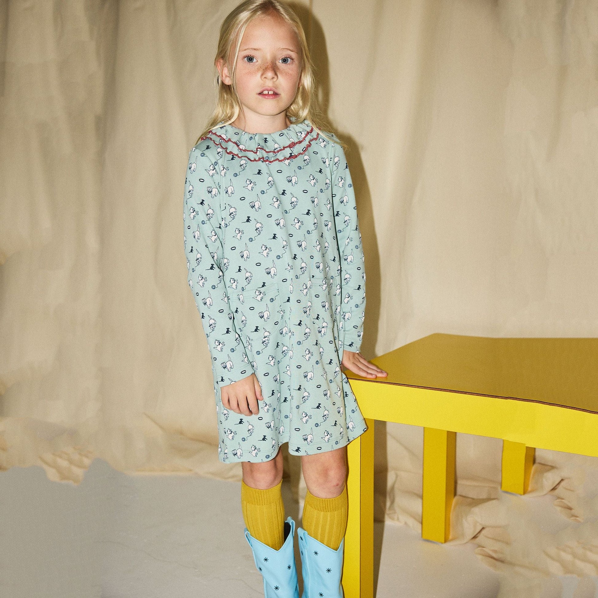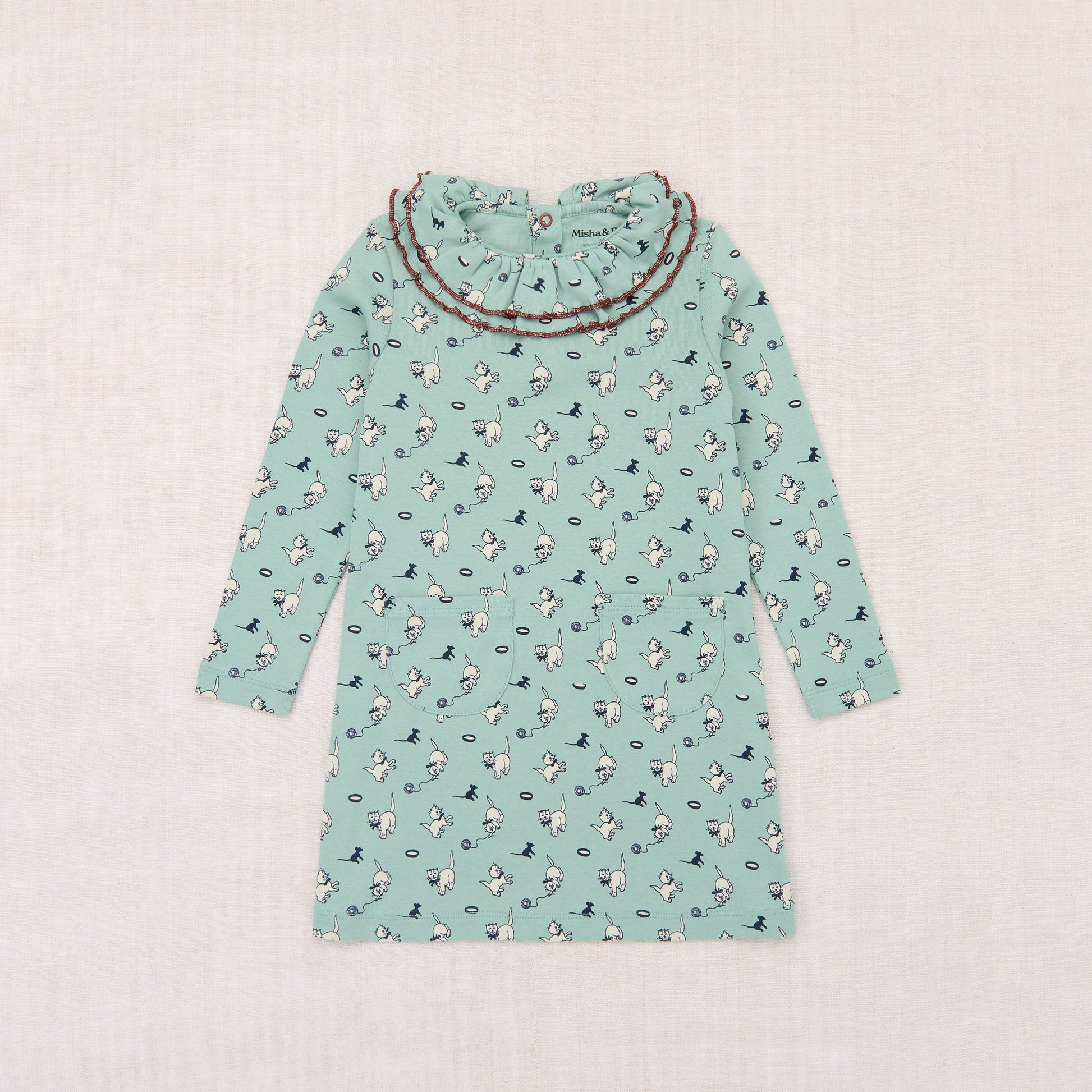 女童绿色印花荷叶边棉连衣裙