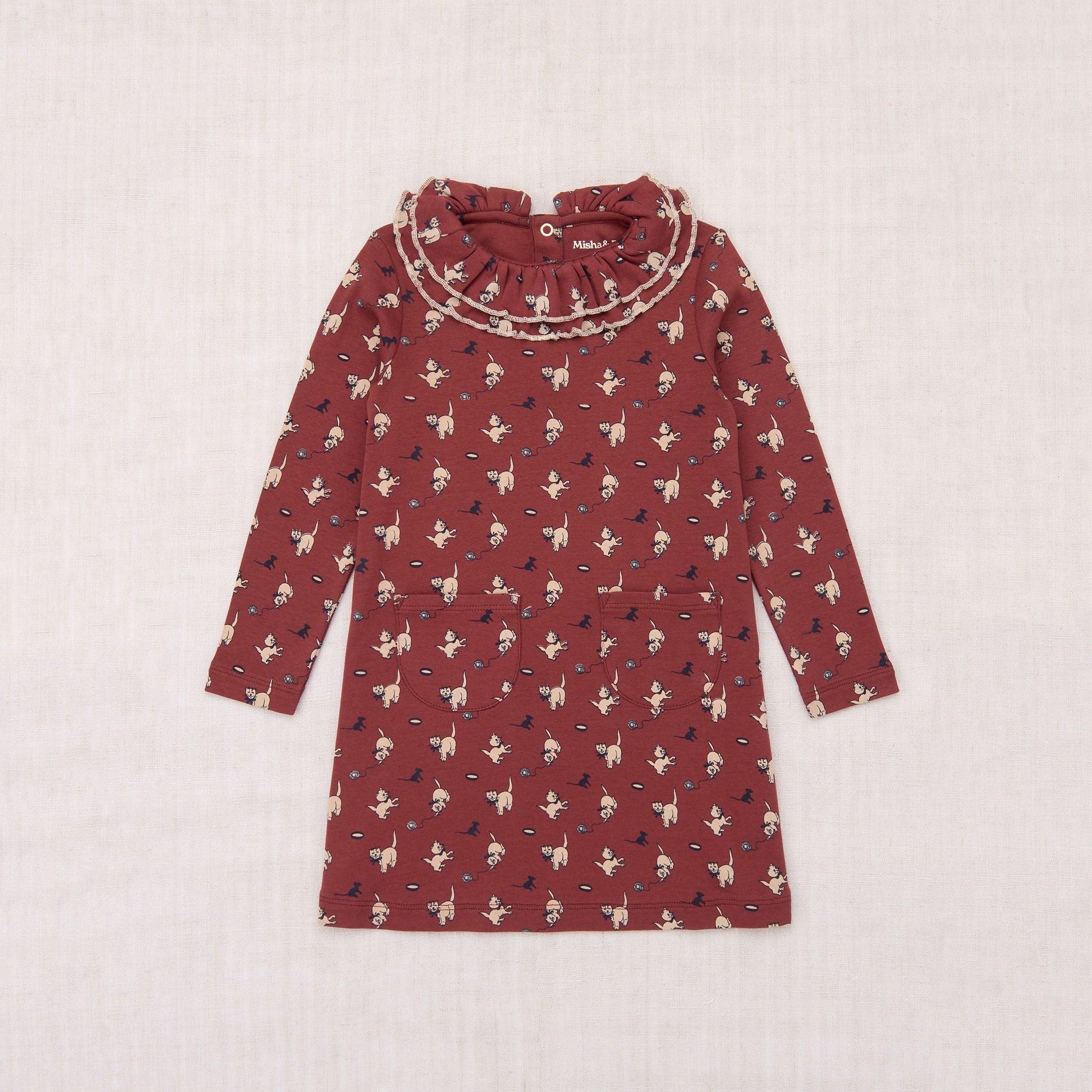 女童砖红色印花荷叶边棉连衣裙