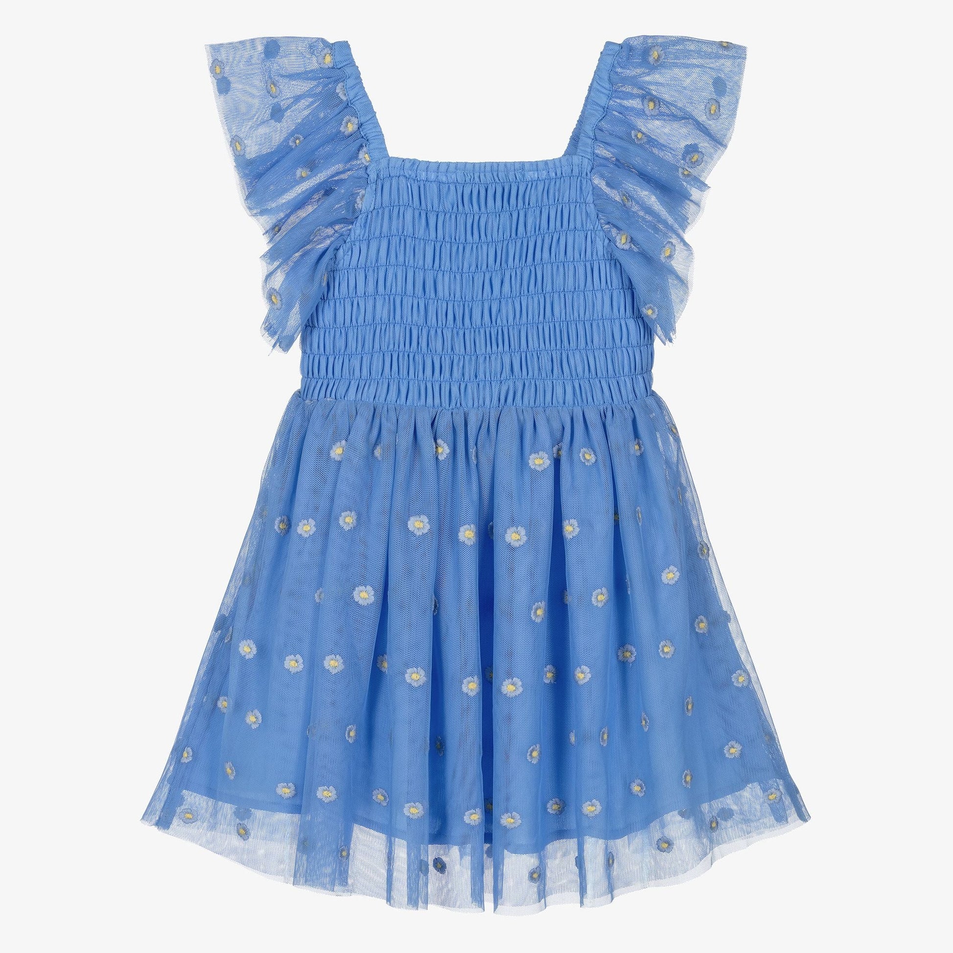 女童蓝色花朵刺绣薄纱连衣裙