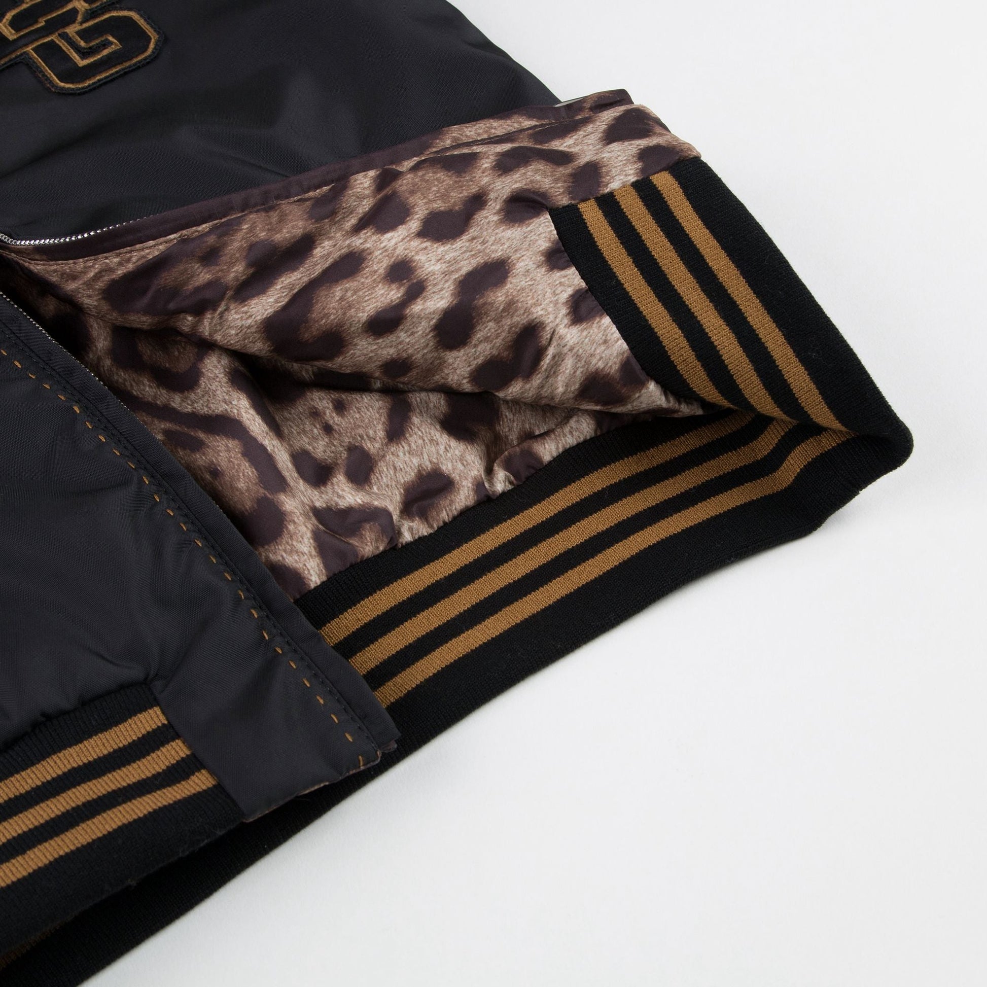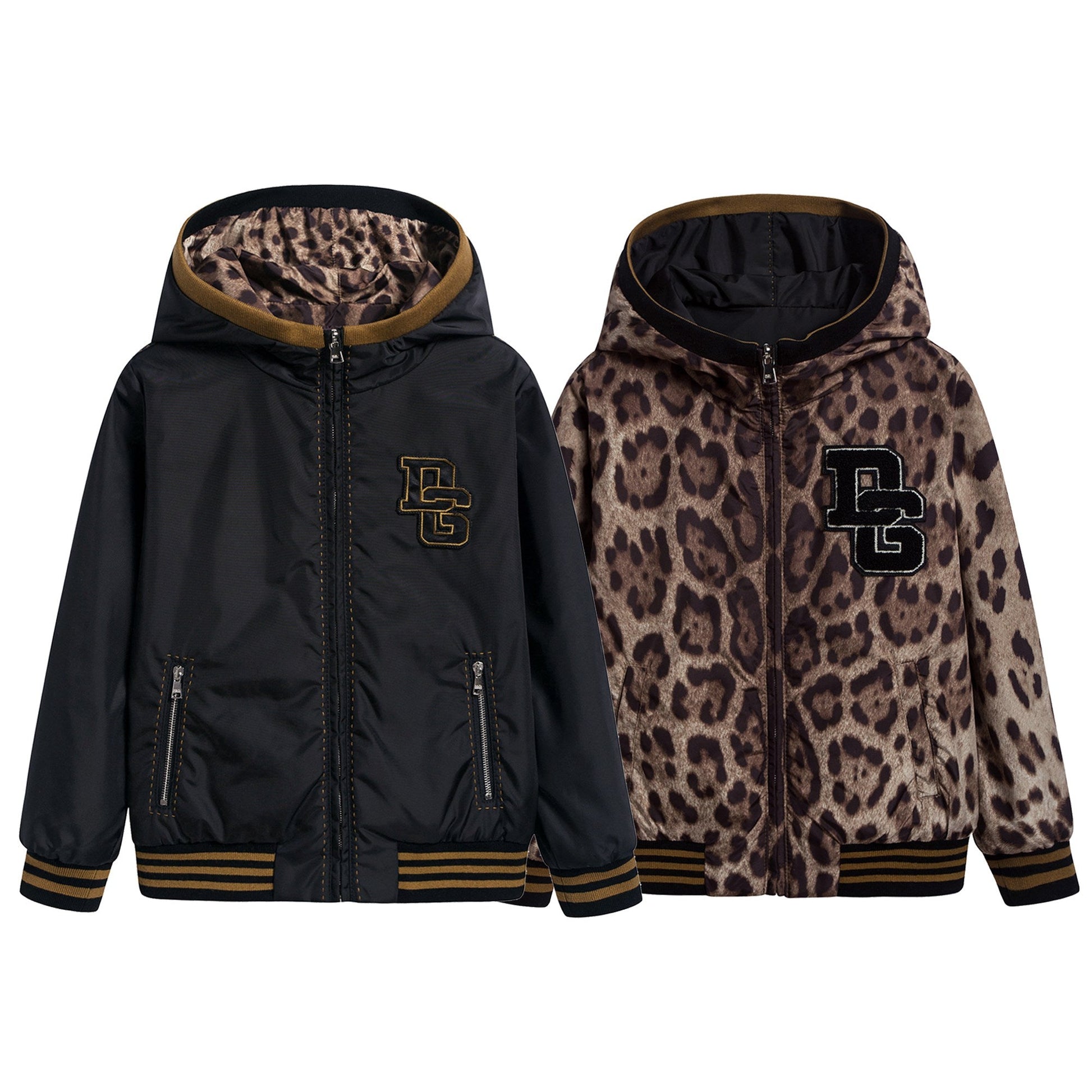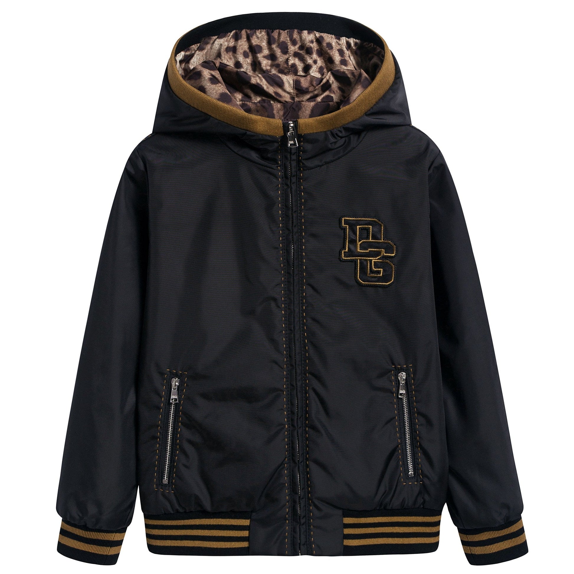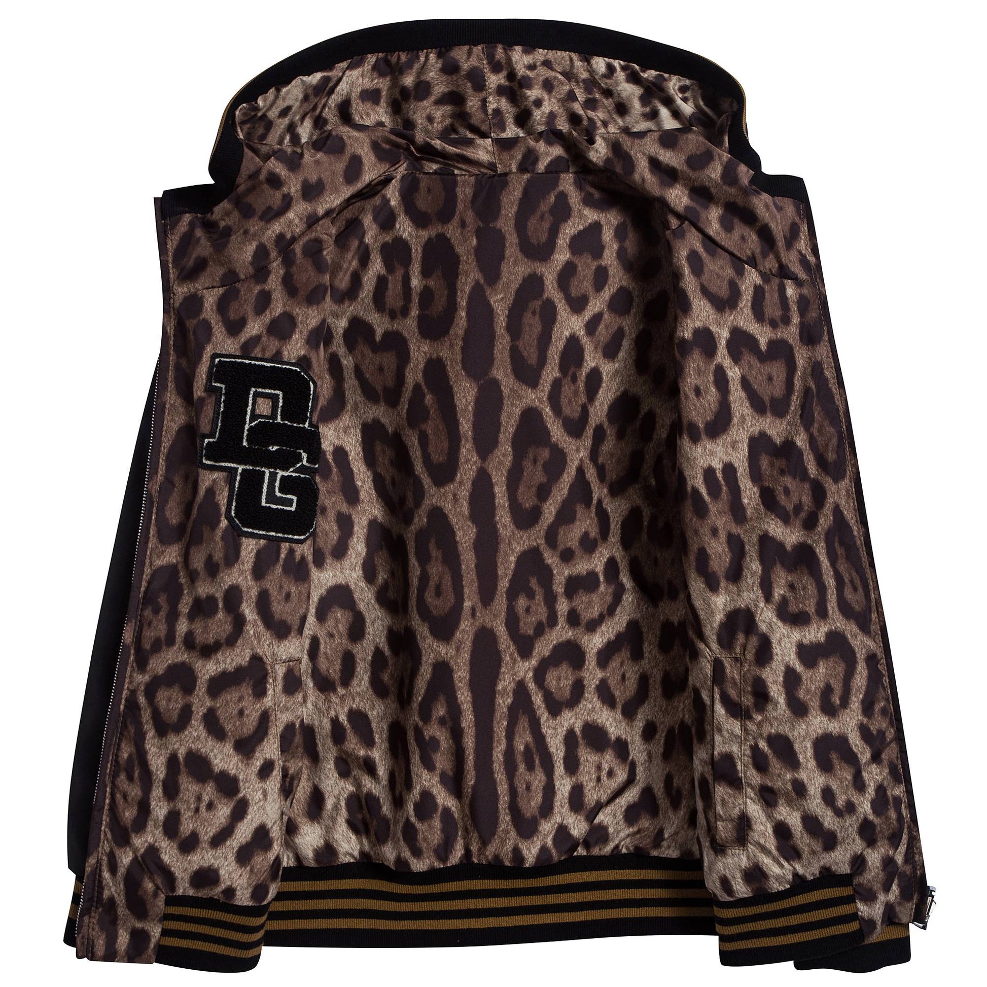 男孩黑色和豹纹双面两穿夹克衫,黑色面由尼龙制造,豹纹面由涤纶制造,光滑的面料让夹克两面看起来都很华丽。