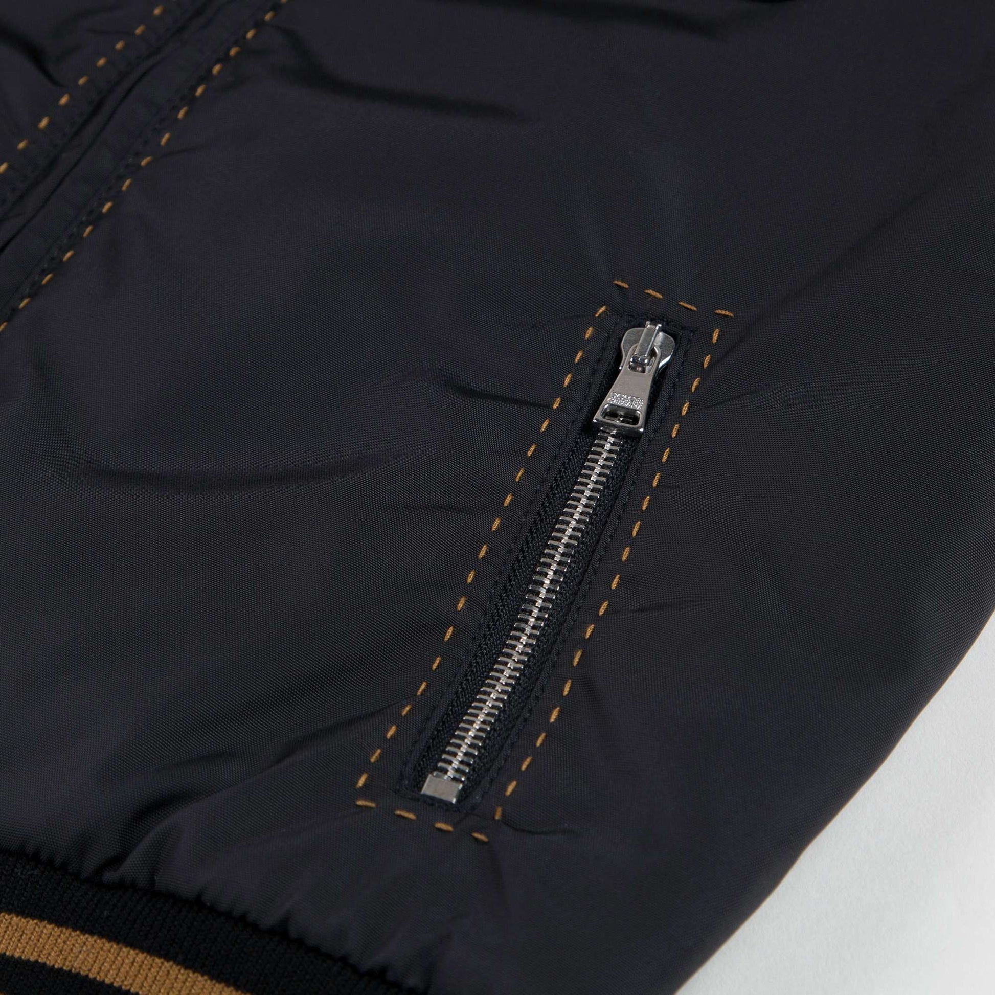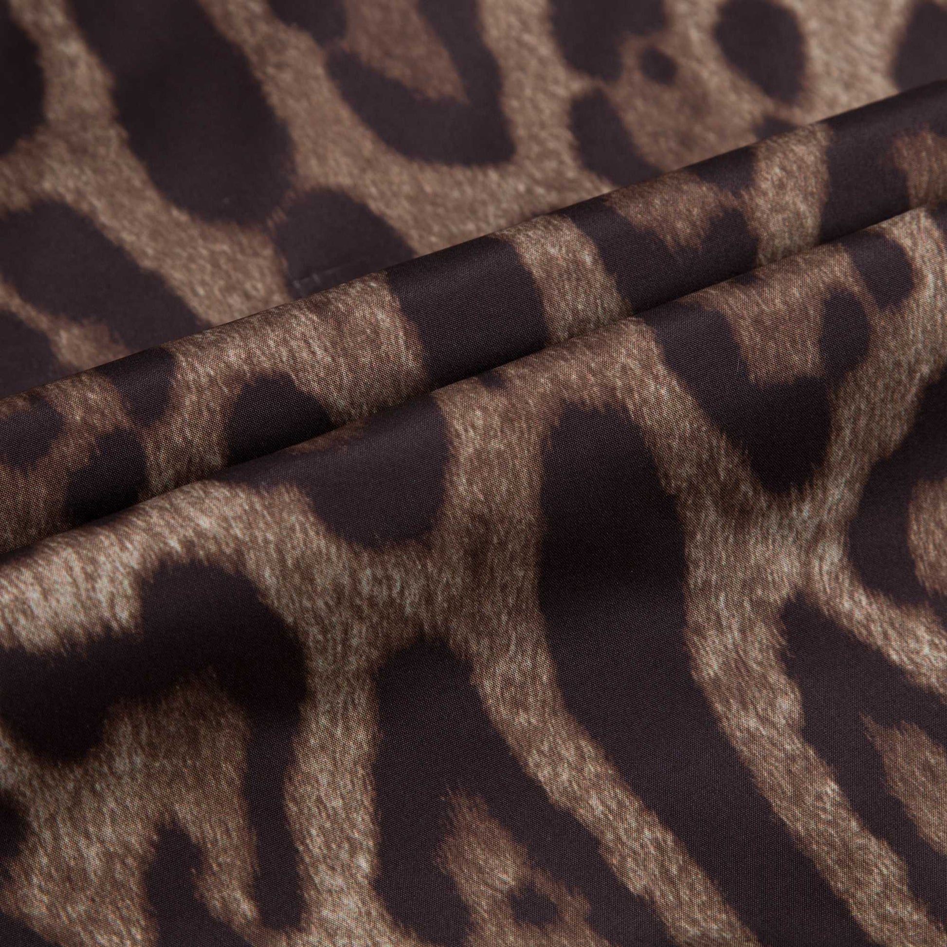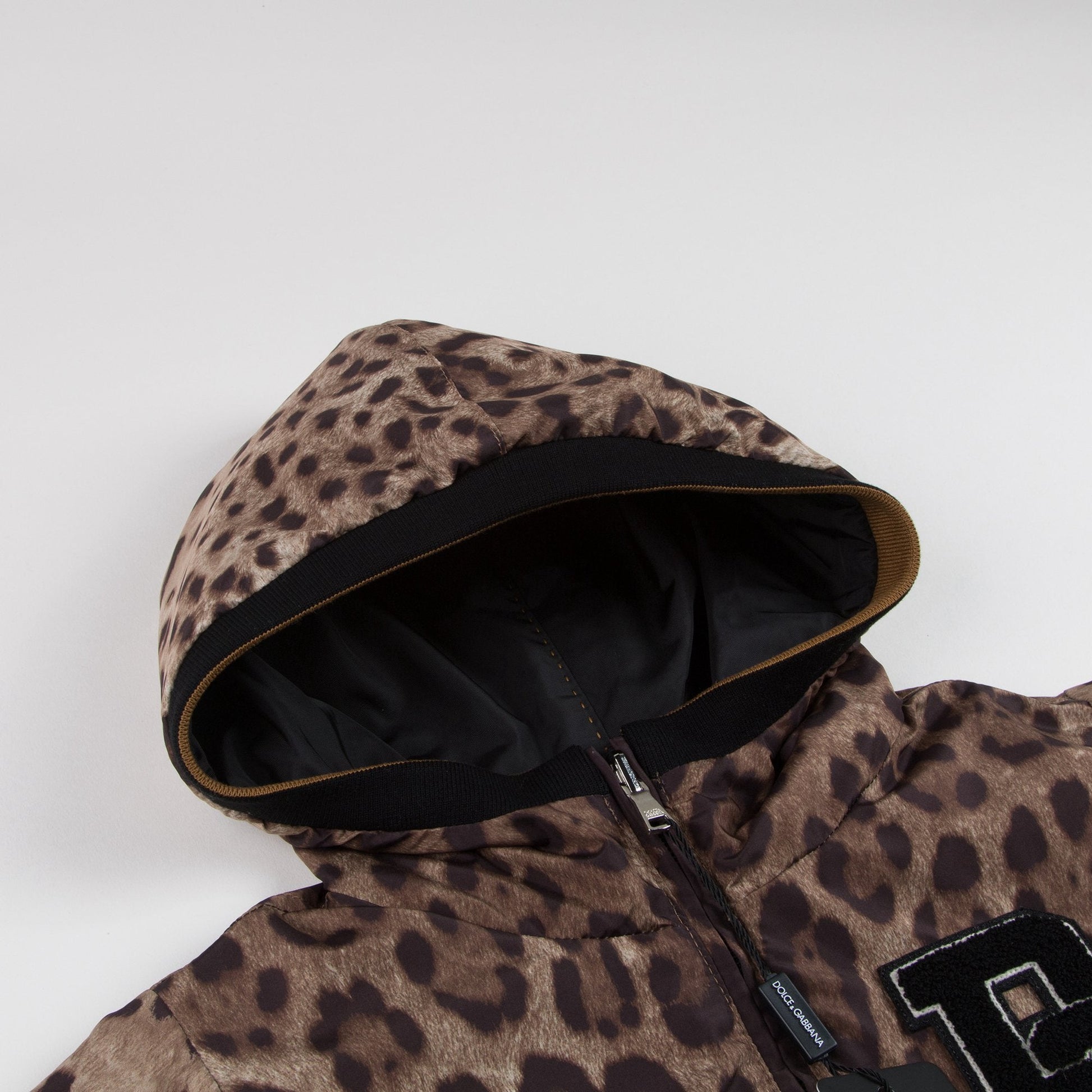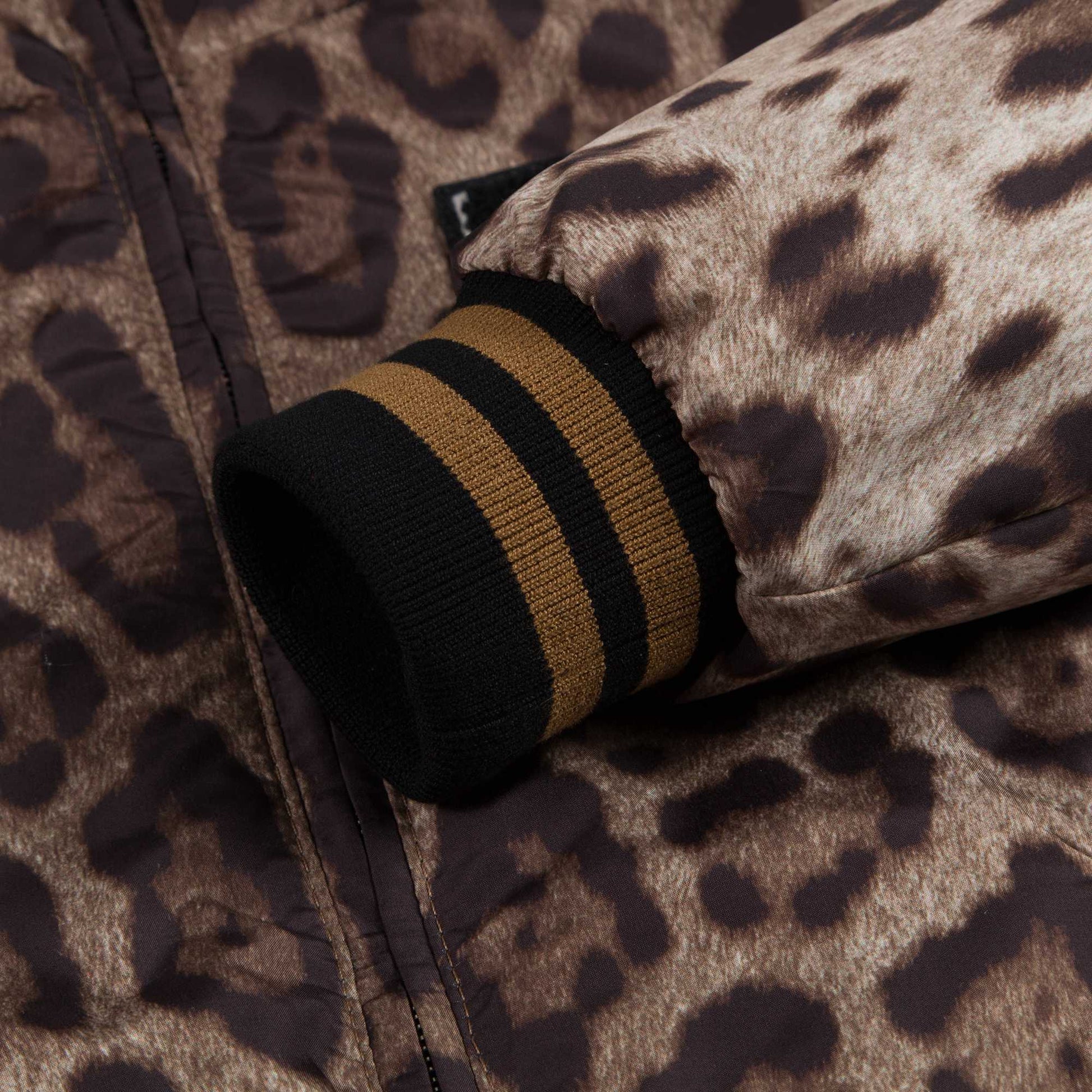 男孩黑色和豹纹双面两穿夹克衫,黑色面由尼龙制造,豹纹面由涤纶制造,光滑的面料让夹克两面看起来都很华丽。