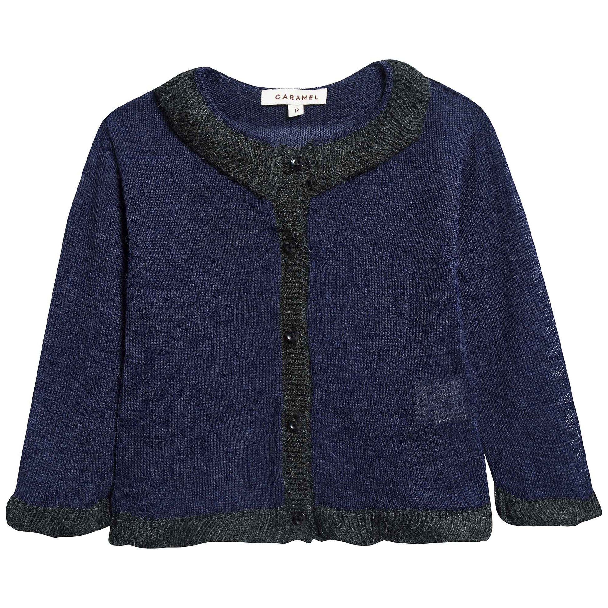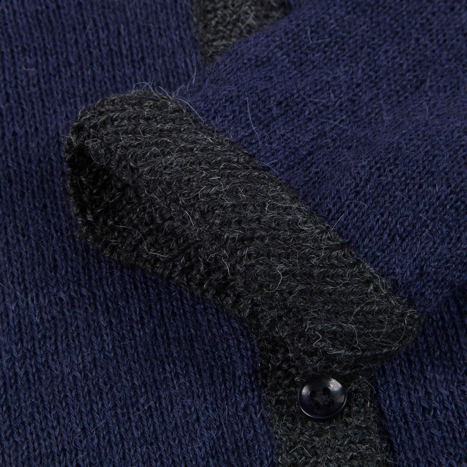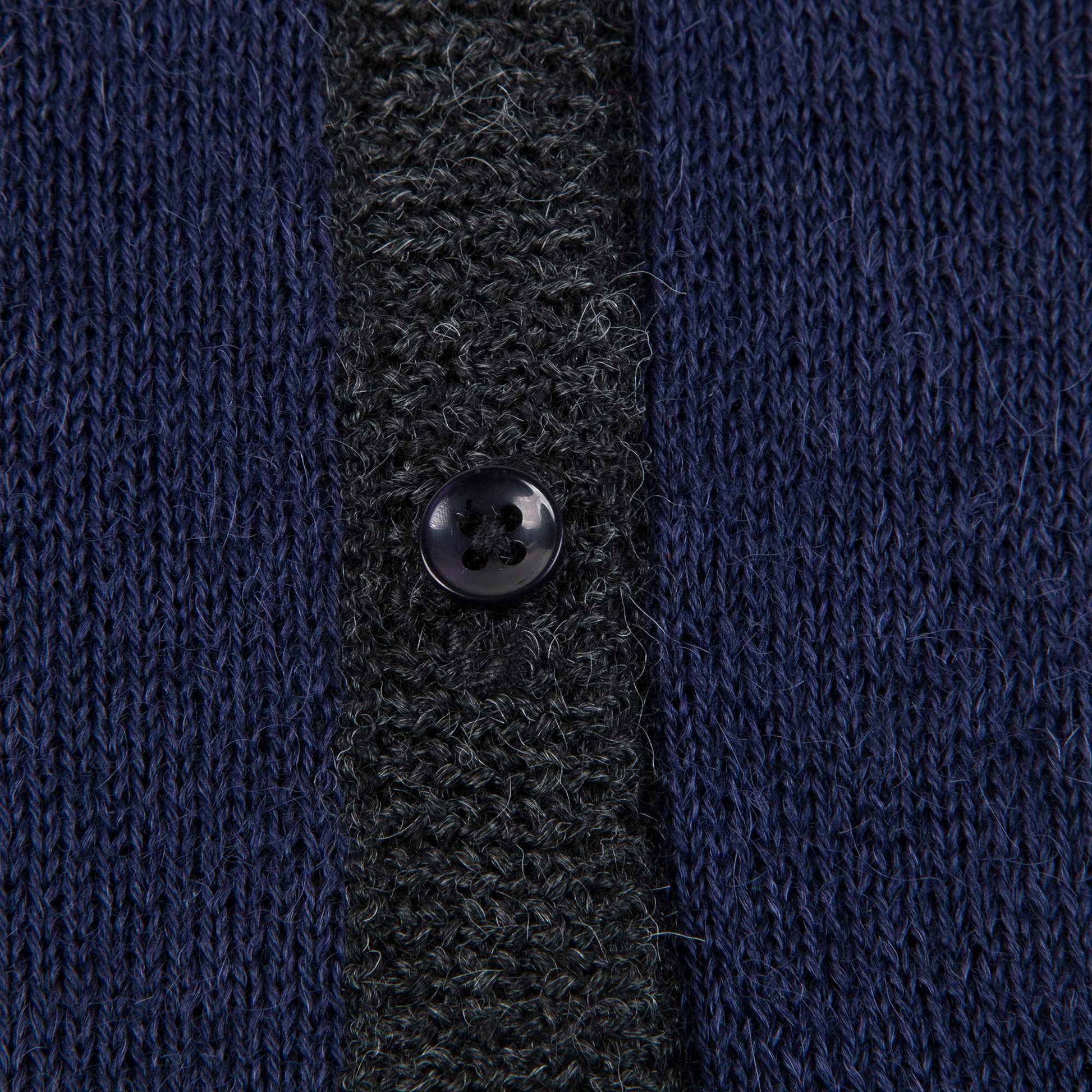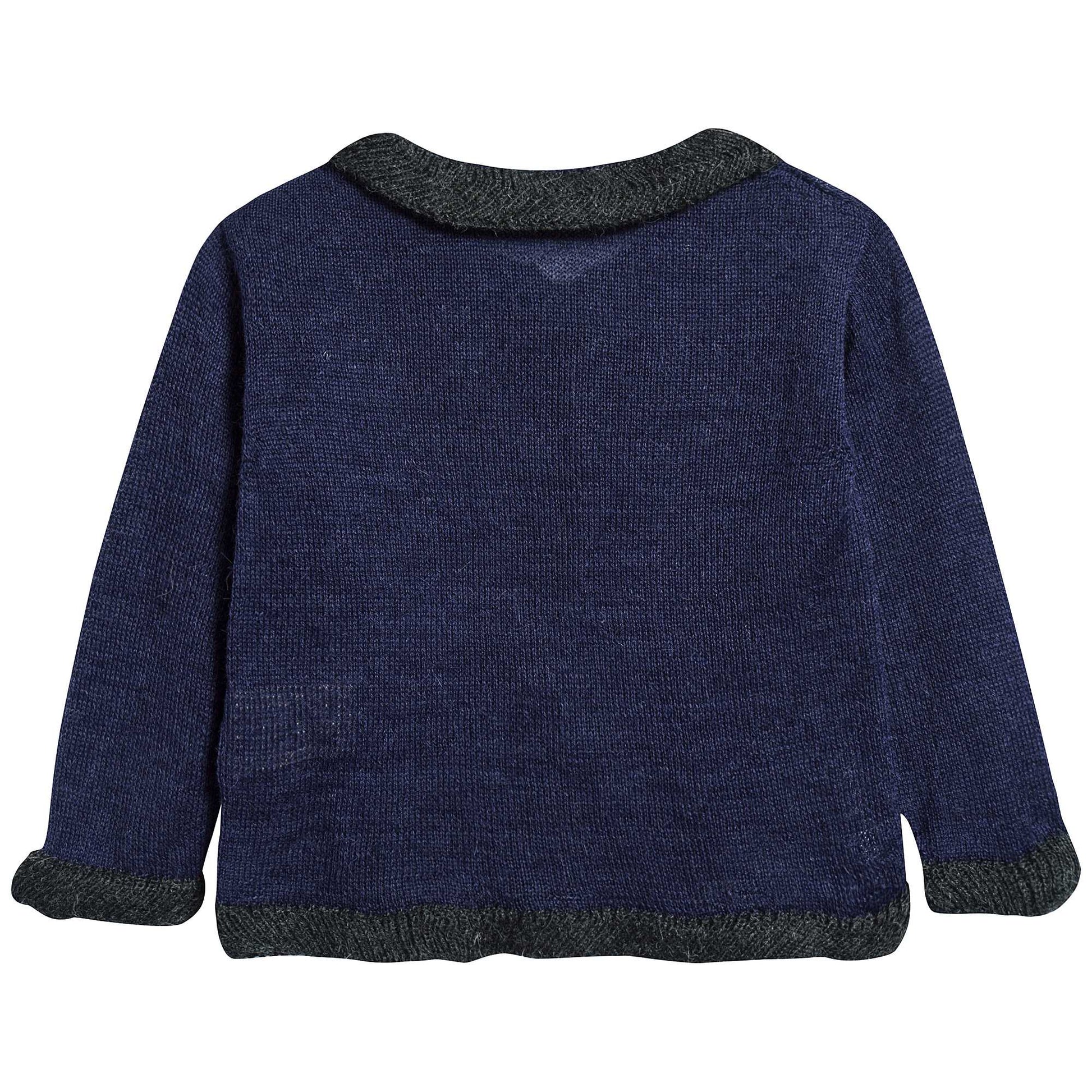 男宝宝海军蓝羊驼毛针织衫,精致的婴儿开襟羊毛衫,100%小羊驼绒制造,领口、袖口和衣角有撞色设计装饰。