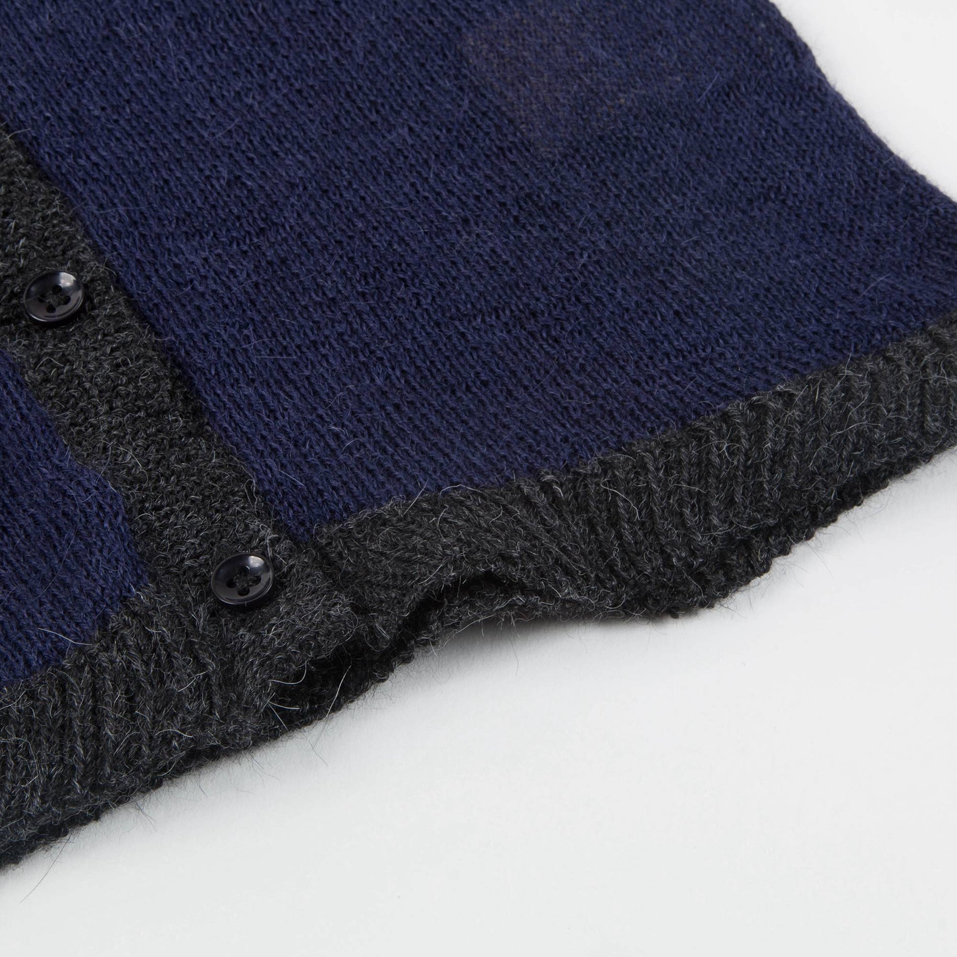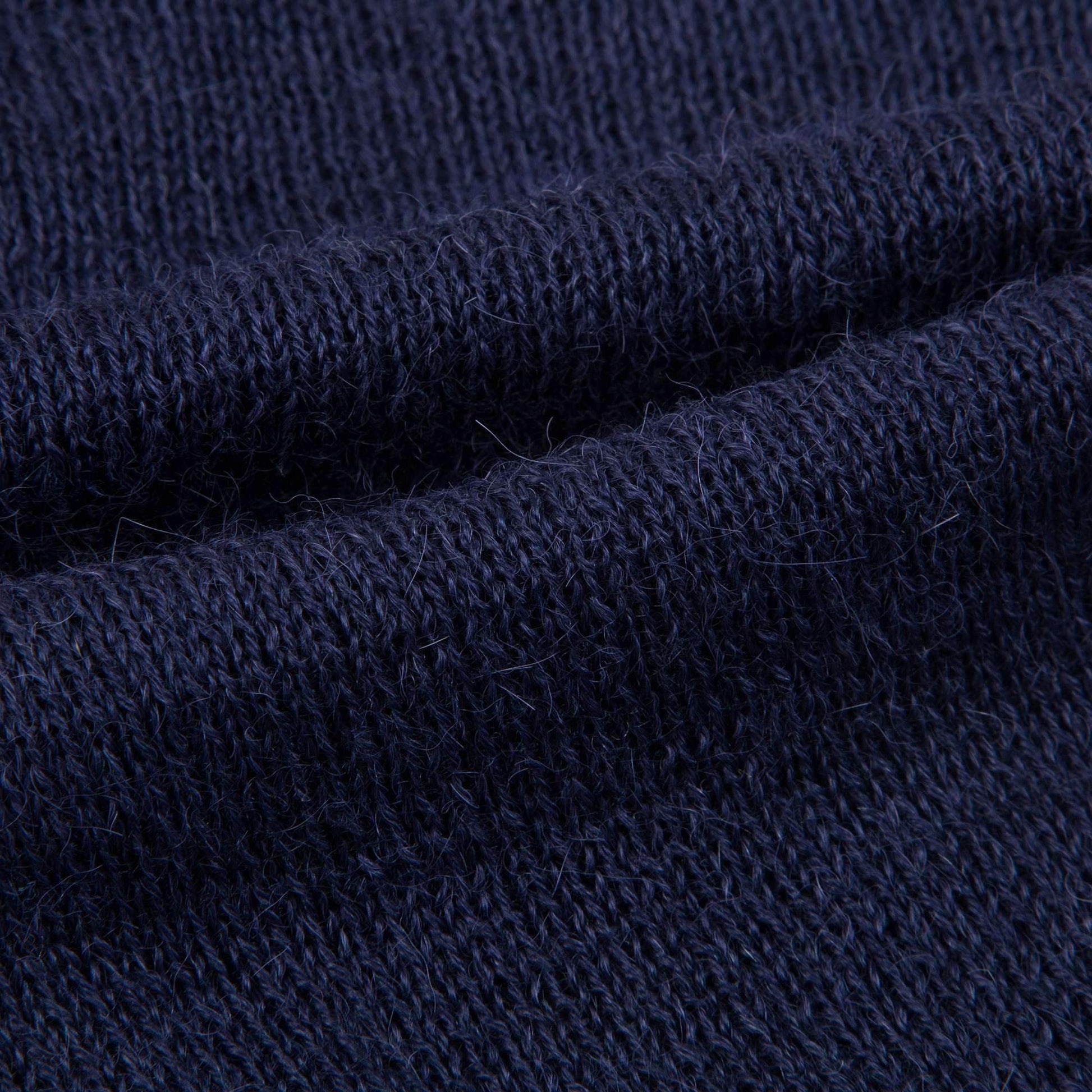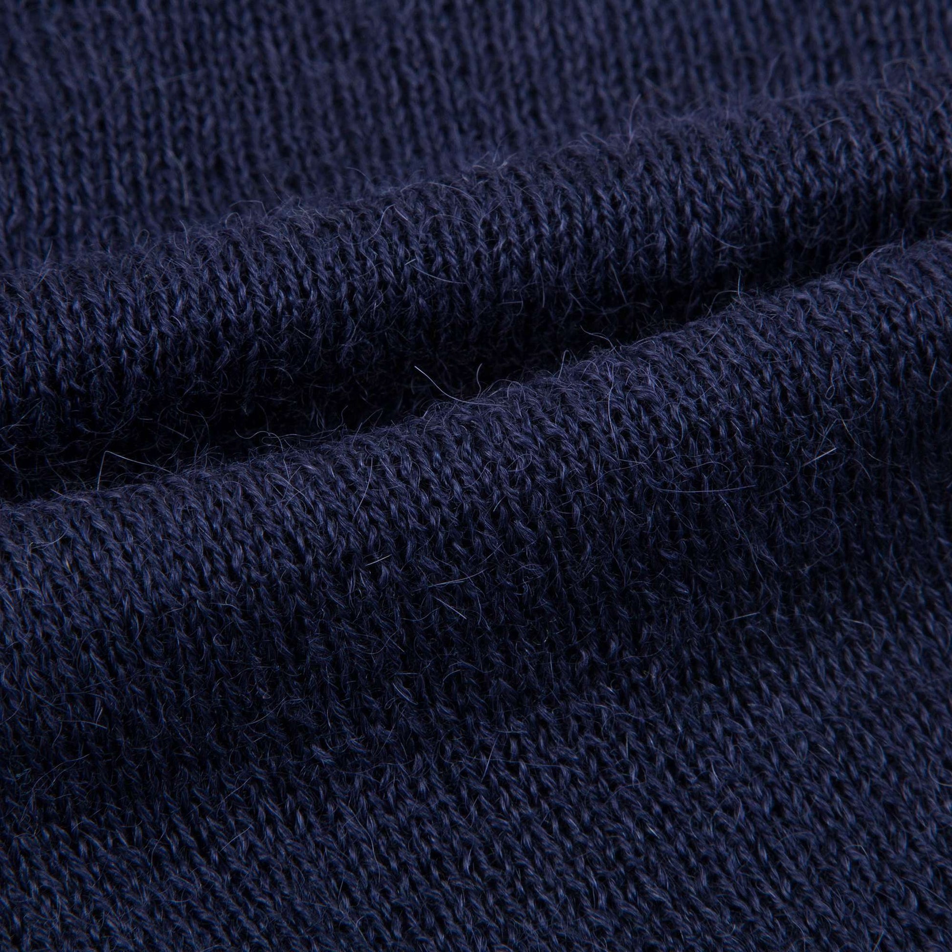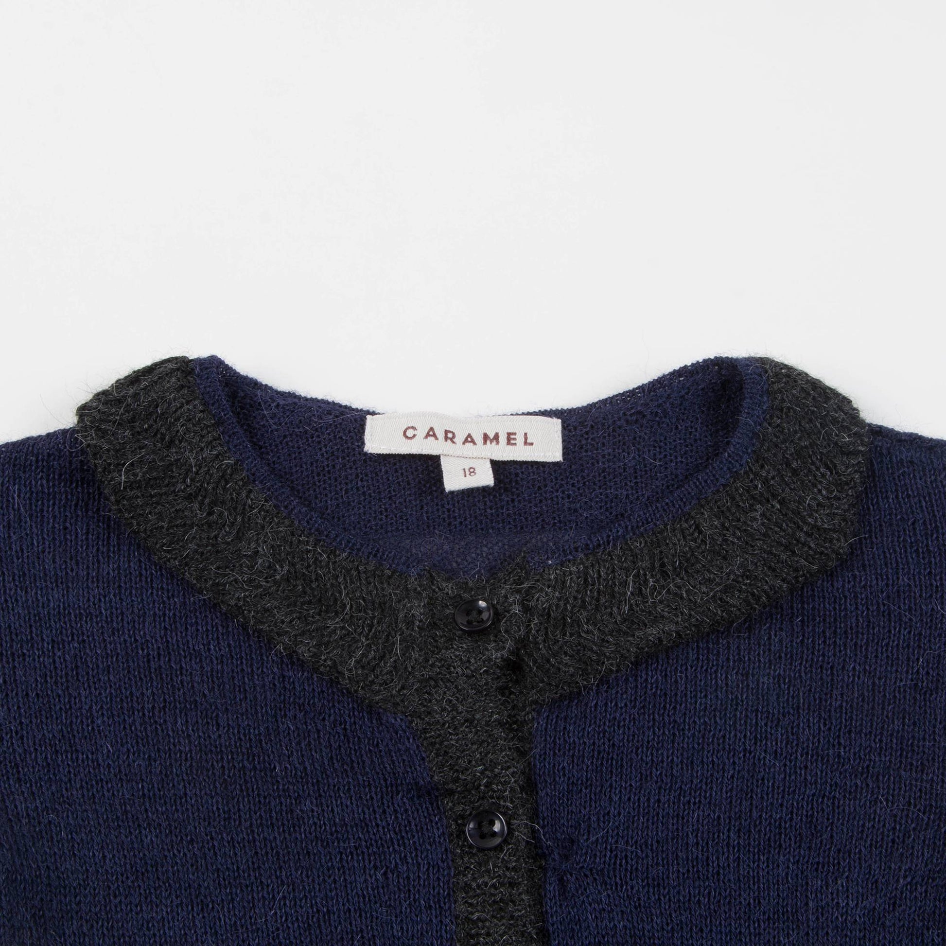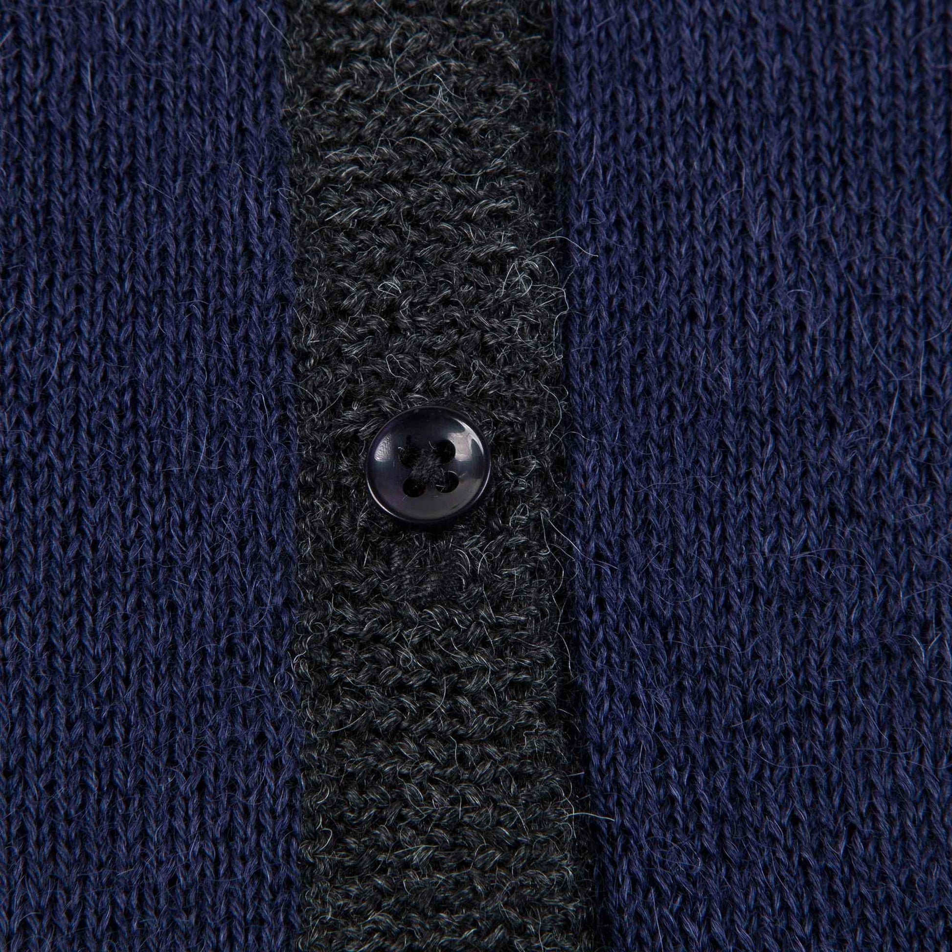 男宝宝海军蓝羊驼毛针织衫,精致的婴儿开襟羊毛衫,100%小羊驼绒制造,领口、袖口和衣角有撞色设计装饰。