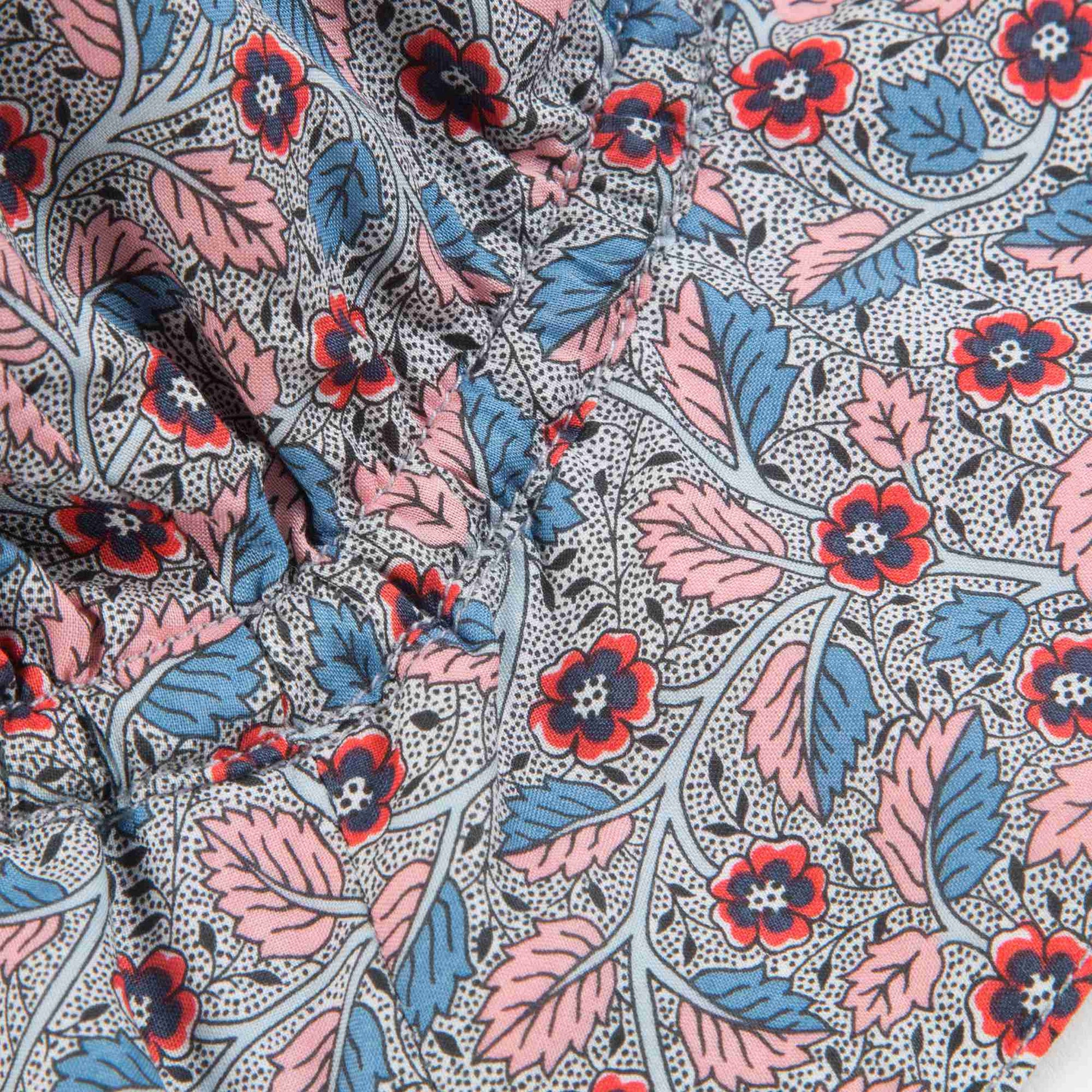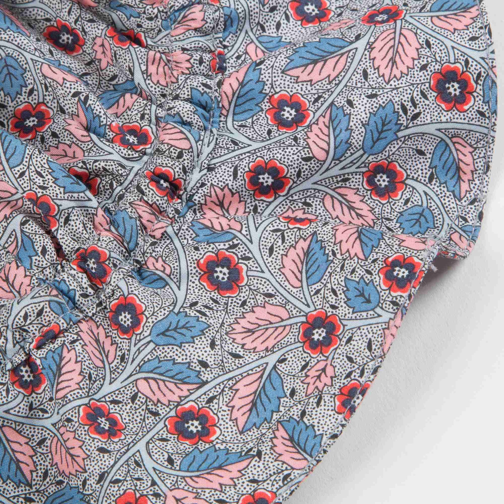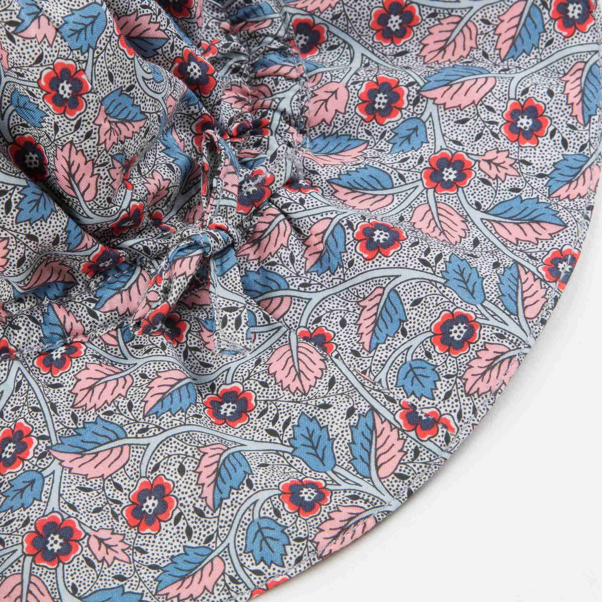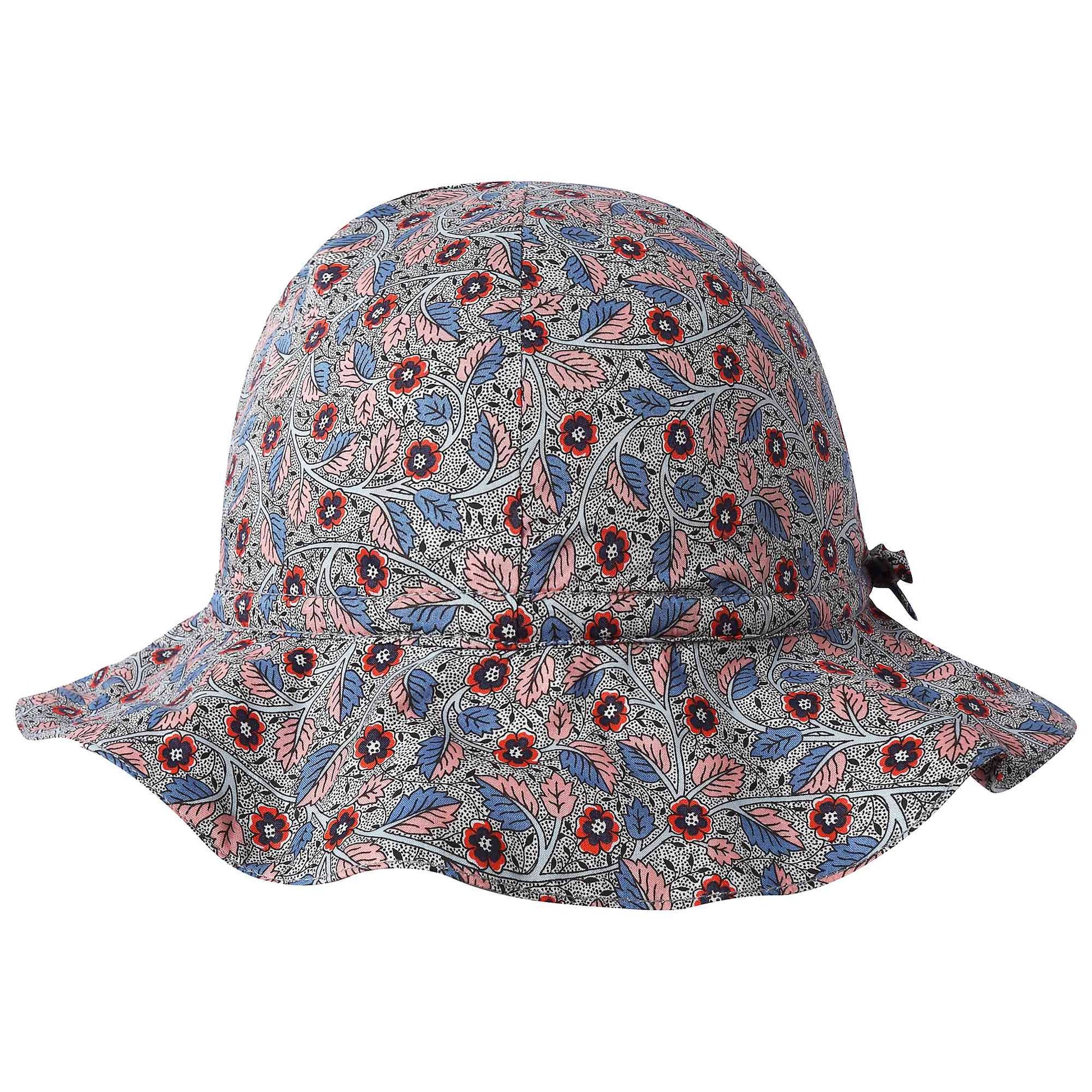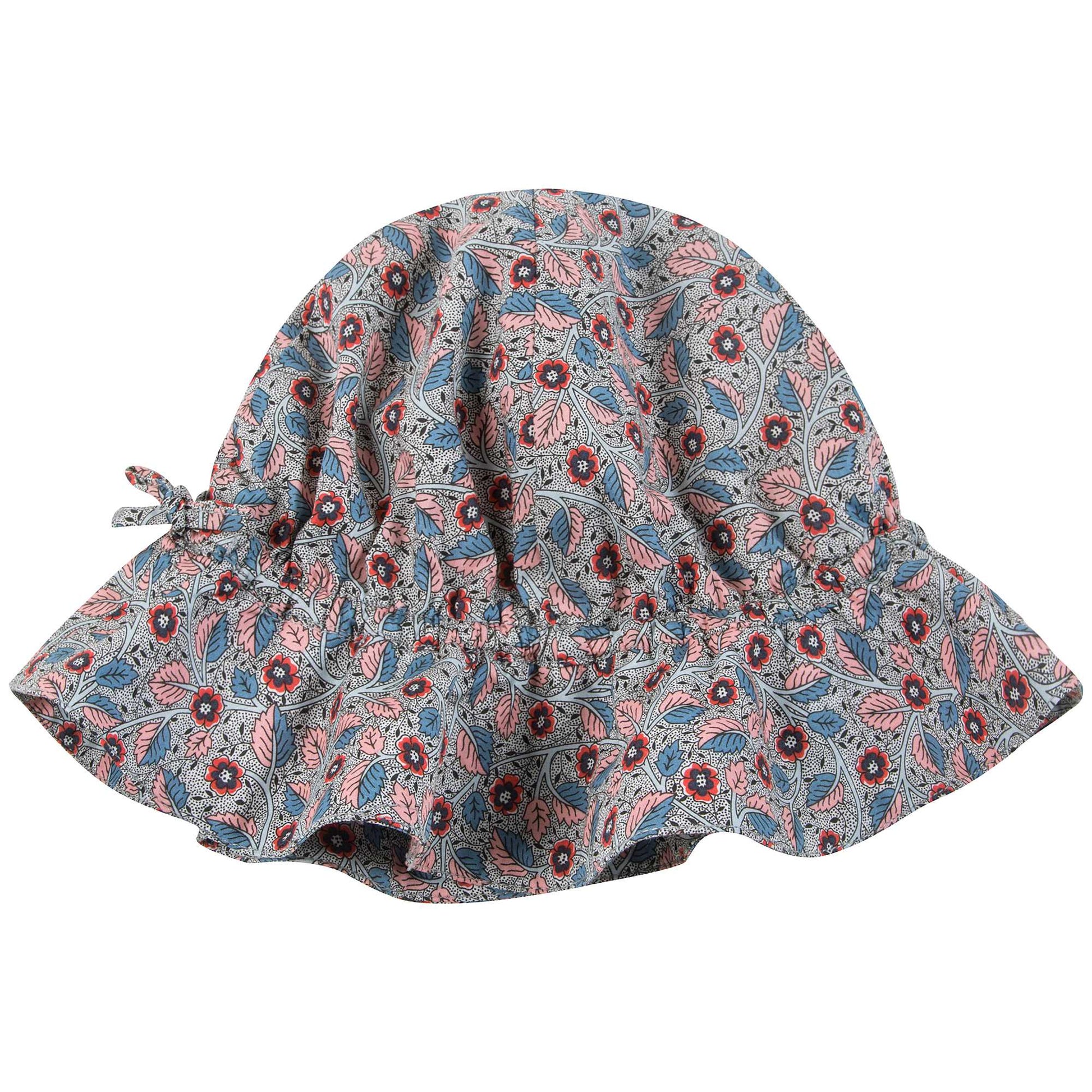 女宝宝碎花帽子,漂亮的荆棘印花图案,波浪形的宽边可以有效遮挡阳光。帽子有一个松紧的拉绳,可以帮助固定。