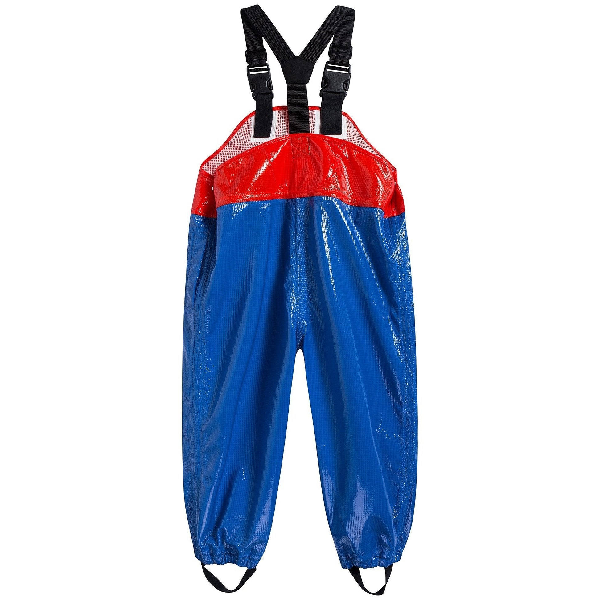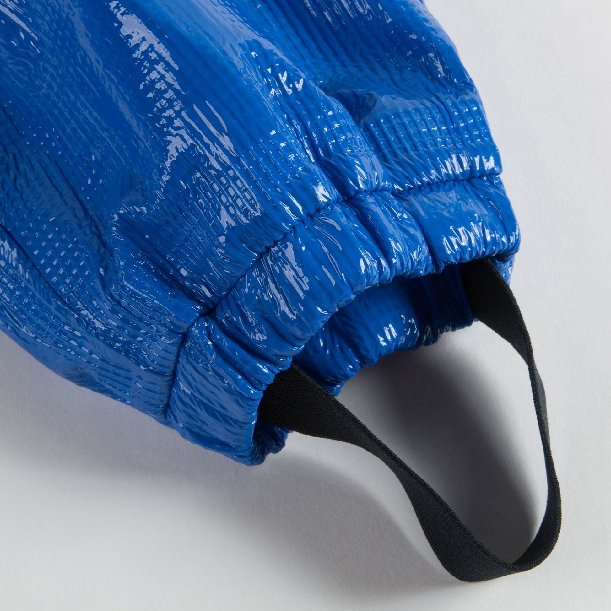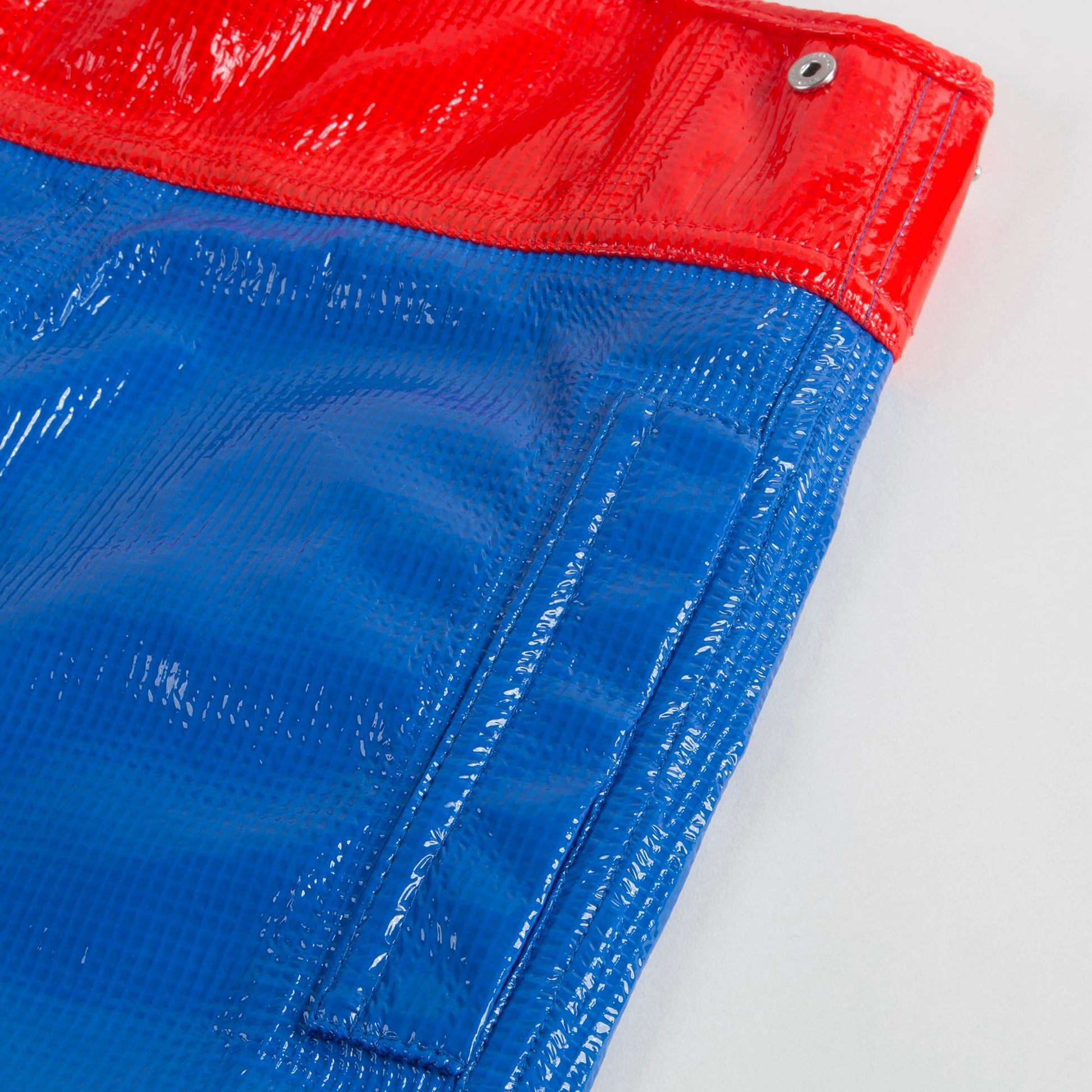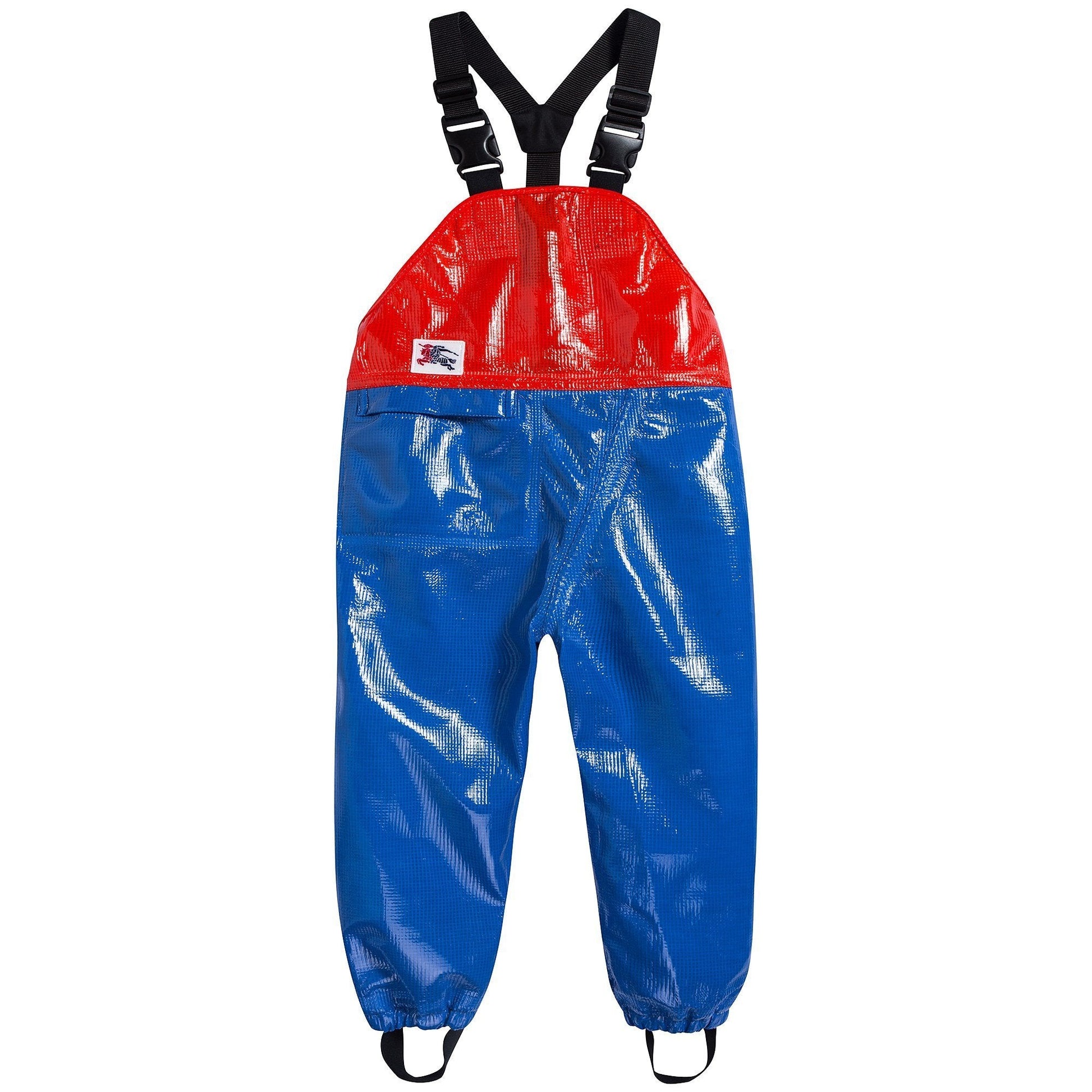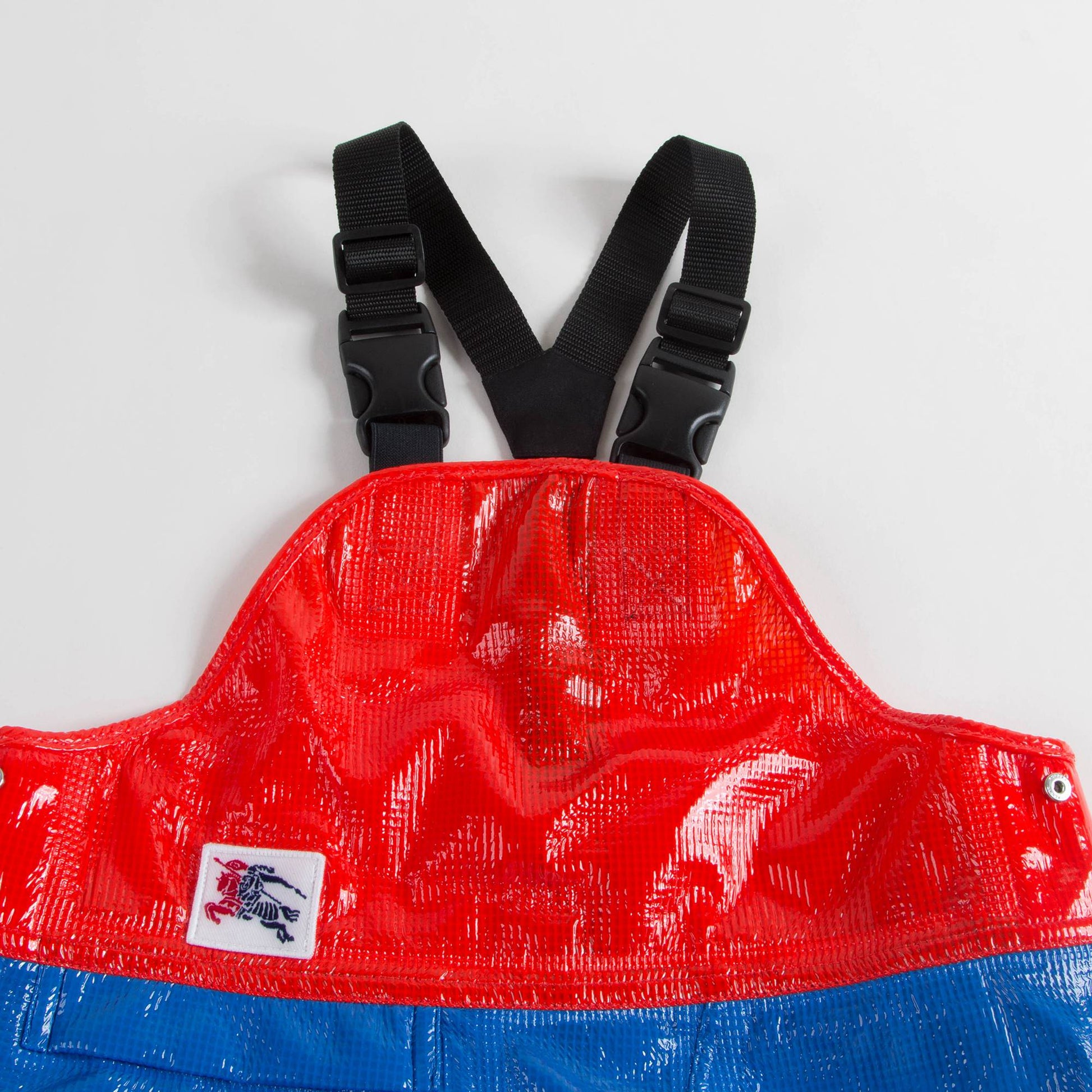 红蓝撞色背带裤,合扣式背带和裤脚蹬带,方便穿着。亮面材质设计让搭配更显街头潮流风格。