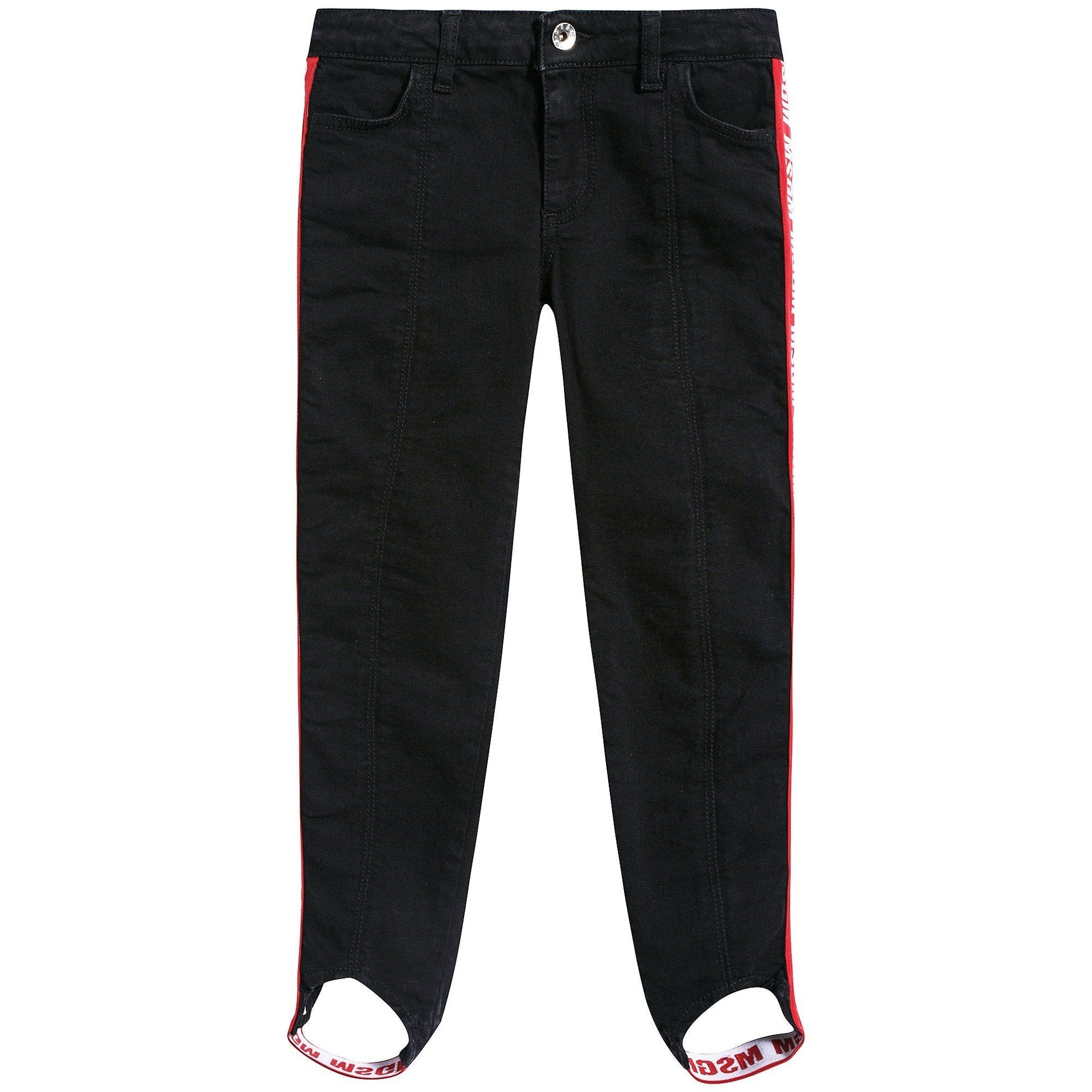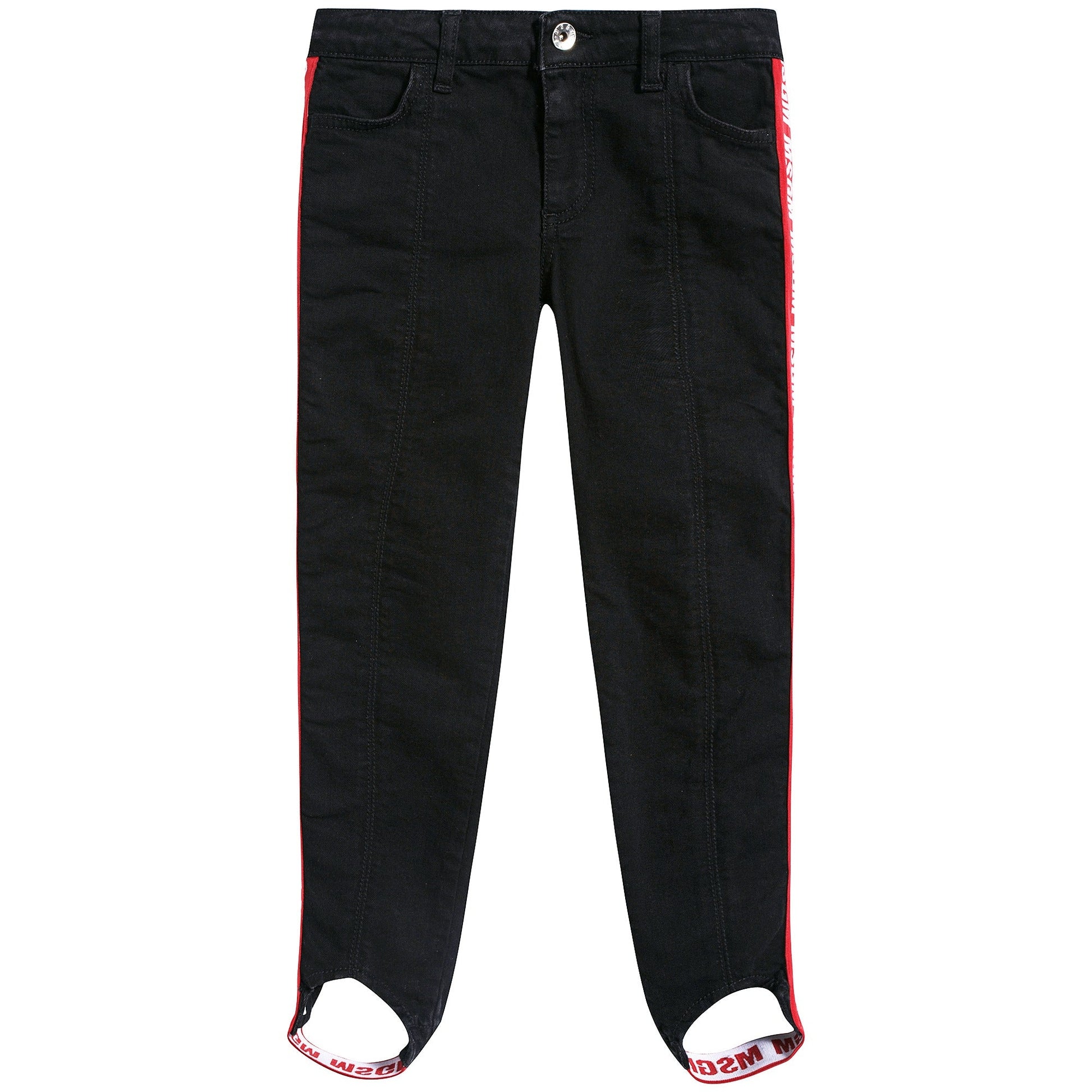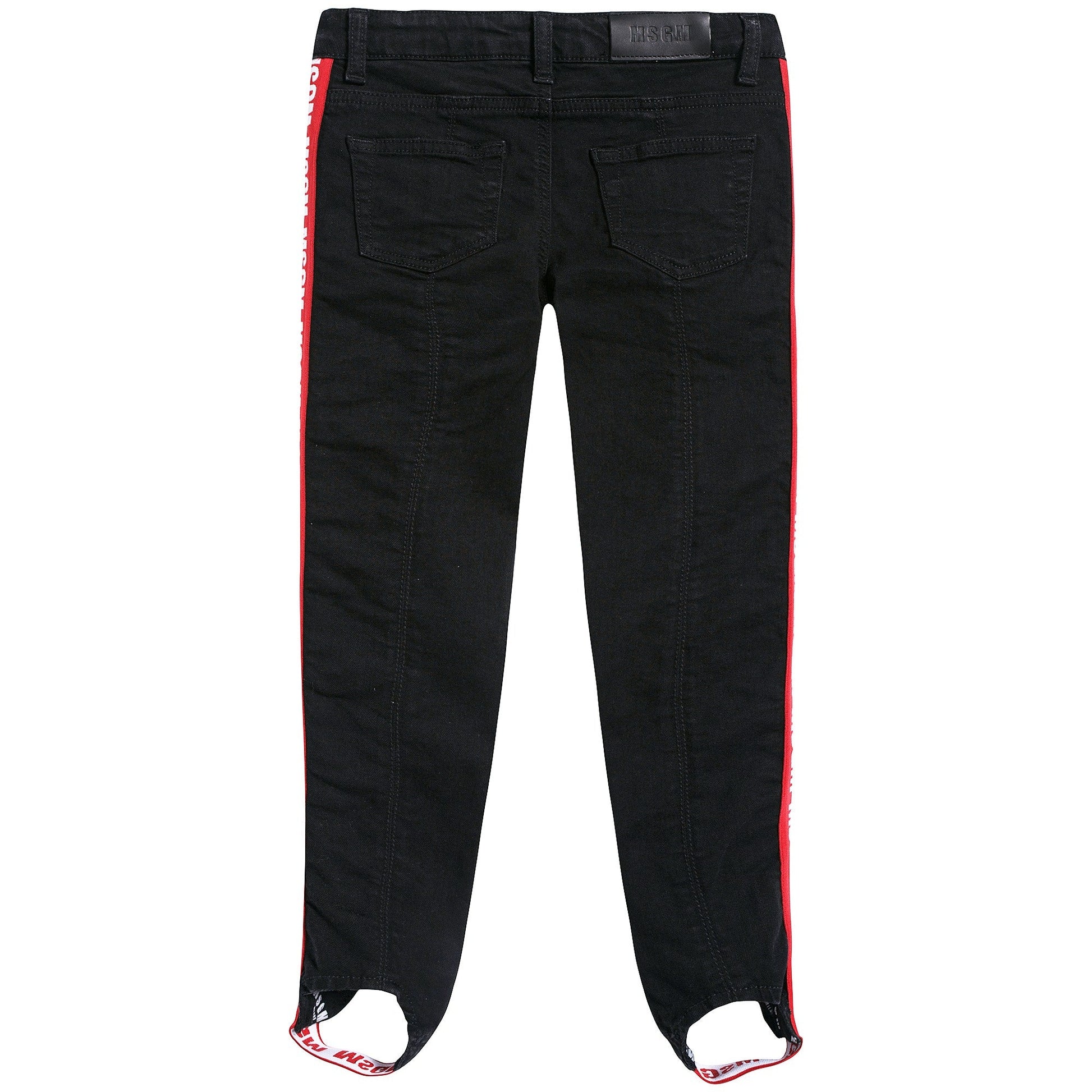 这款女童黑色紧身裤采用柔软弹性棉质平纹针织面料制成,踝部袖口饰有松紧带状马镫,两侧饰有红白色LOGO条纹。