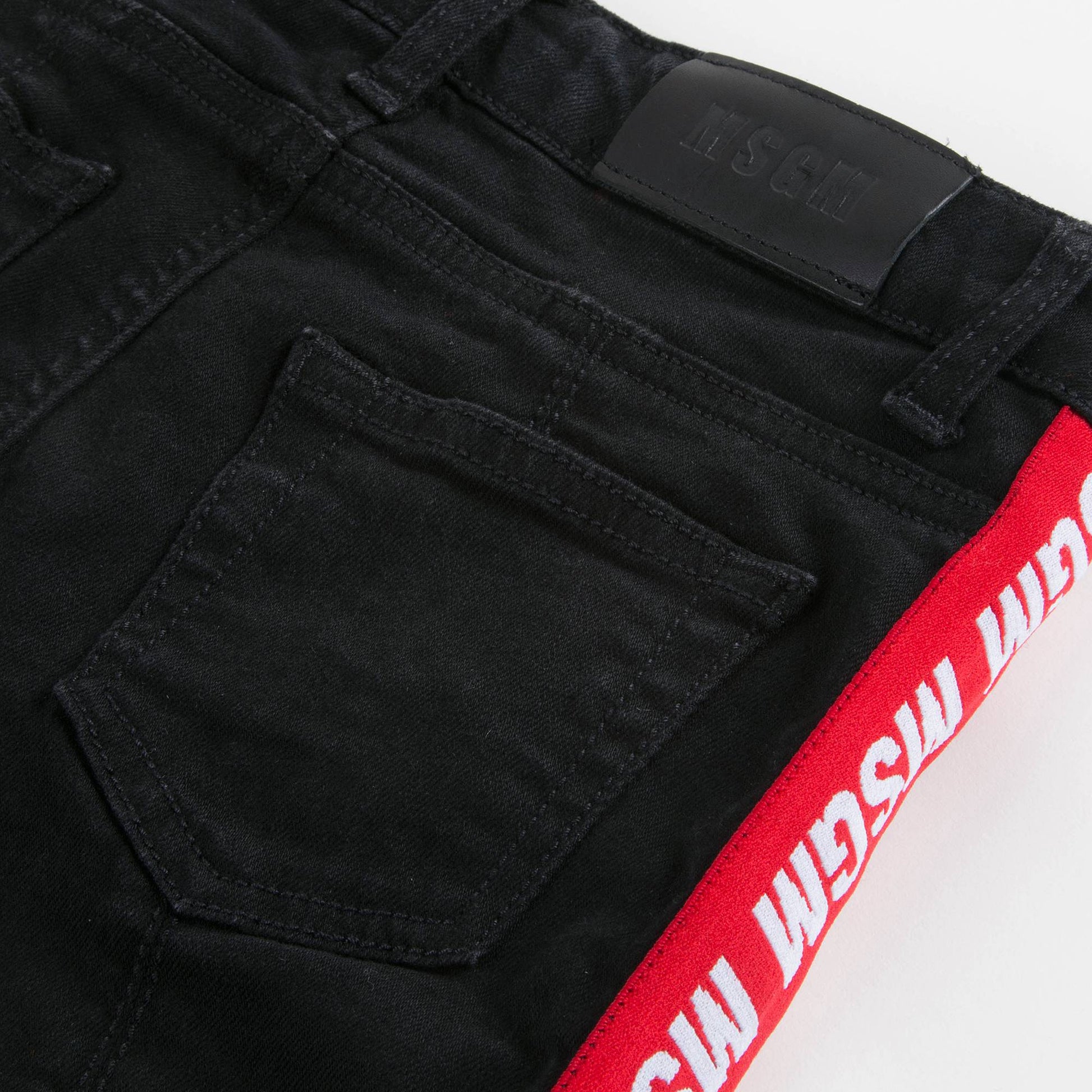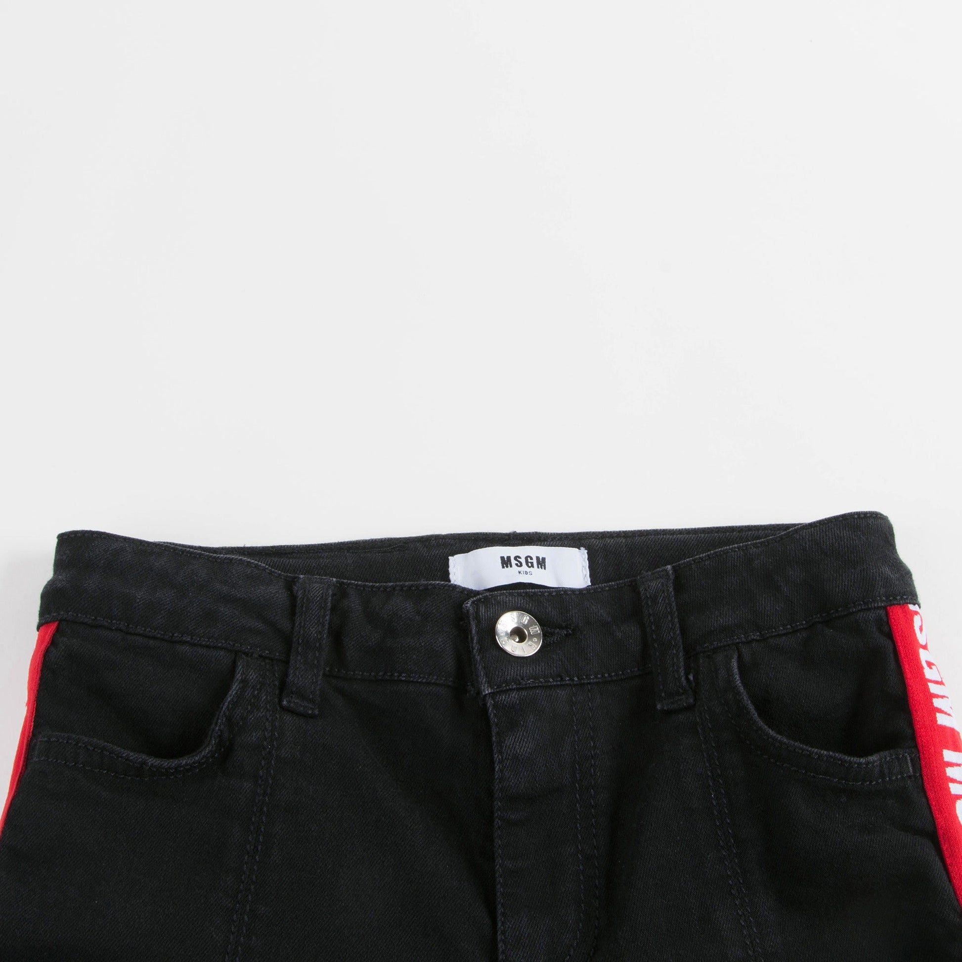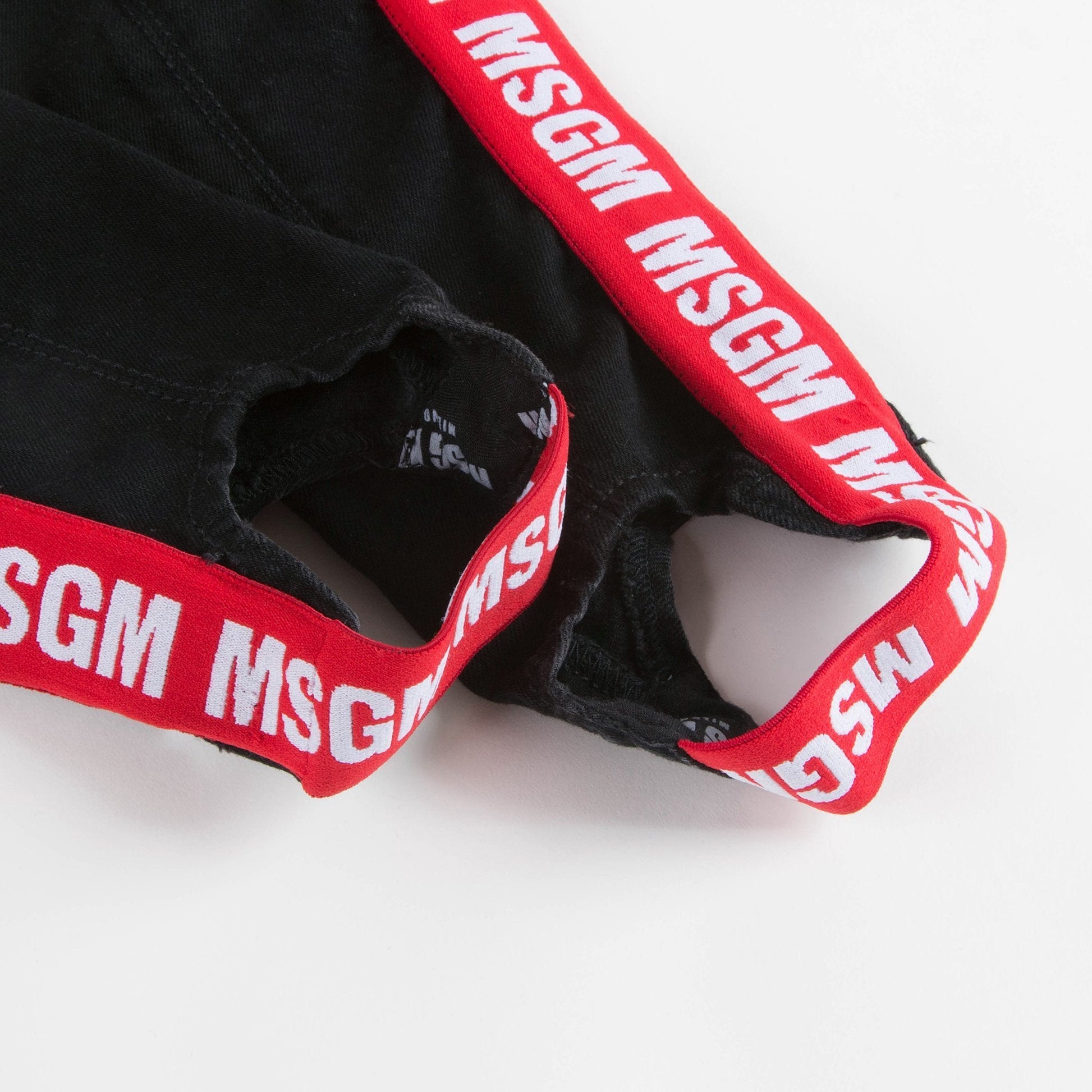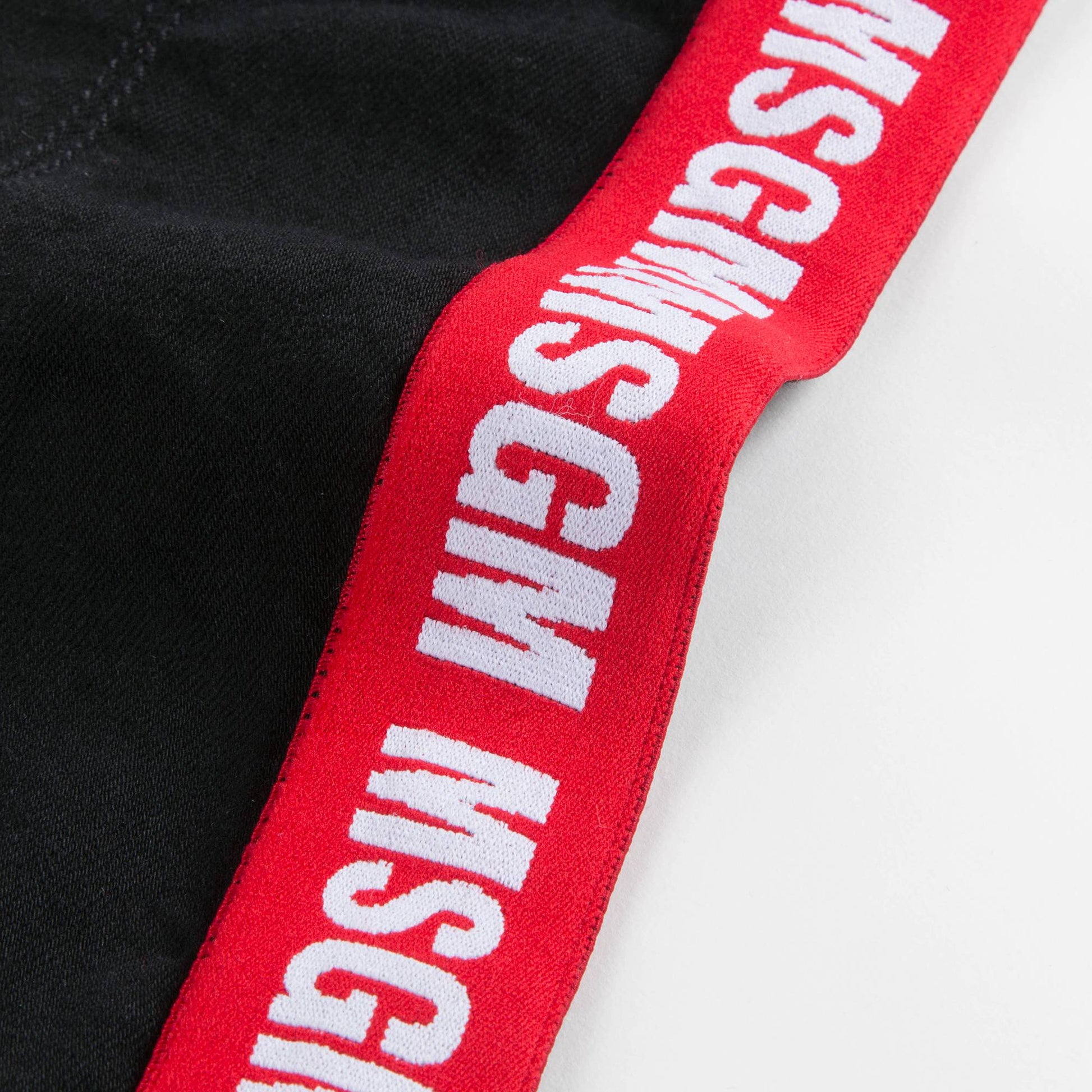 这款女童黑色紧身裤采用柔软弹性棉质平纹针织面料制成,踝部袖口饰有松紧带状马镫,两侧饰有红白色LOGO条纹。