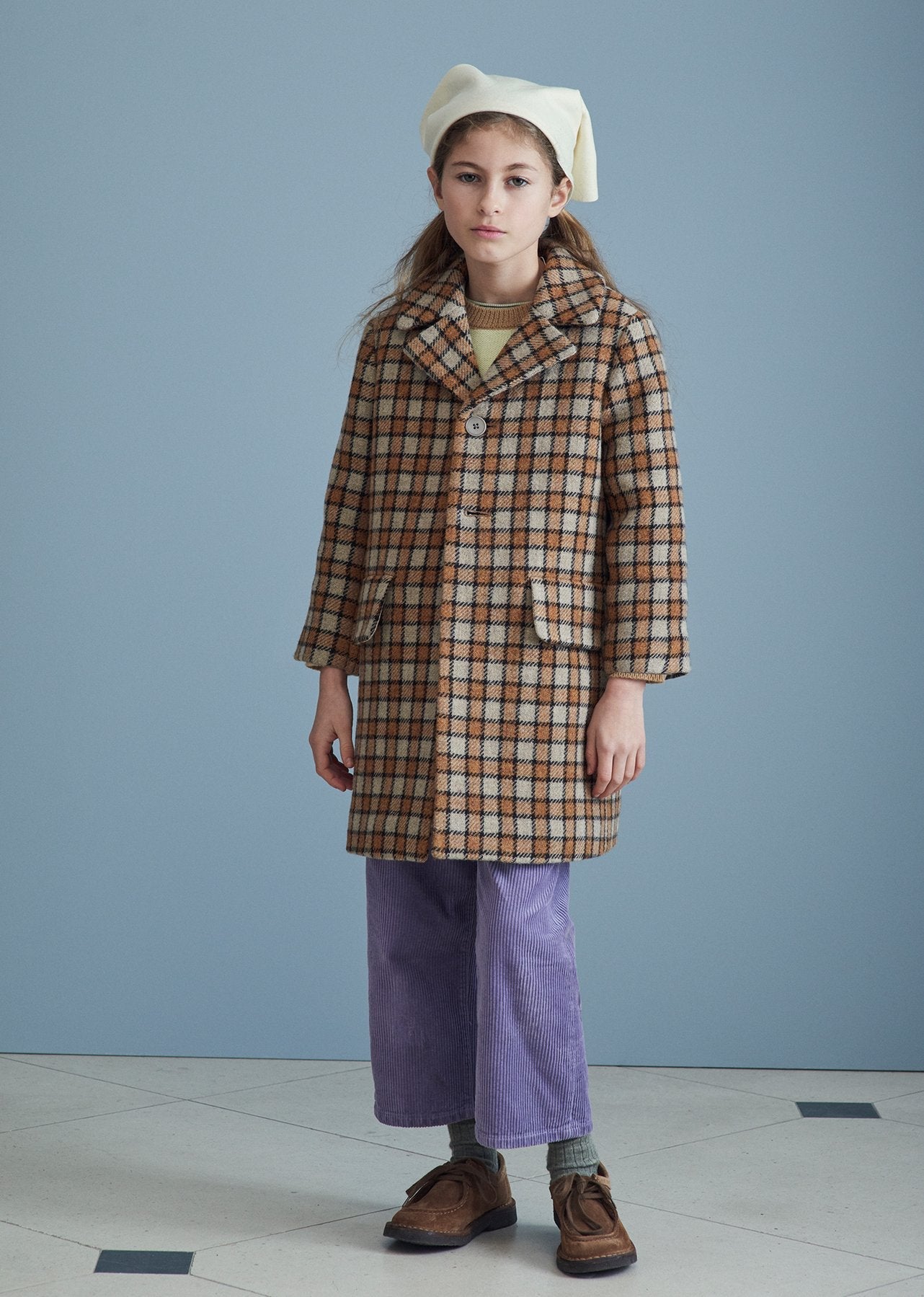 女童棕色格子羊毛外套