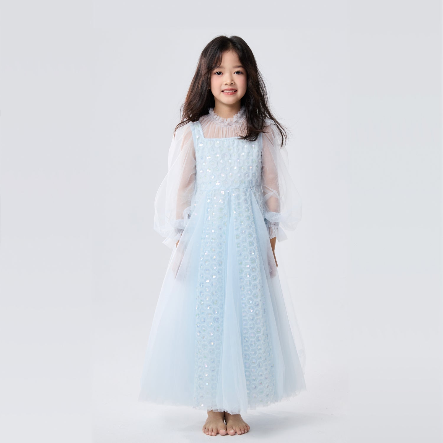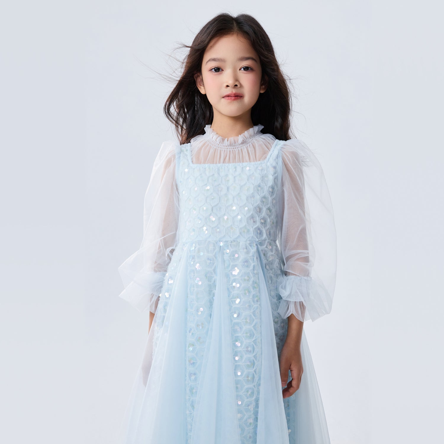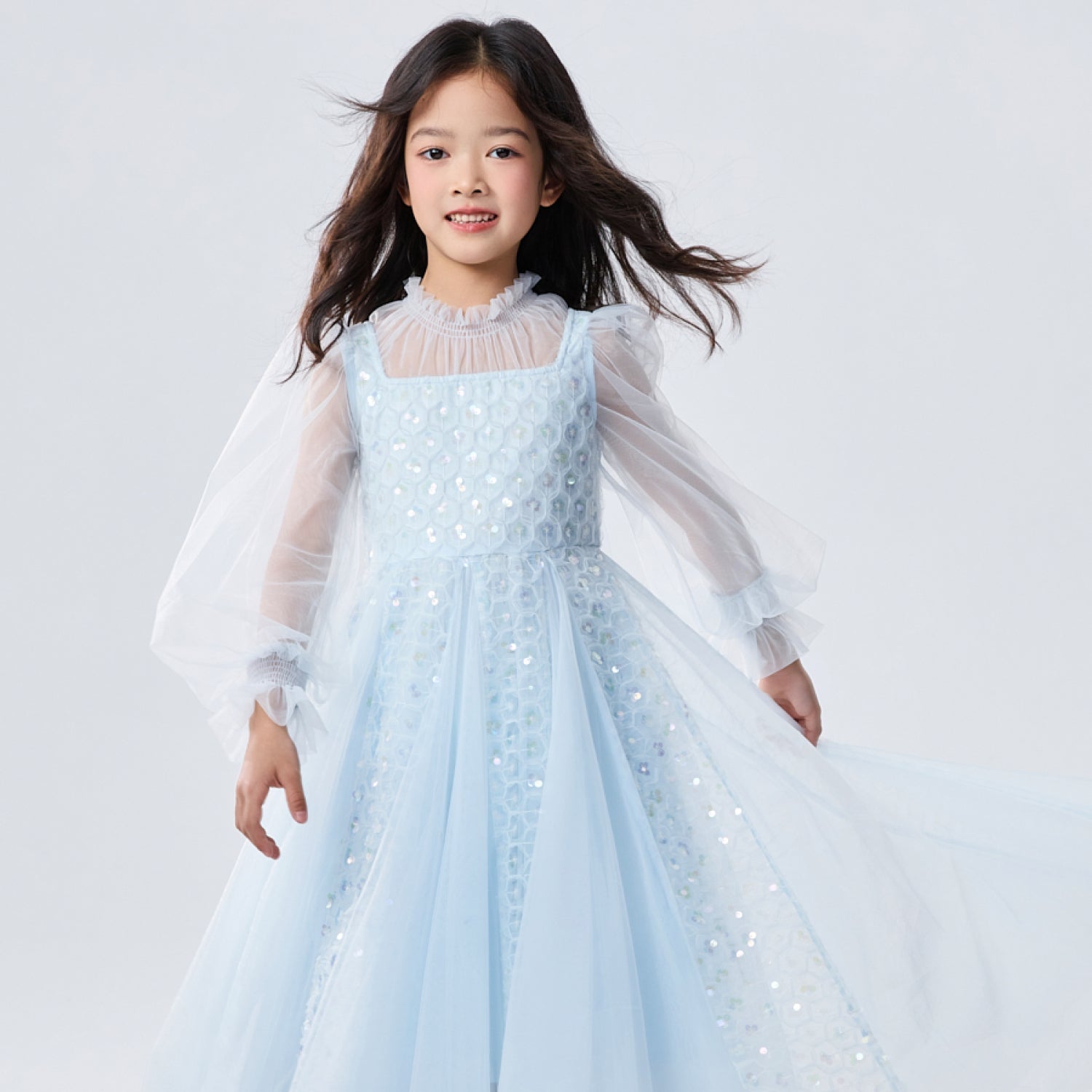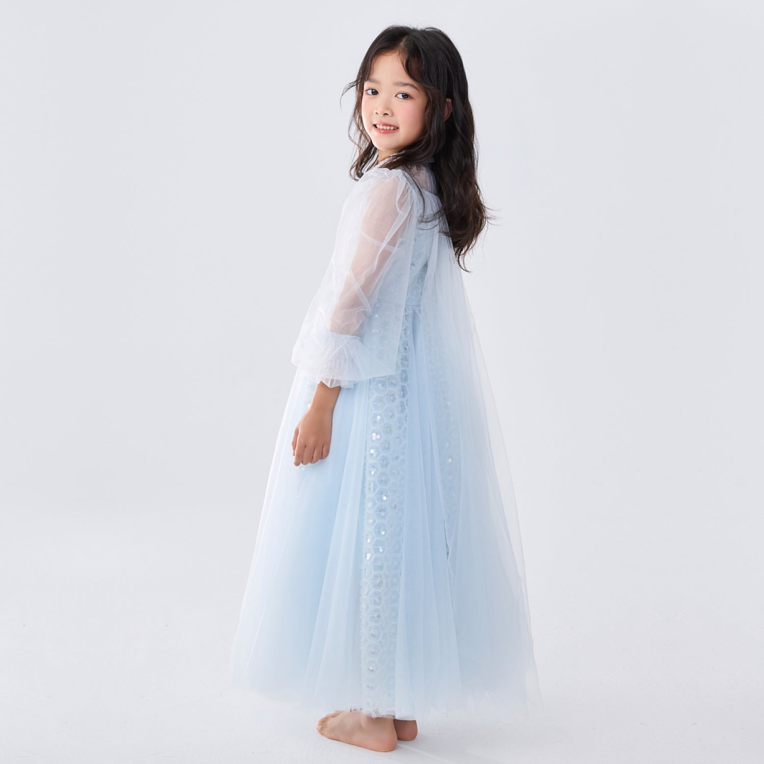 女童浅蓝色长纱袖冰雪公主裙