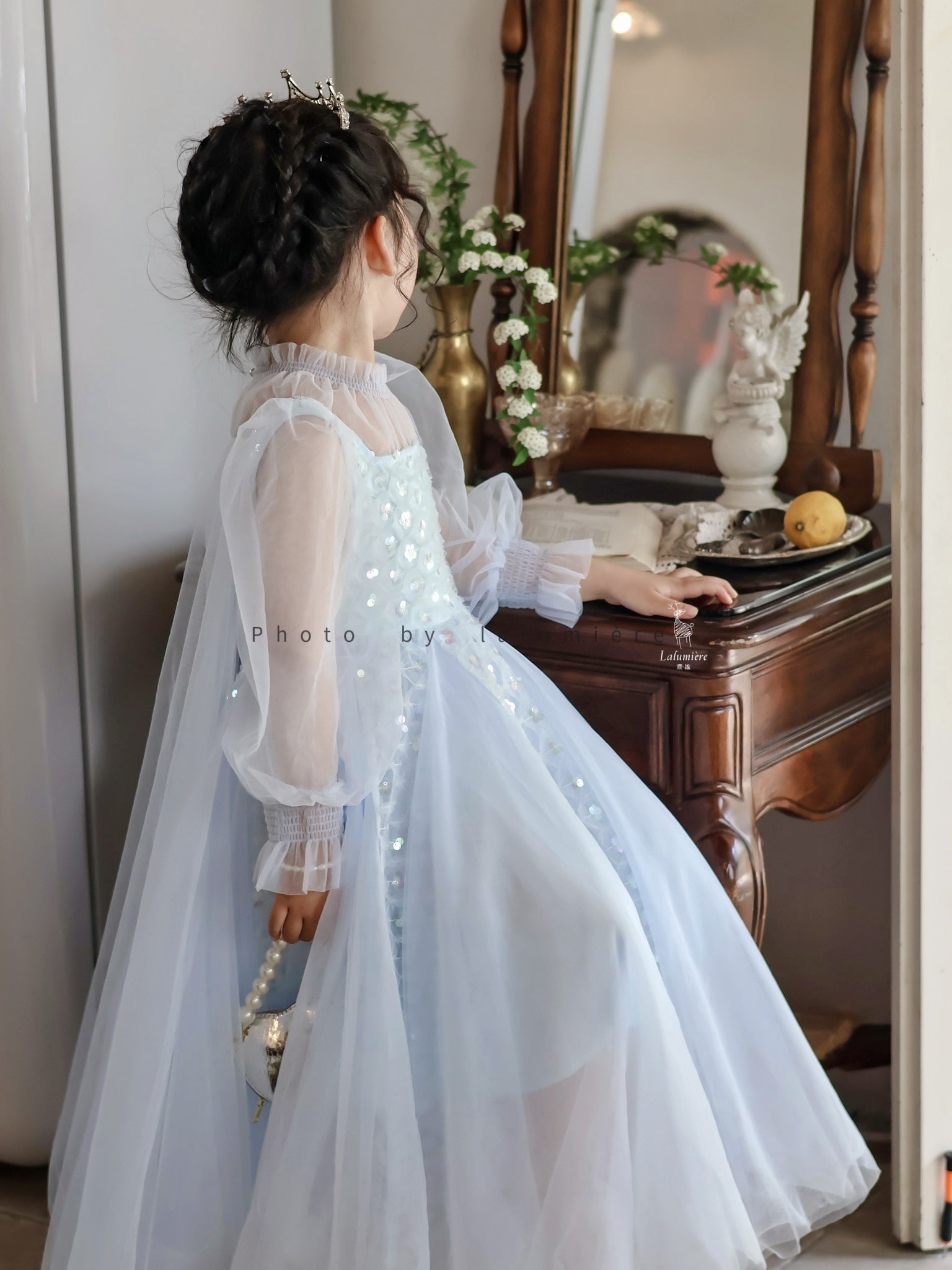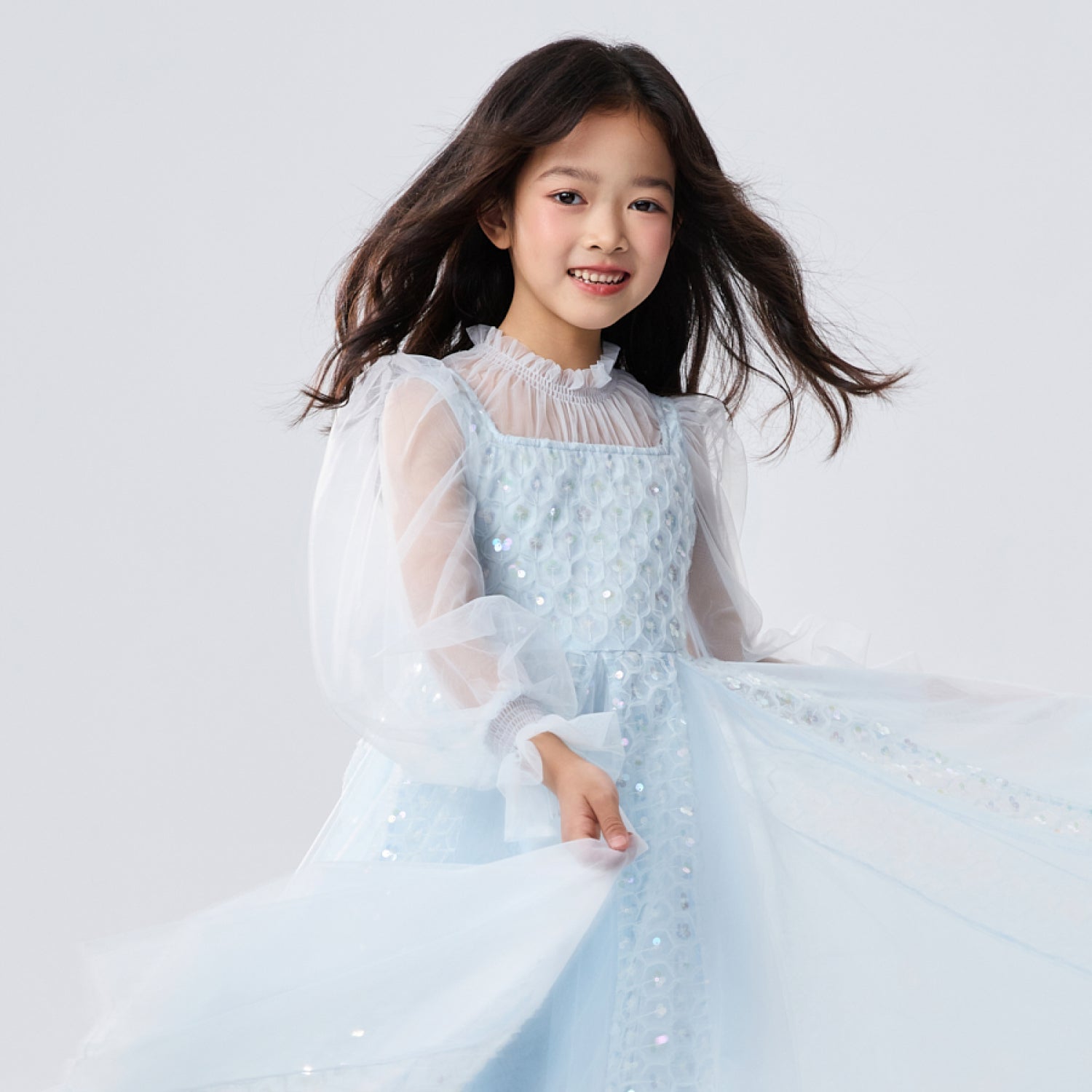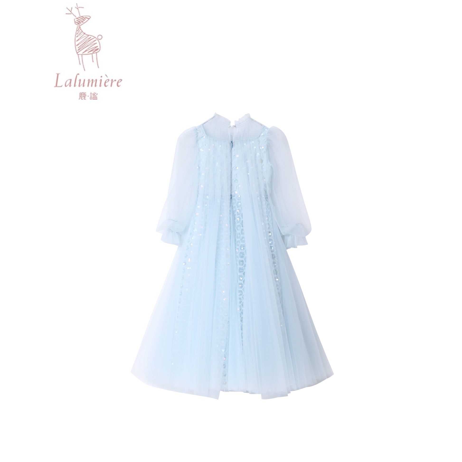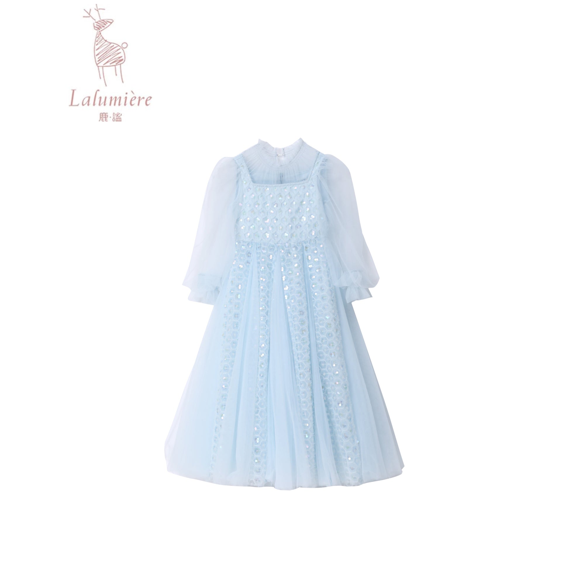 女童浅蓝色长纱袖冰雪公主裙