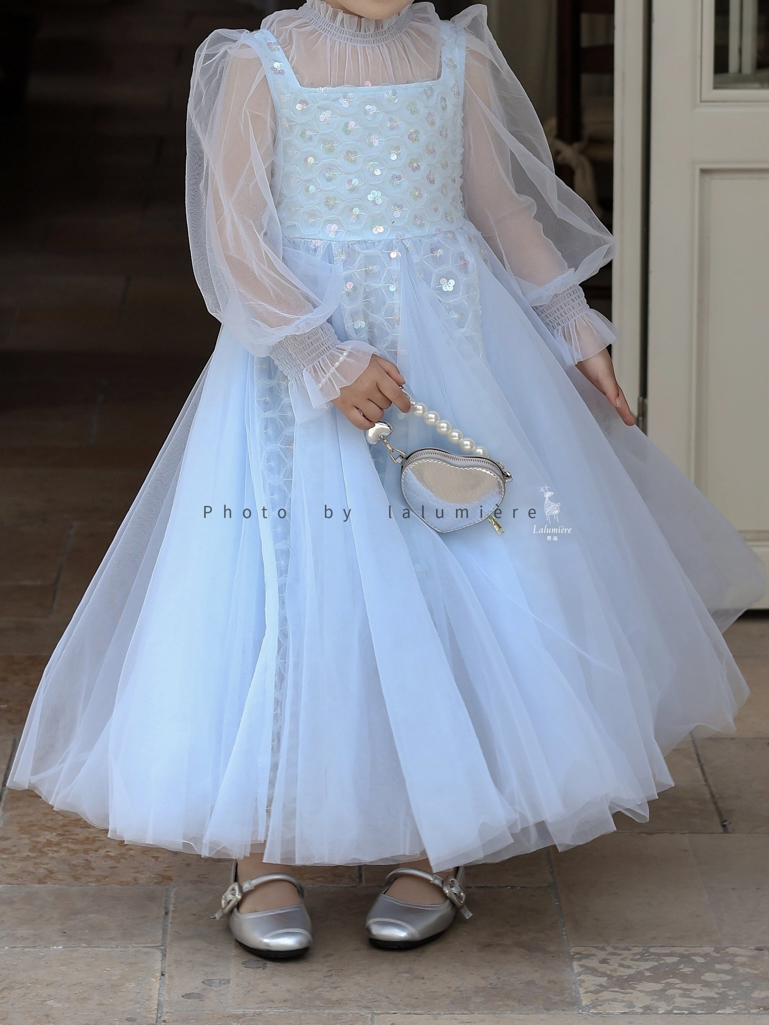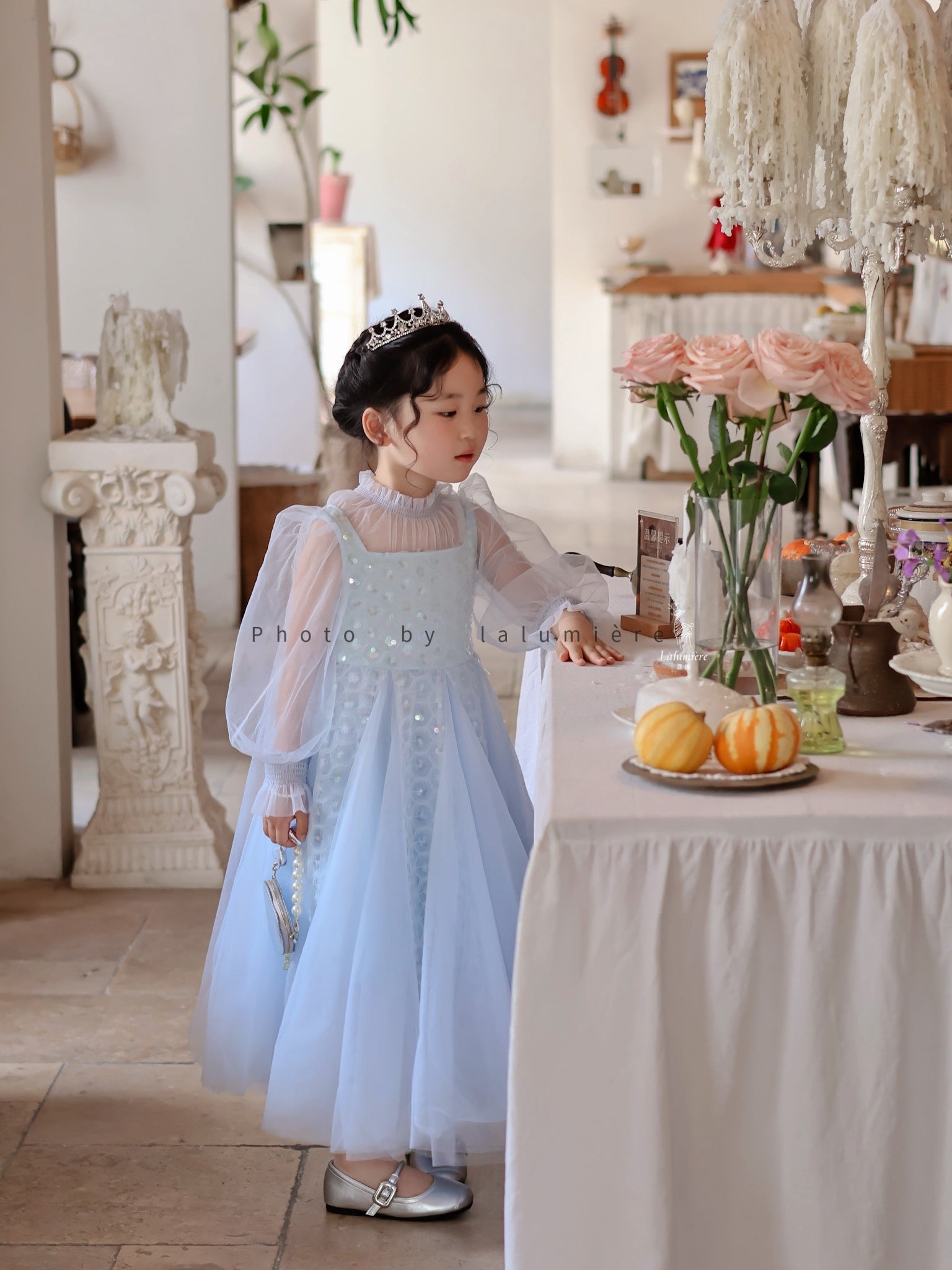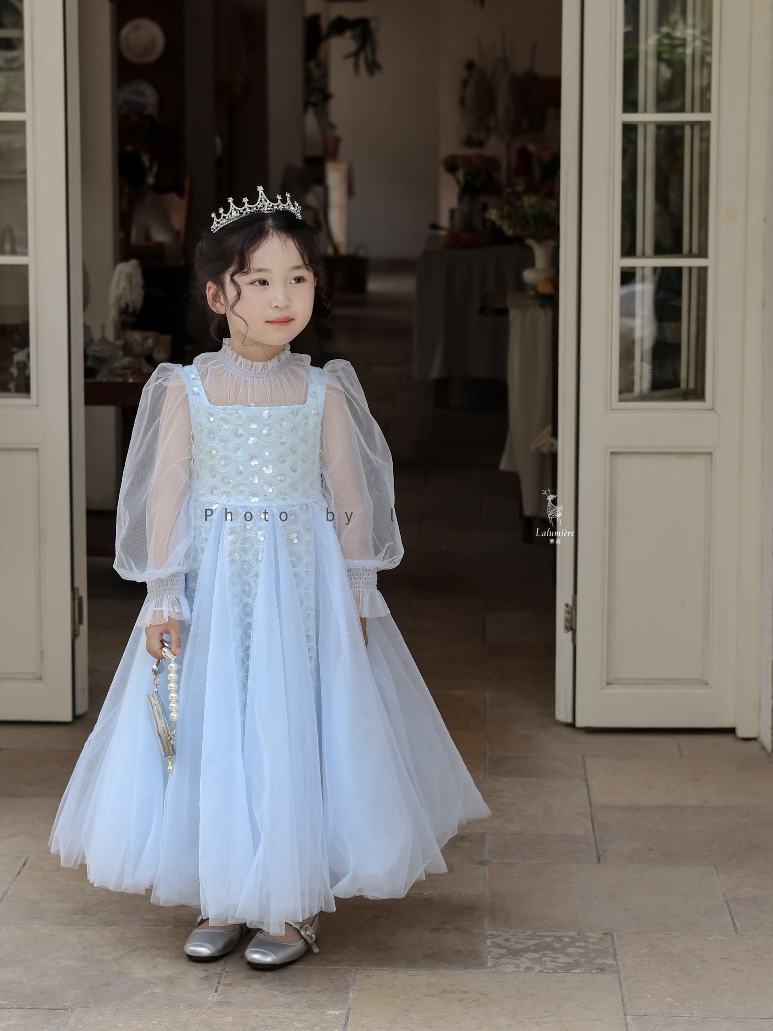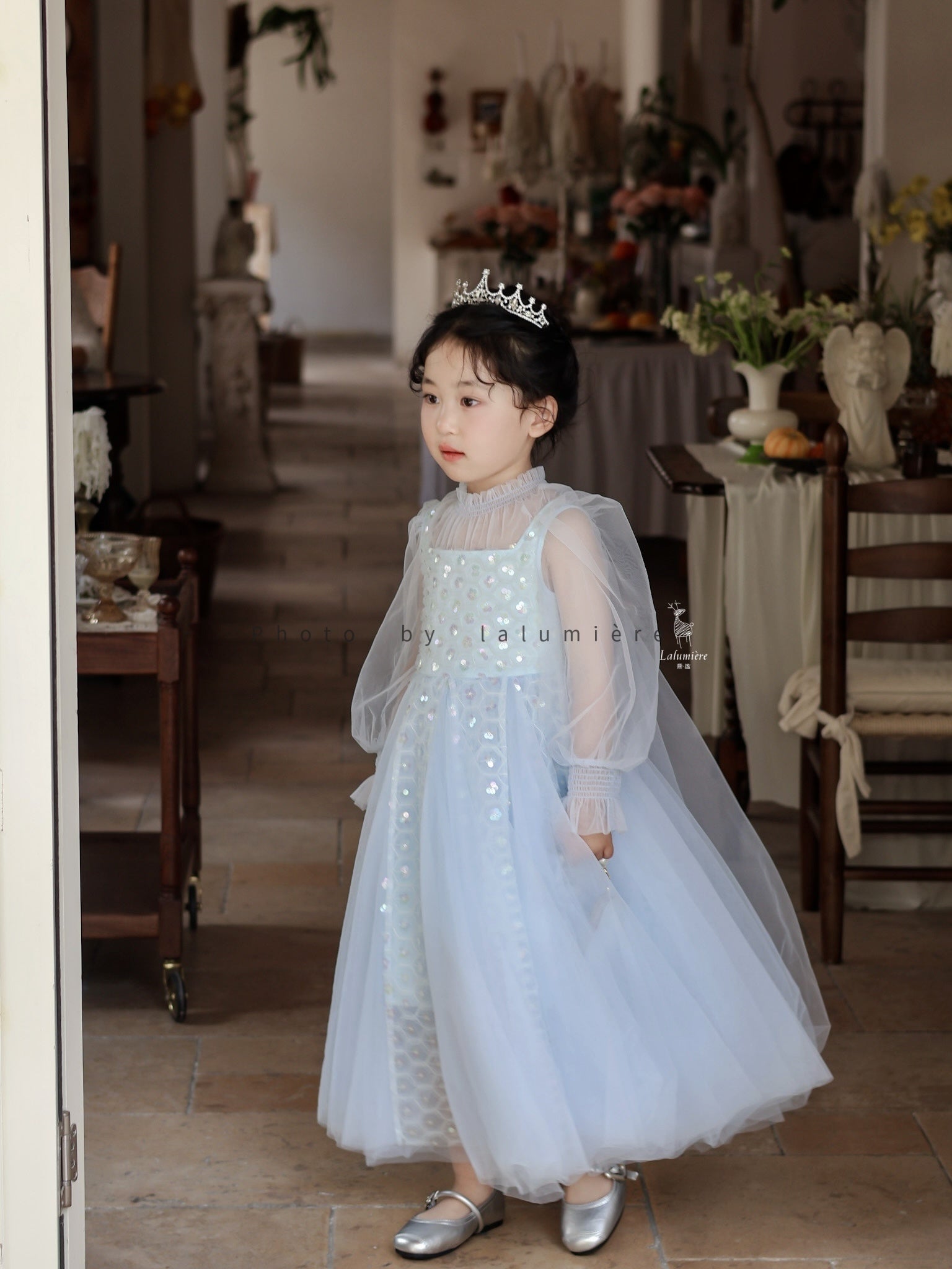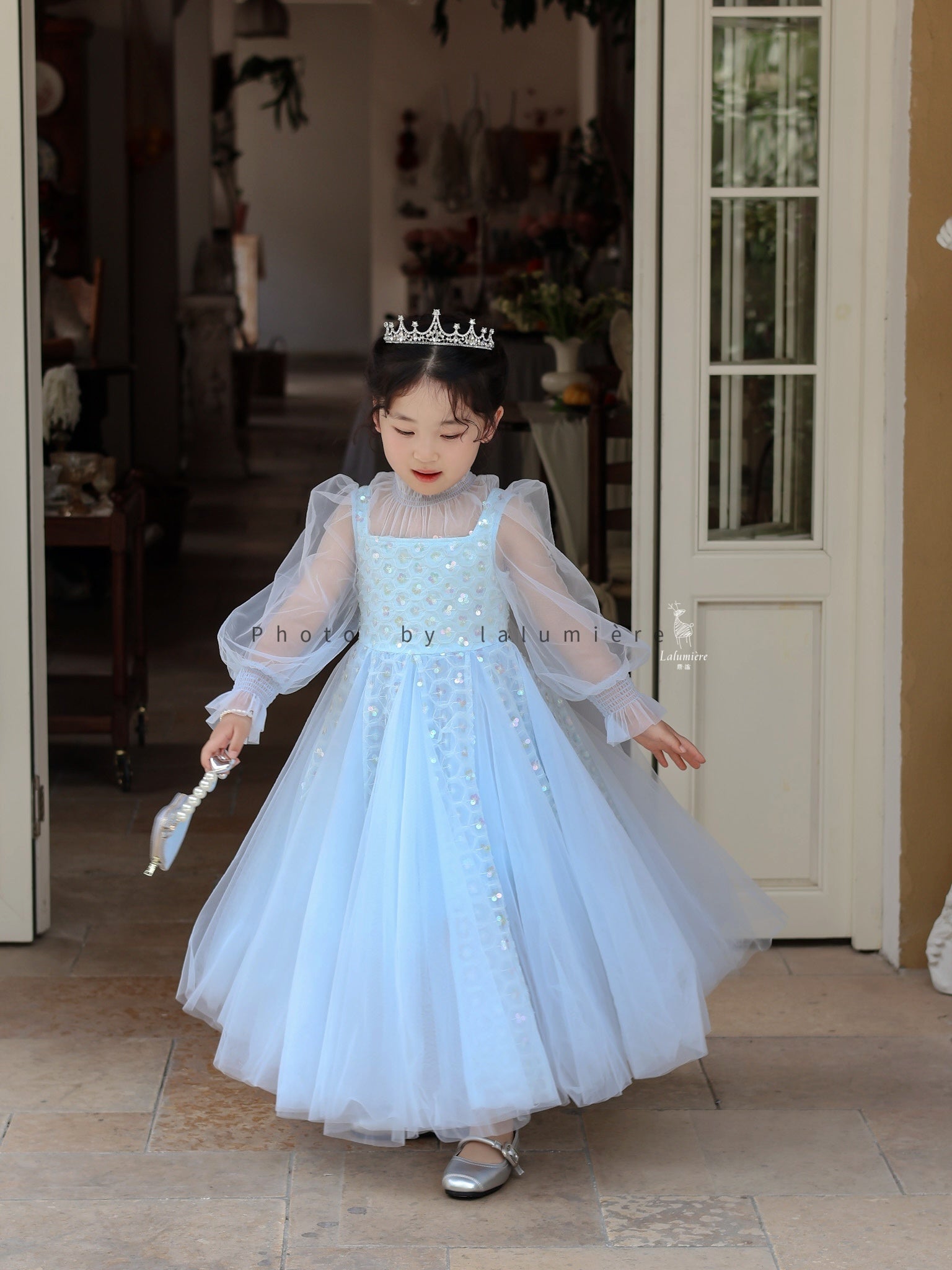 女童浅蓝色长纱袖冰雪公主裙