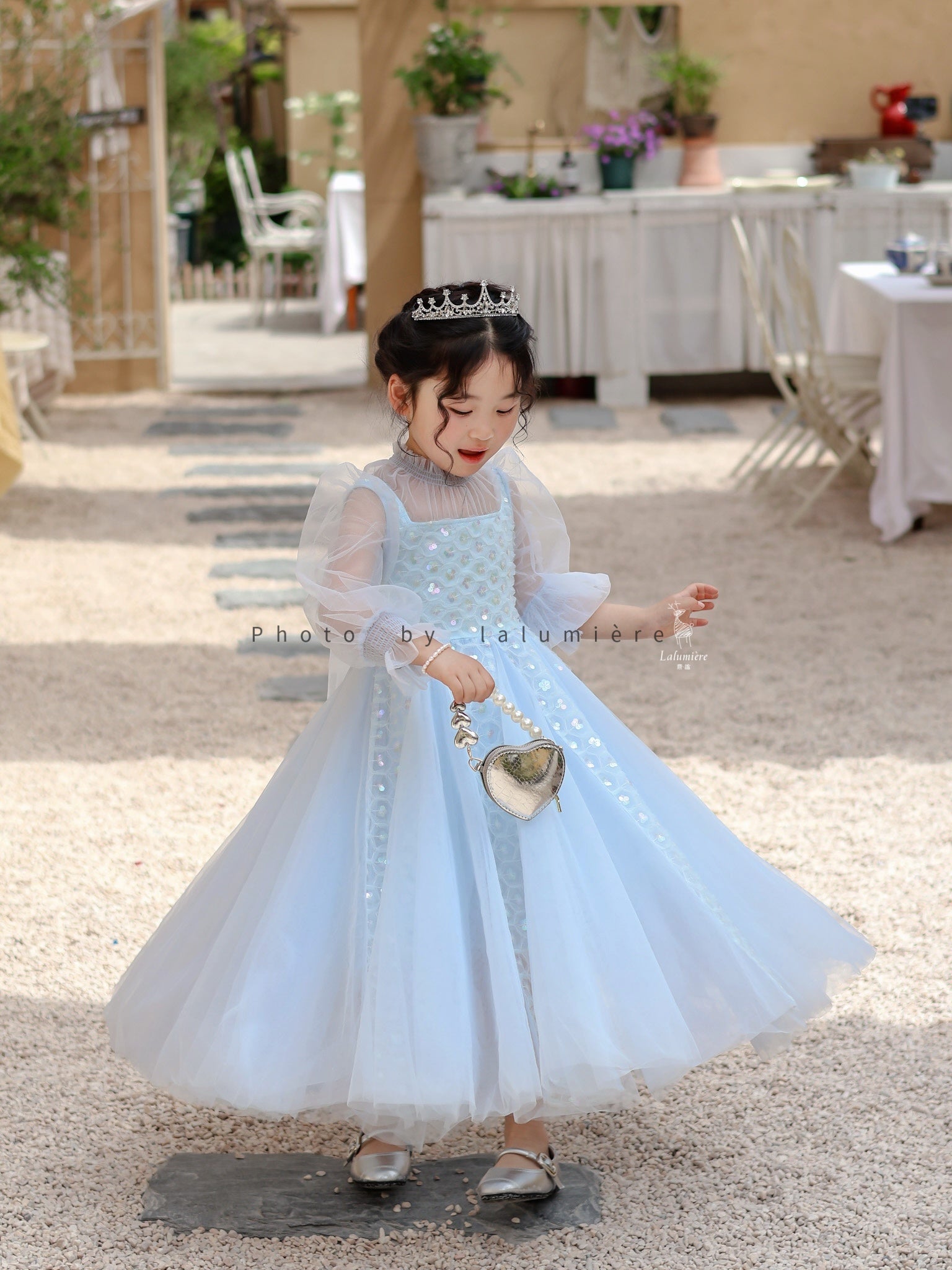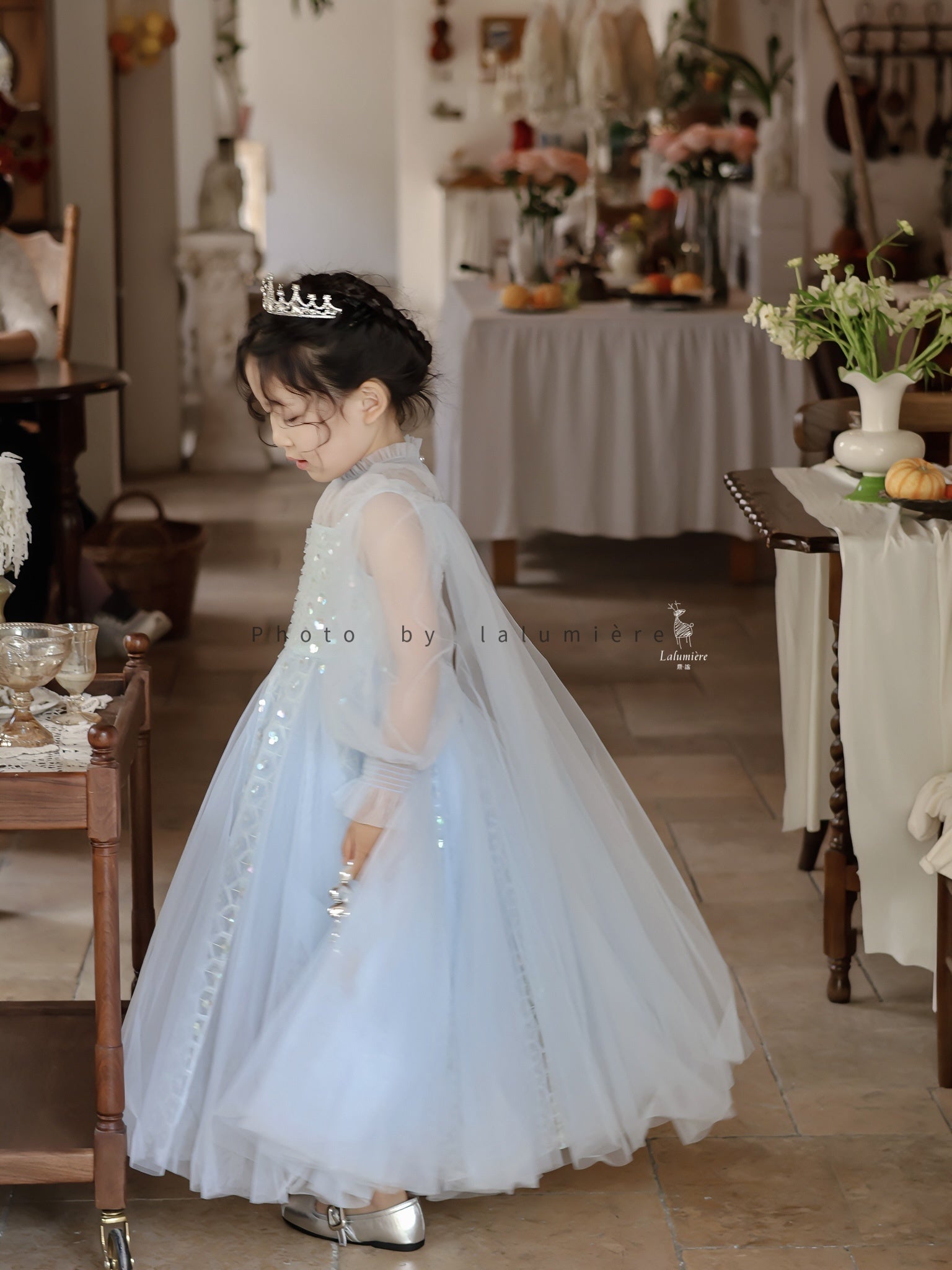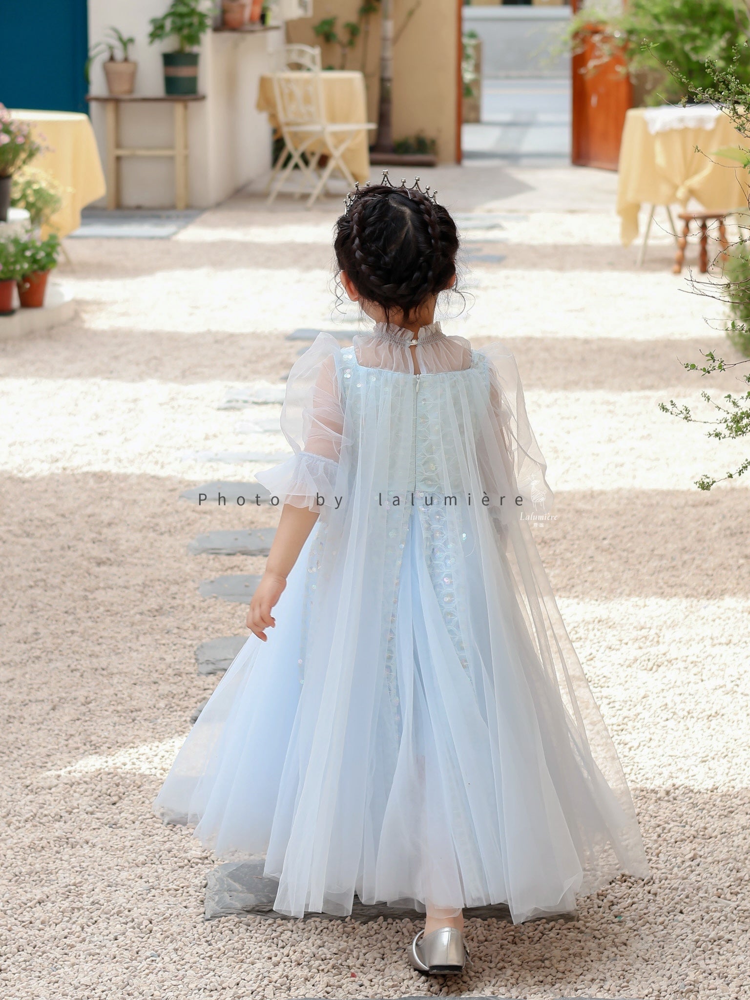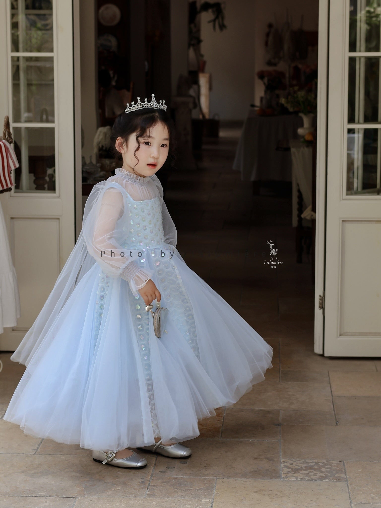 女童浅蓝色长纱袖冰雪公主裙