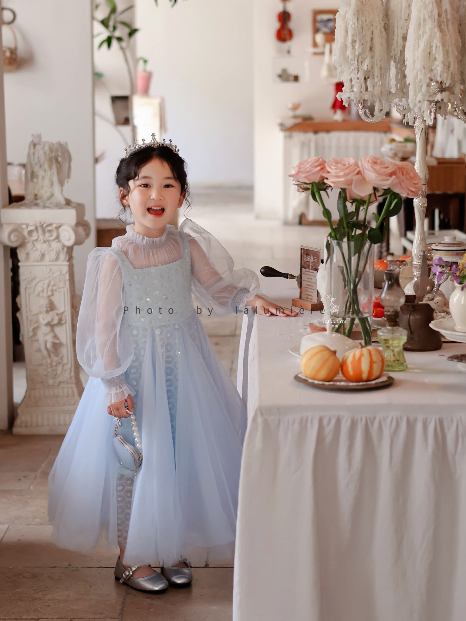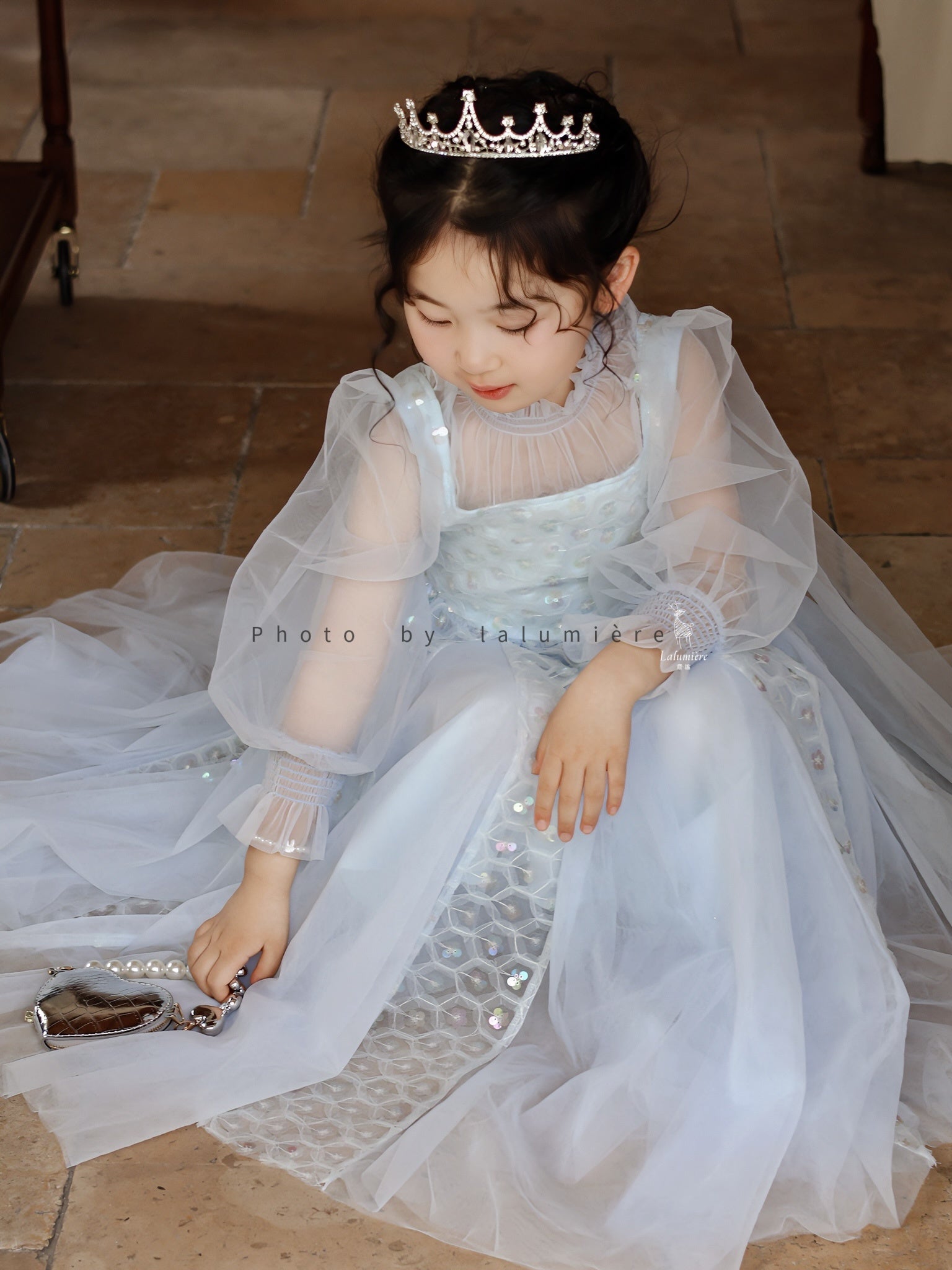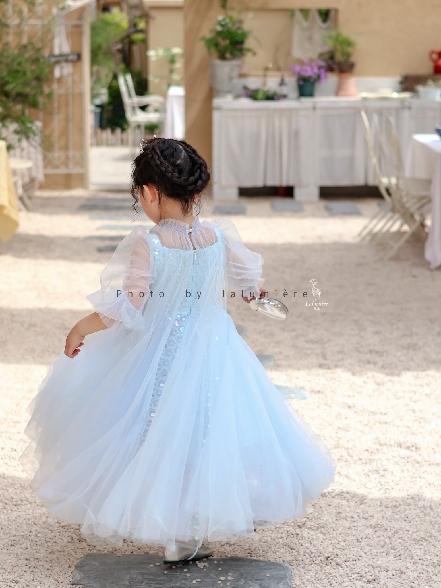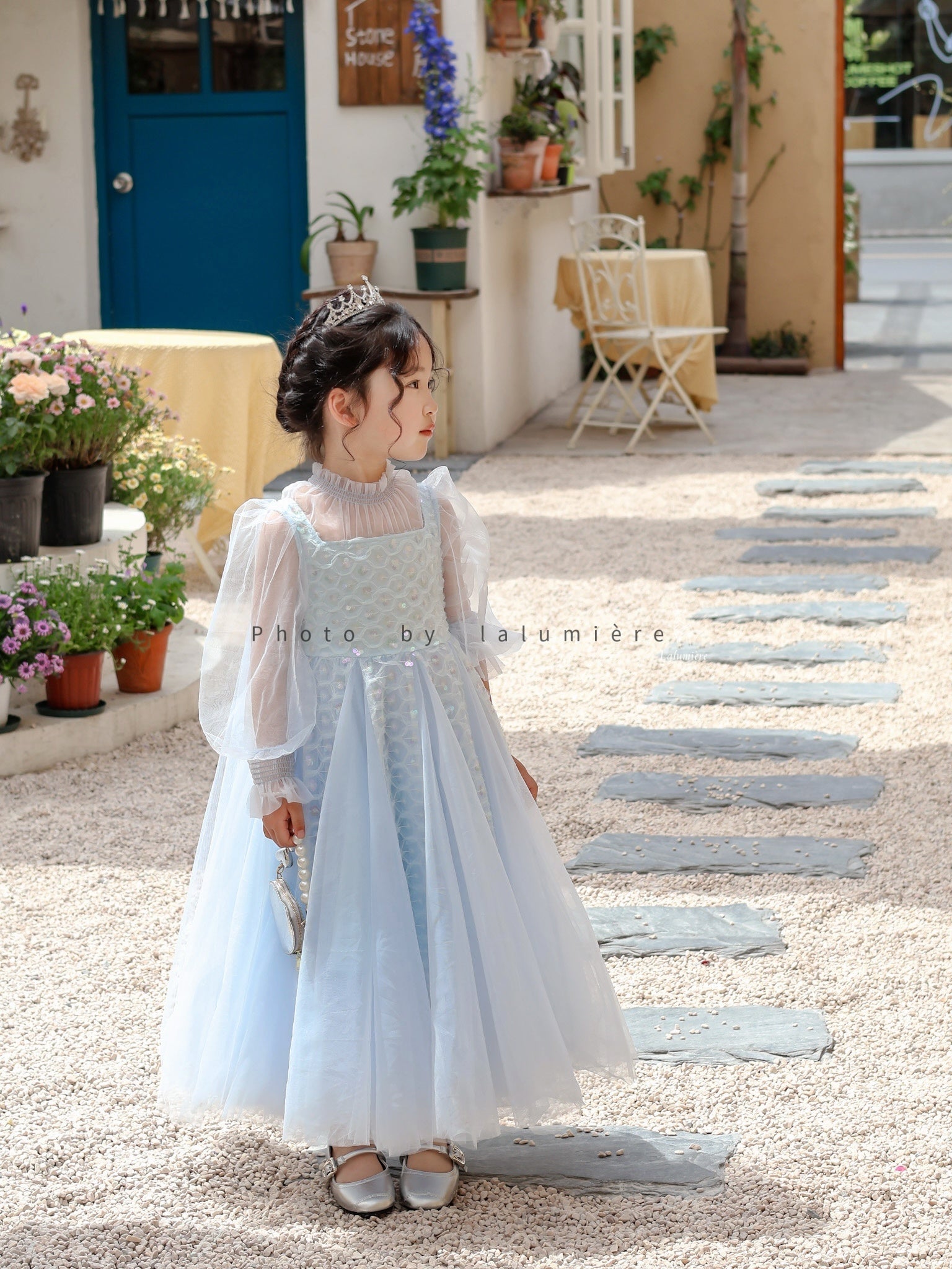 女童浅蓝色长纱袖冰雪公主裙
