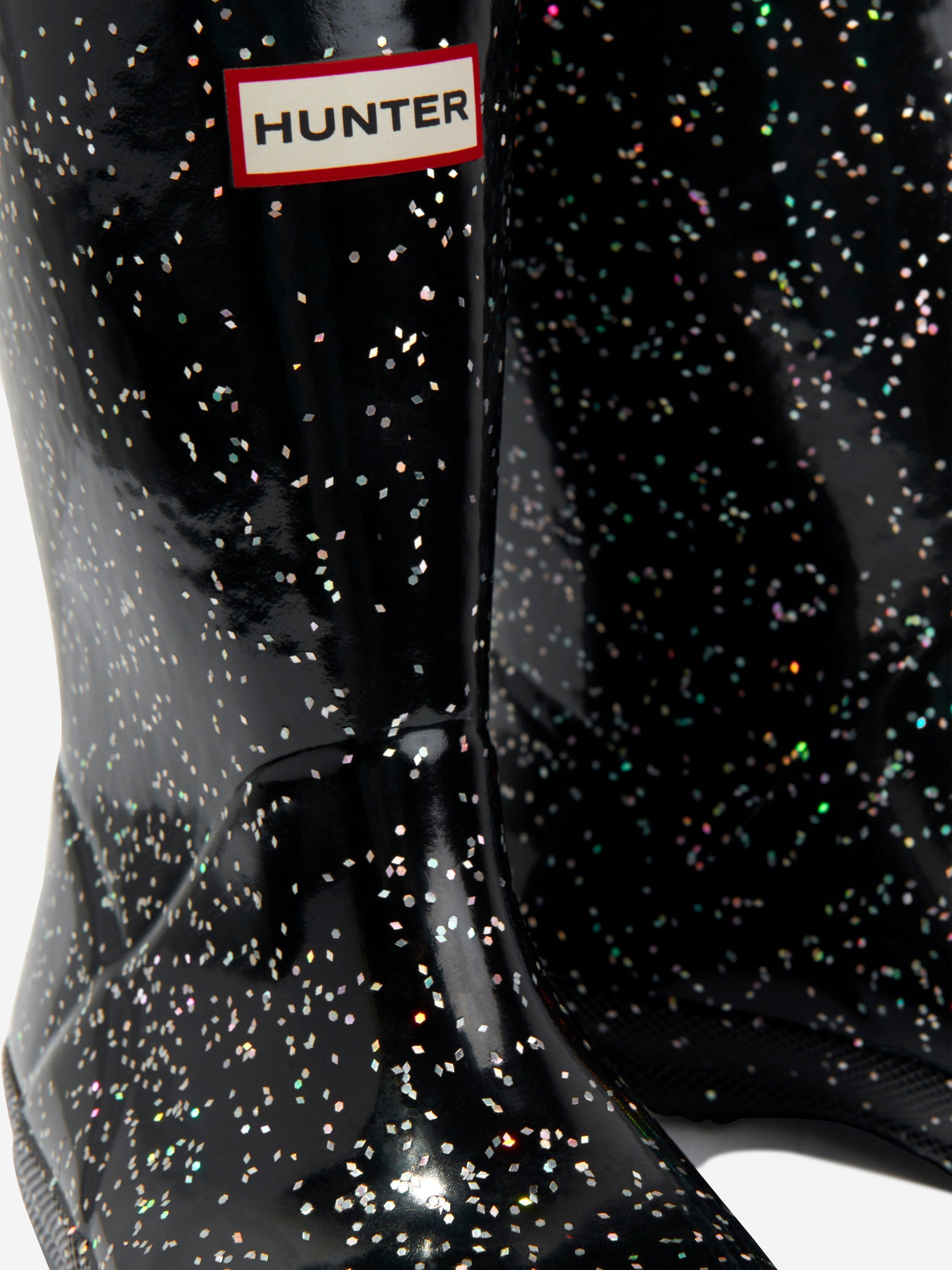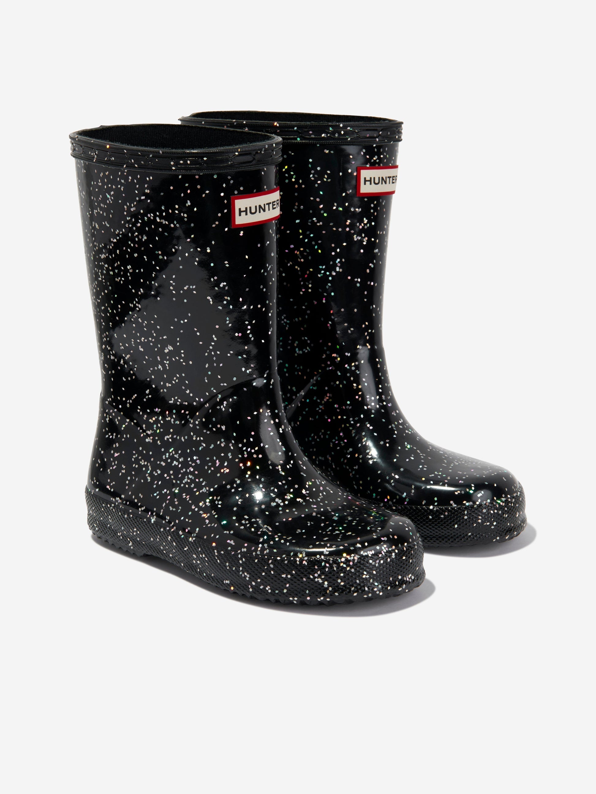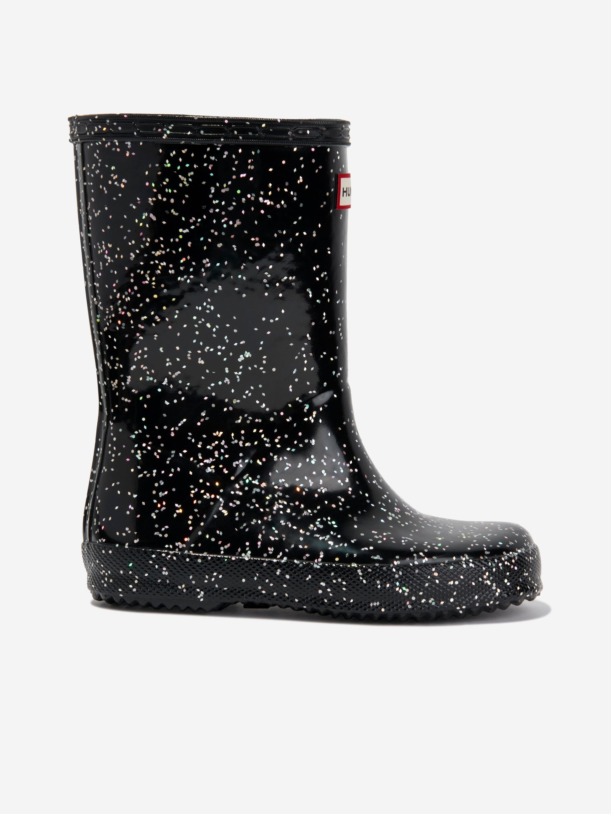 介绍 Hunter 原创的首款经典大号闪光女童惠灵顿靴(黑色),为她的鞋履系列增添了精美的一笔。主要特点包括: