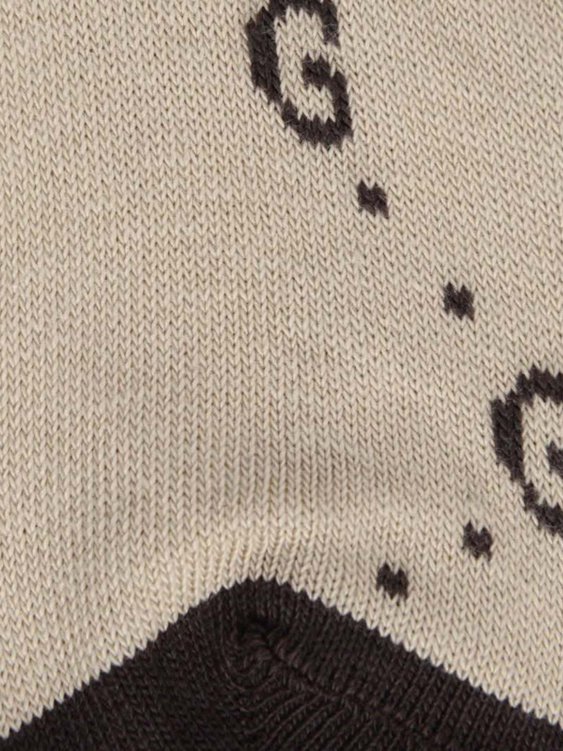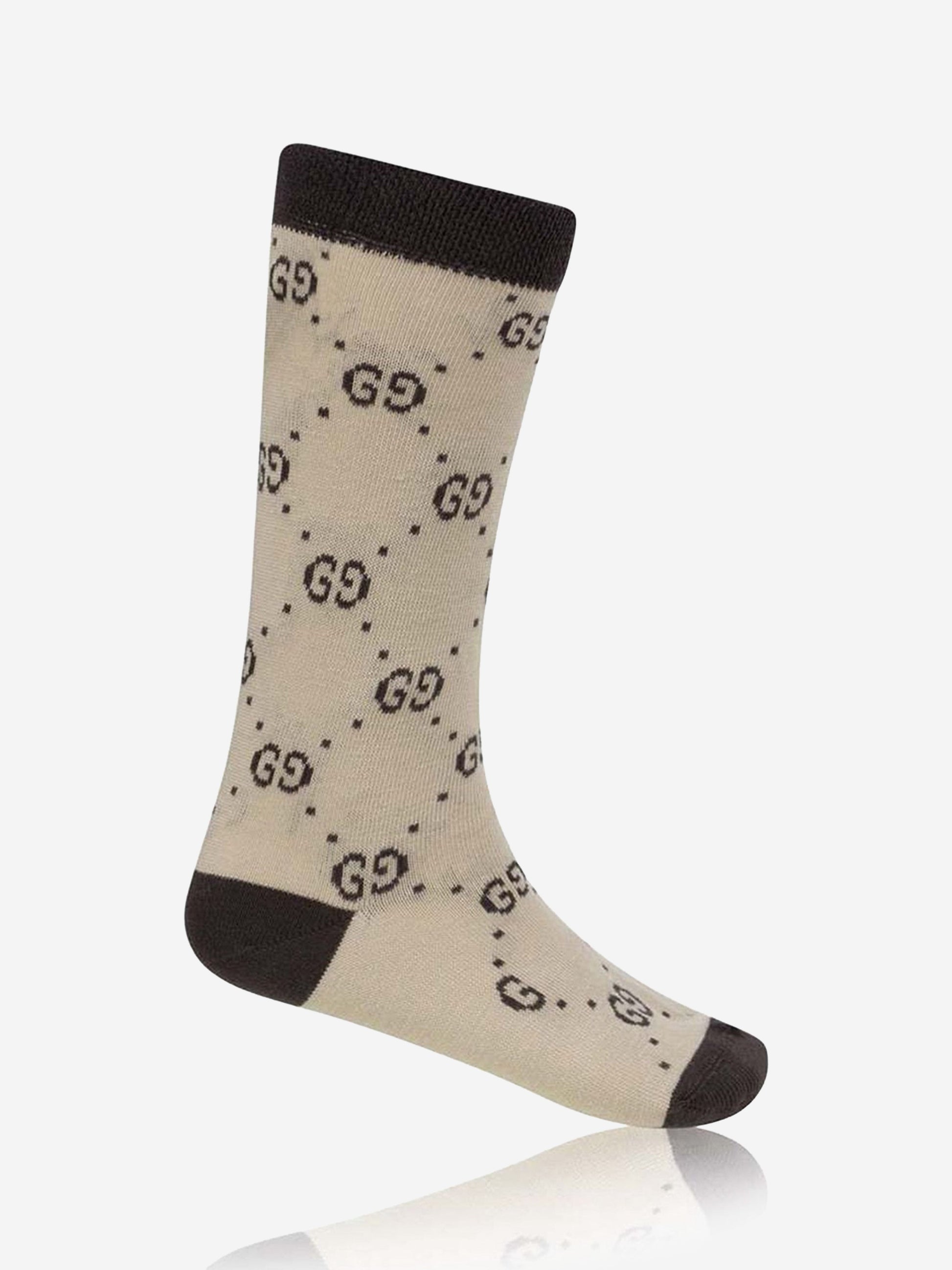介绍 Gucci 的米色儿童 GG 袜子。这些高端意大利制造的袜子兼具时尚感和舒适感,是休闲装的关键。主要特点包括: