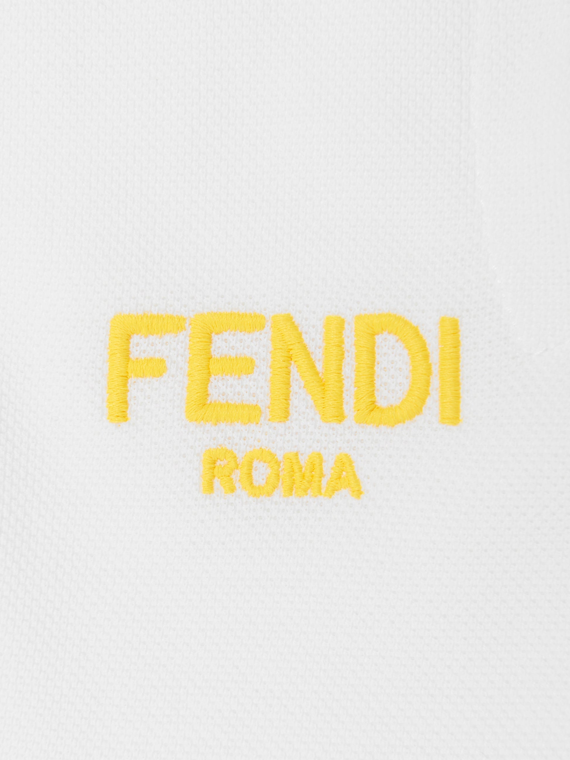 白色棉质凸纹面料制成,肩部镂空,领口细节和黄色 Fendi Roma 刺绣。