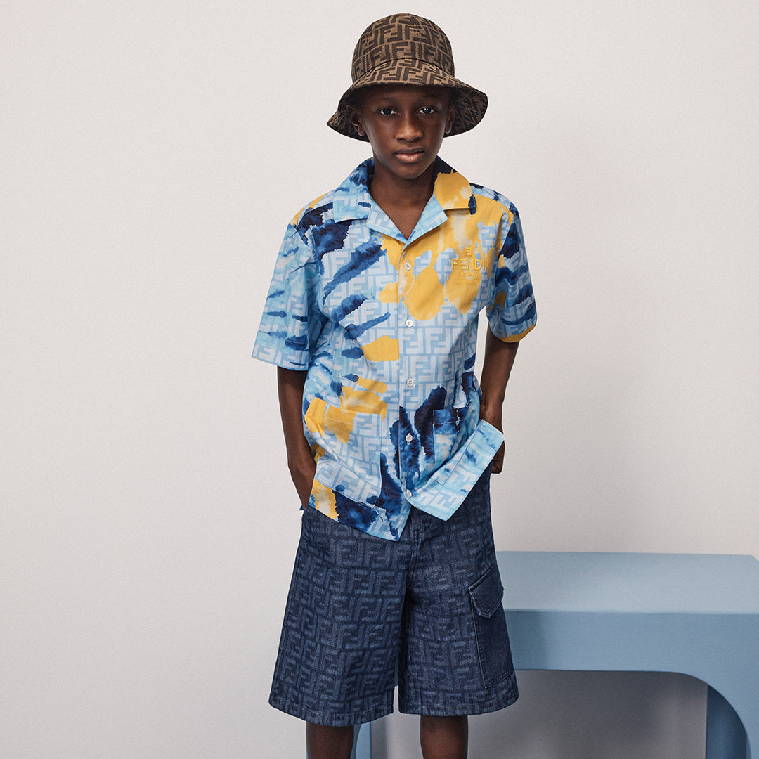 Fendi 将传统与现代融为一体。这款男童 Casper 衬衫体现了意大利品牌对时尚、神秘配件的热爱。采用多色府绸制成,带有扎染印花和蓝色、浅蓝色和黄色的 FF 标志。
