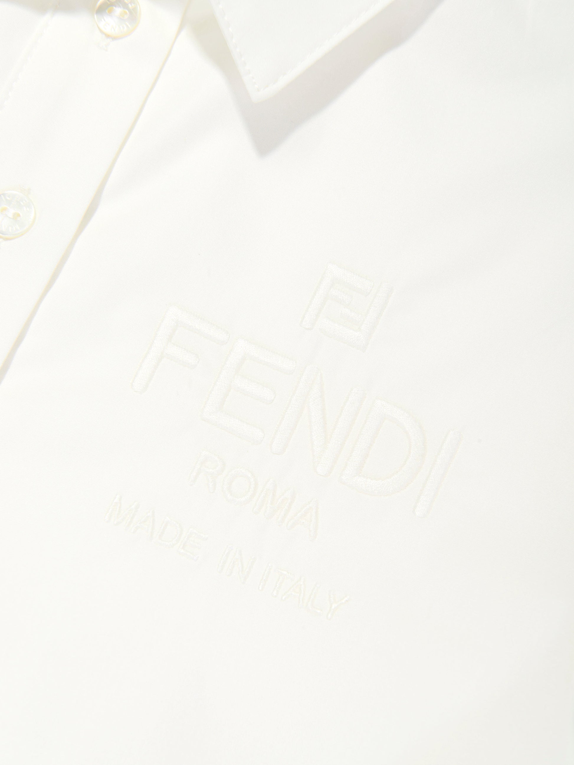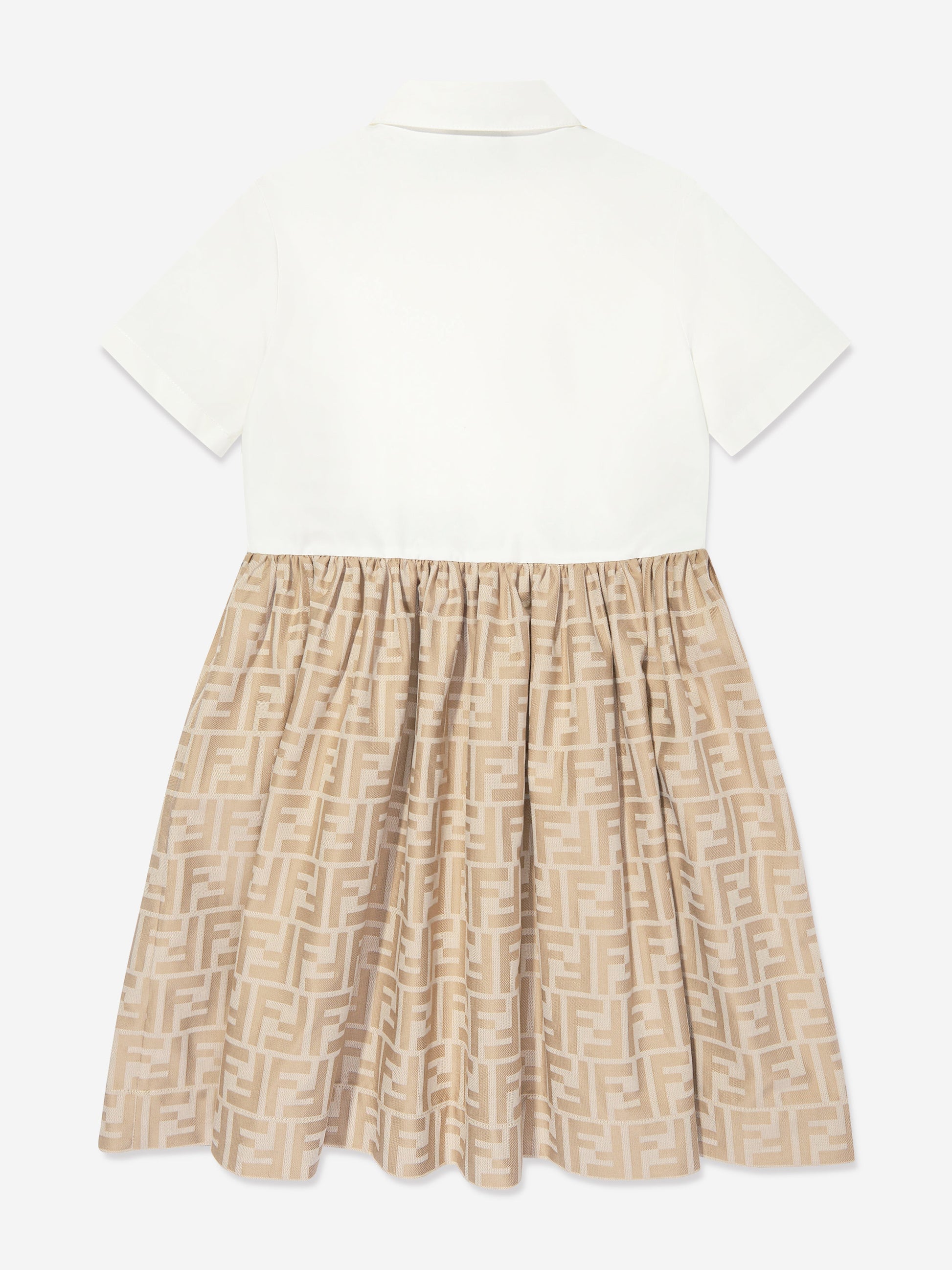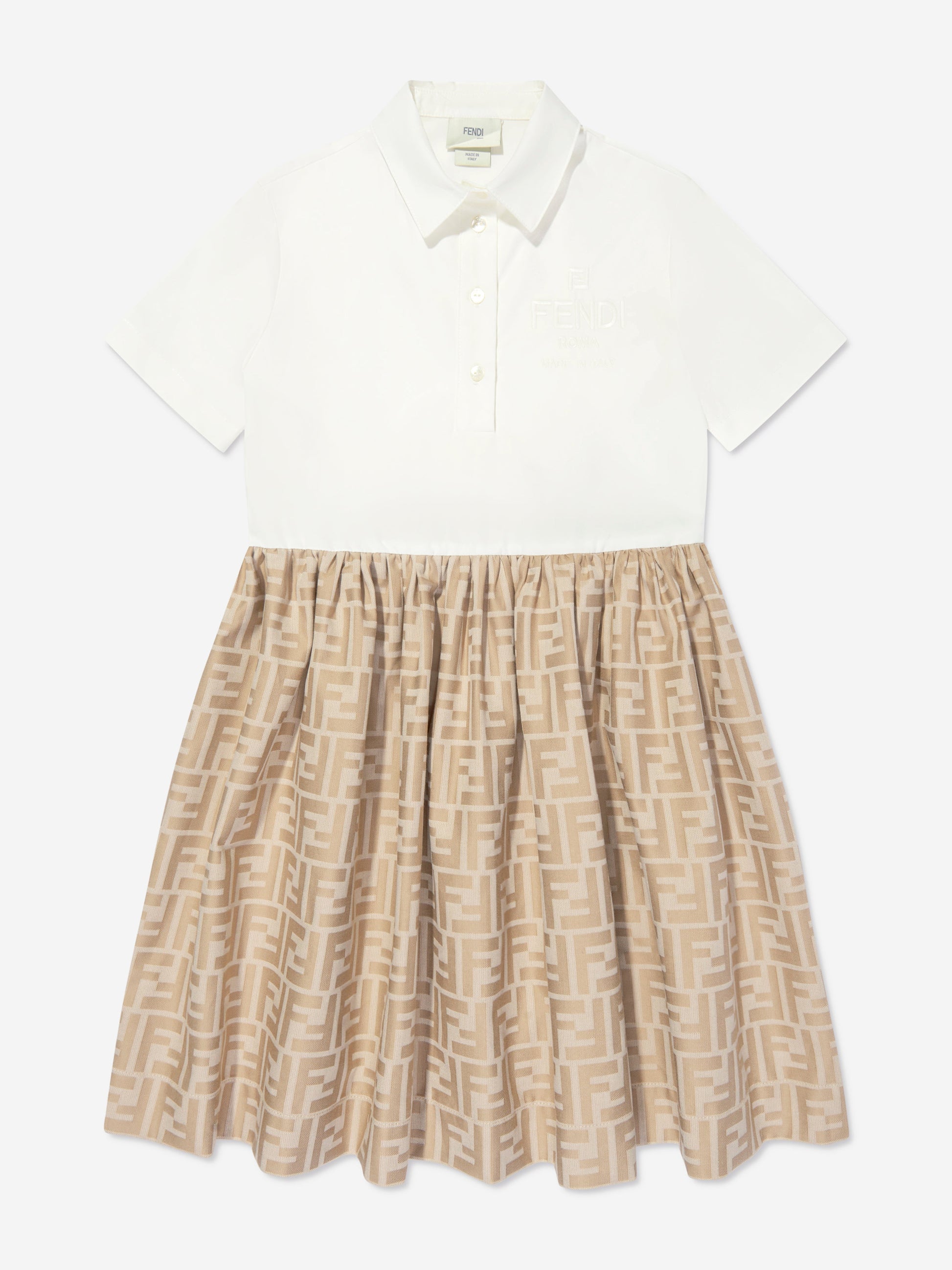 Fendi 将传统与现代融为一体。这款女童风衣体现了意大利品牌对实用时尚的重新概念化观点。采用白色府绸上衣和精致纽扣制作而成。它展示了米色棉质提花裙,带有全色调 FF 标志设计。