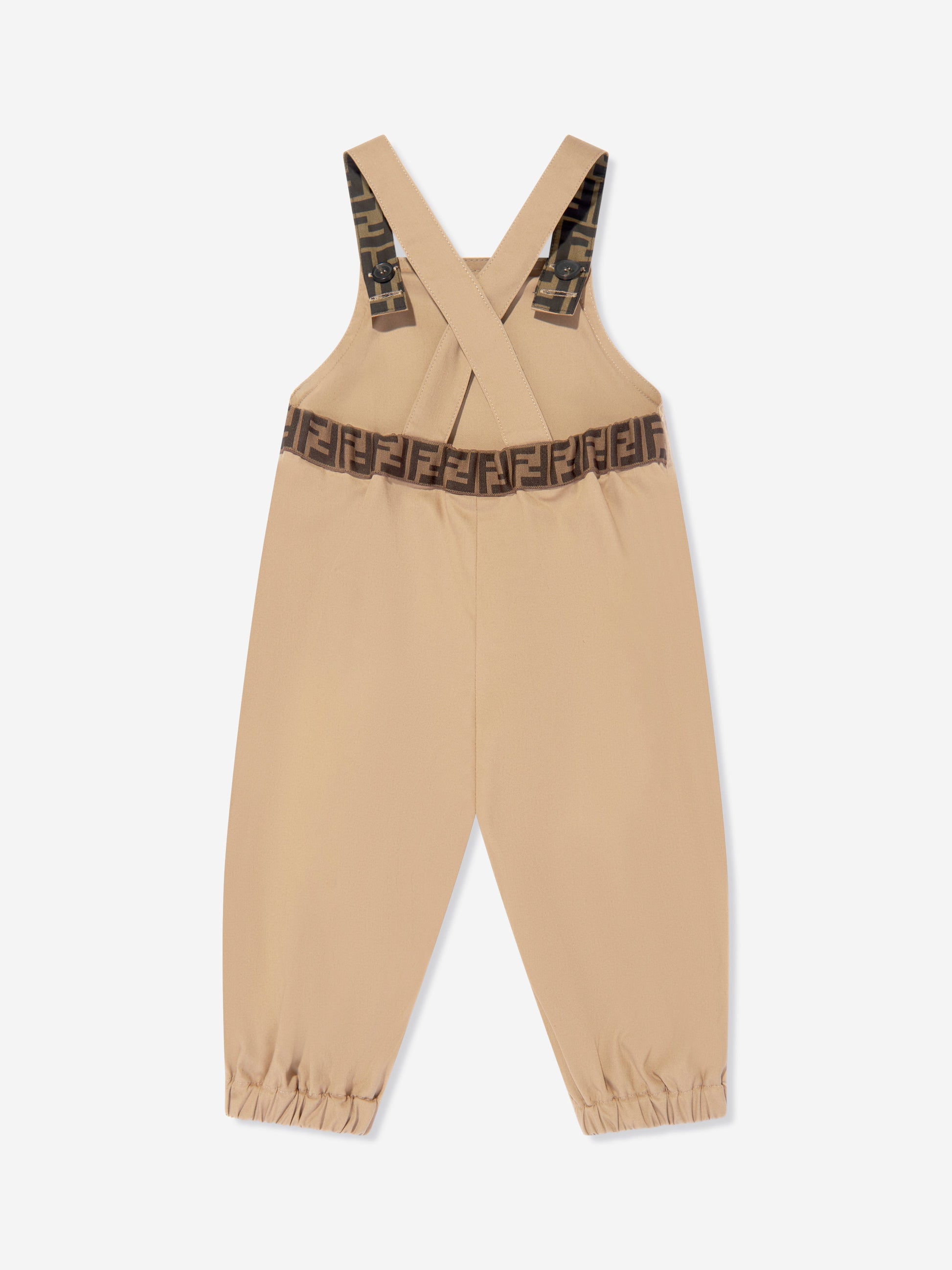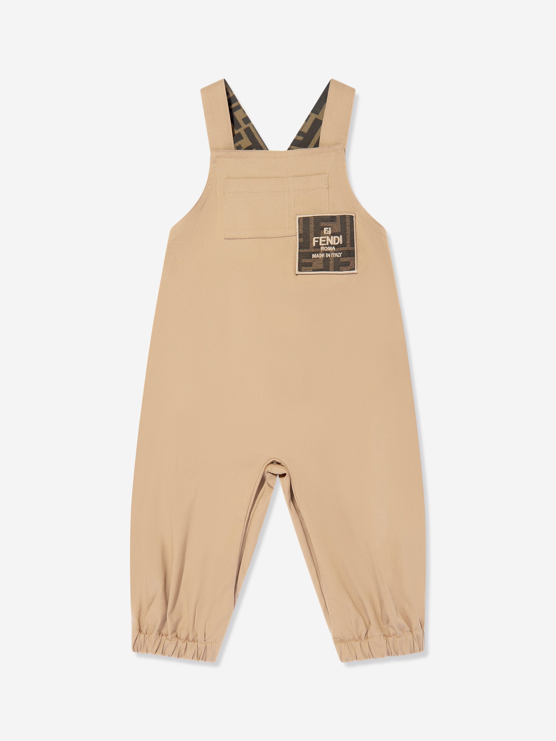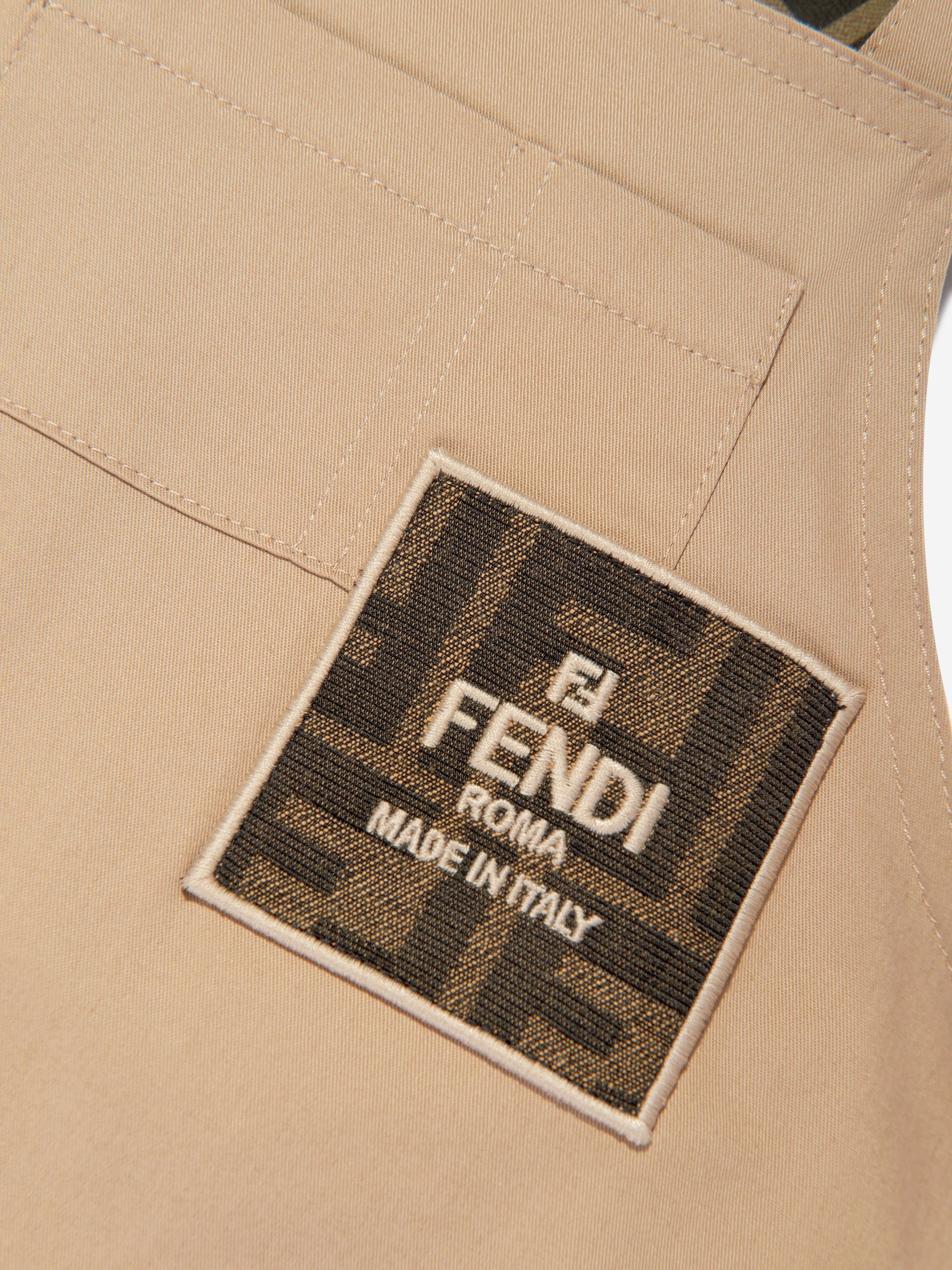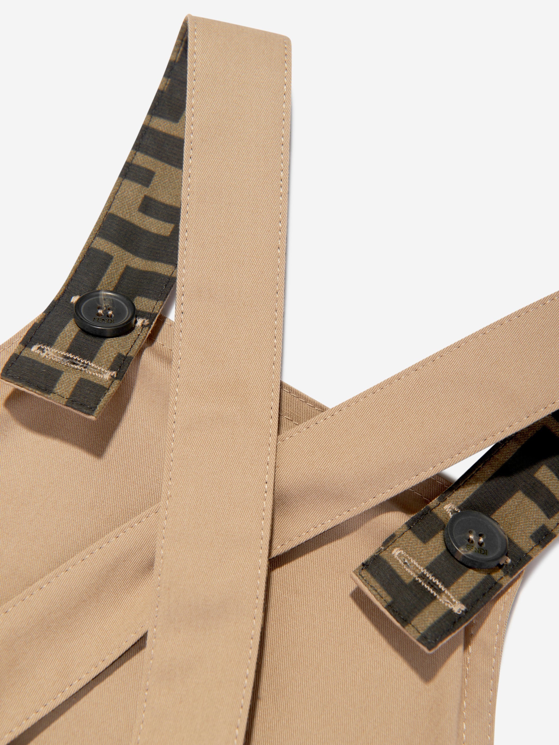 Fendi 将传统与现代融为一体,将实用时尚重新概念化为创新抽象。这些婴儿男女通用风衣工装裤体现了意大利品牌对精美高品质的热情。采用米色华达呢材料制成,正面饰有烟草色 FF 徽标贴片。它展示了肩带和纽扣开口,背面有弹性徽标带。