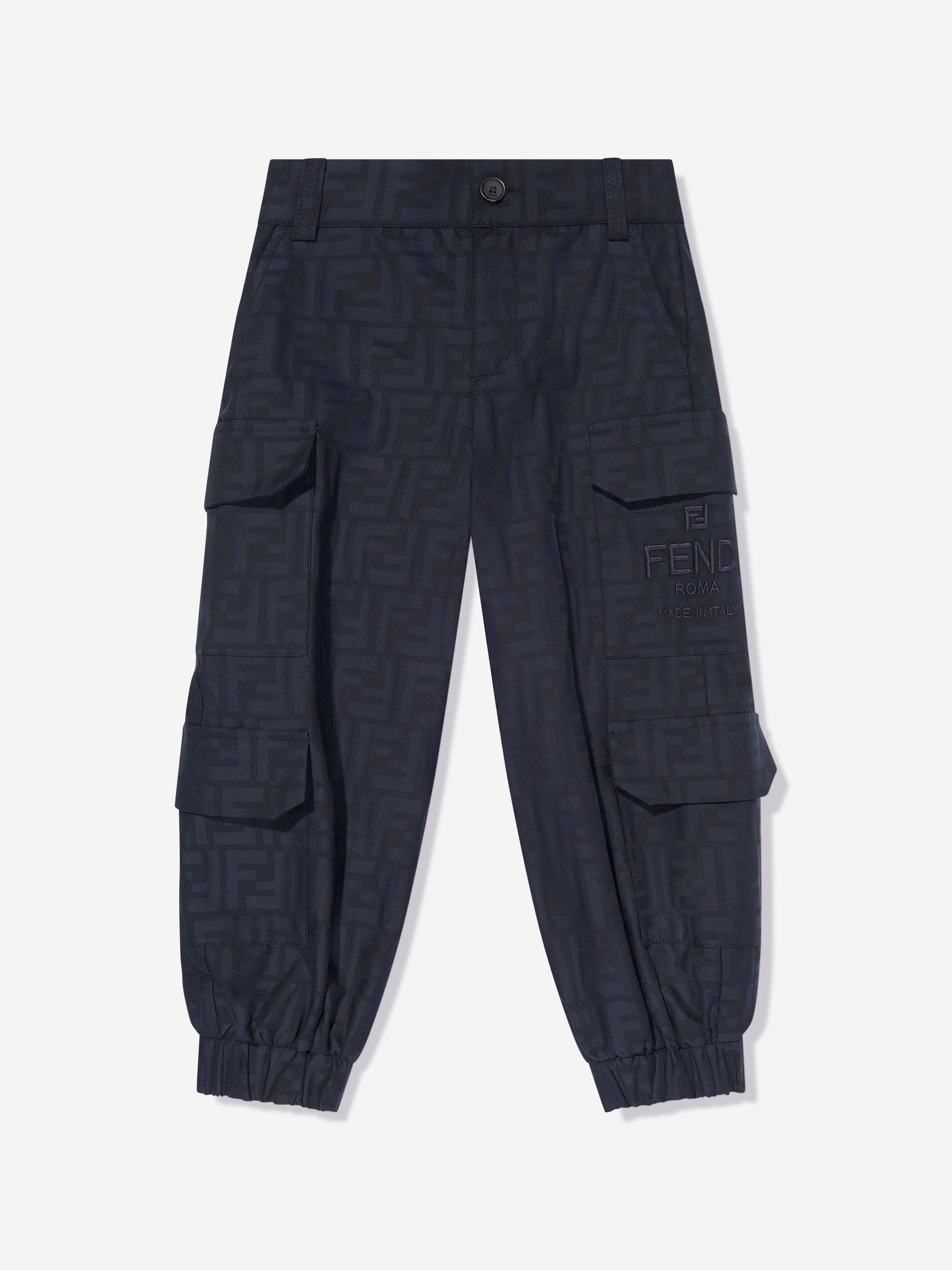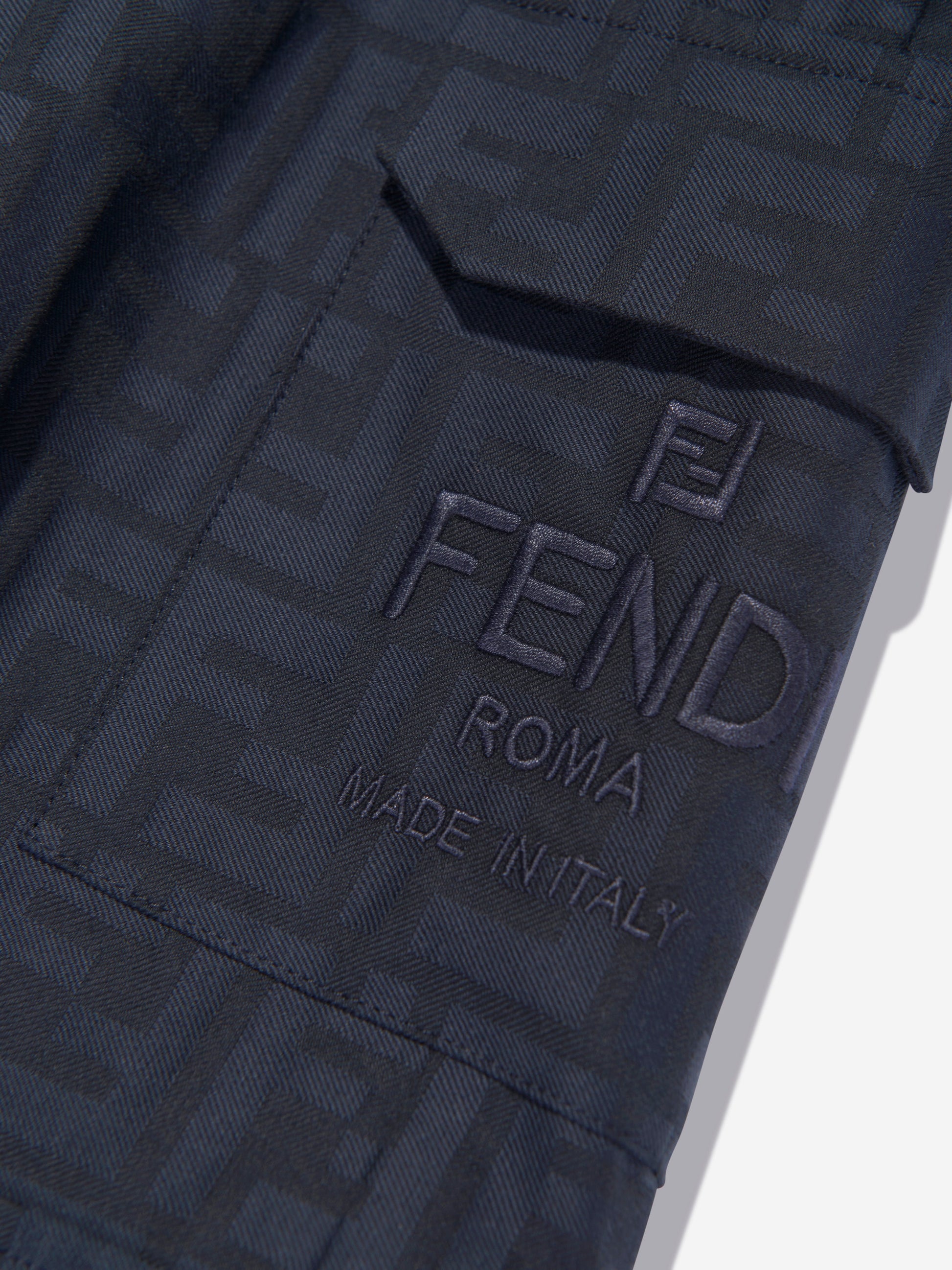 Fendi 体现了高品质工艺设计和精致优雅。这些男孩海军蓝 FF 全长裤放大了意大利奢侈品牌对休闲设计的偏爱。采用深色棉质提花面料制成,采用工装风格,全身同色系 FF 标志图案。配有 Fendi Roma 刺绣,散发出实用优雅的气息。