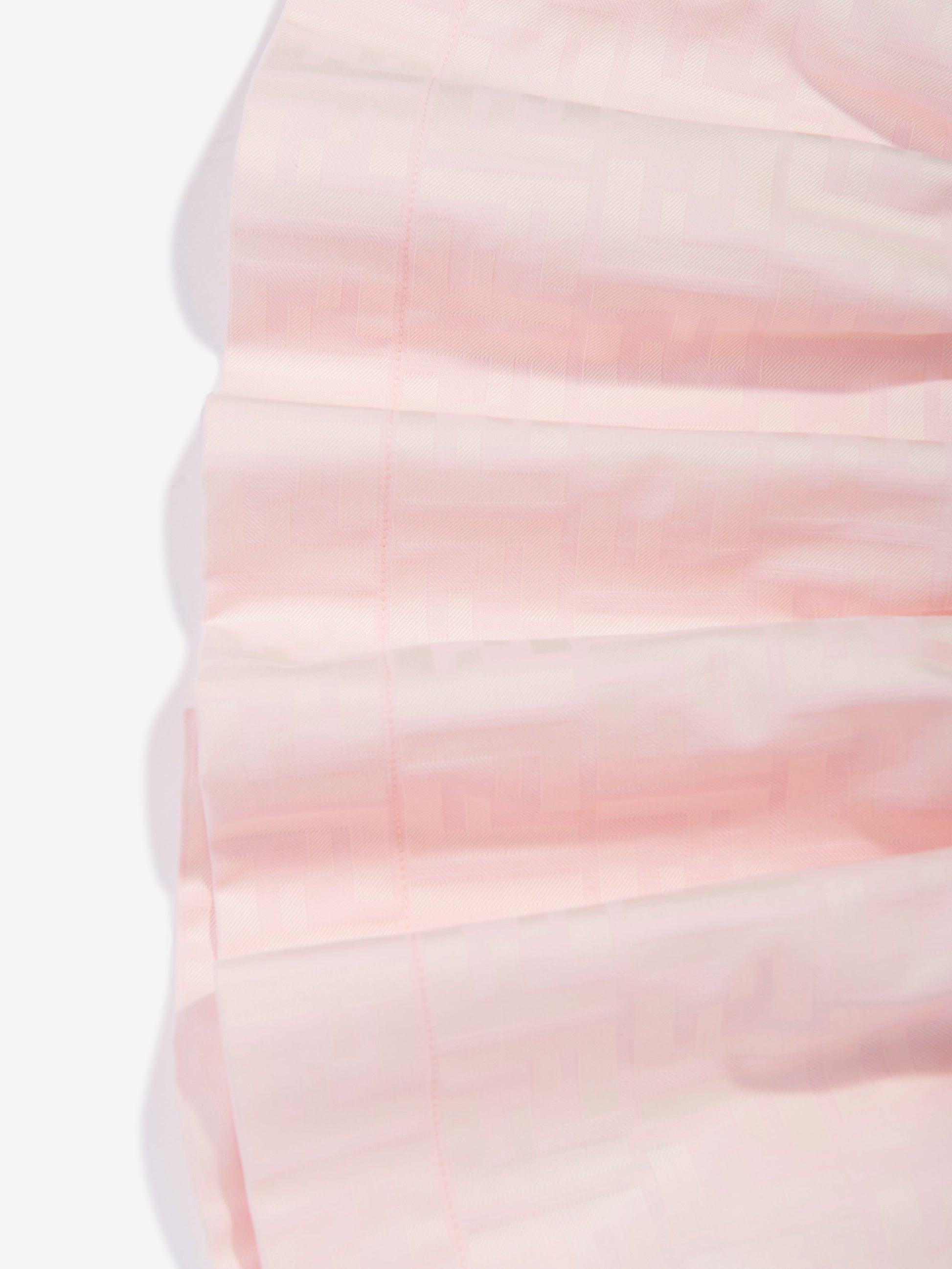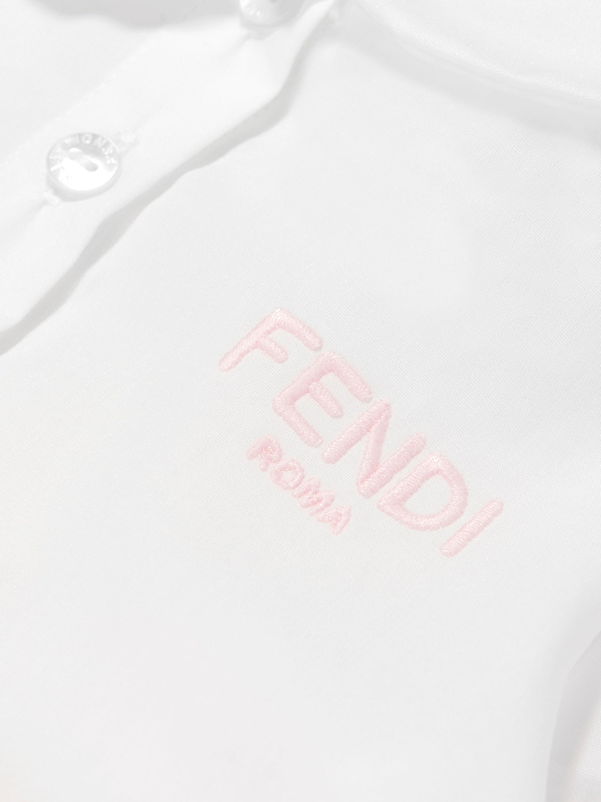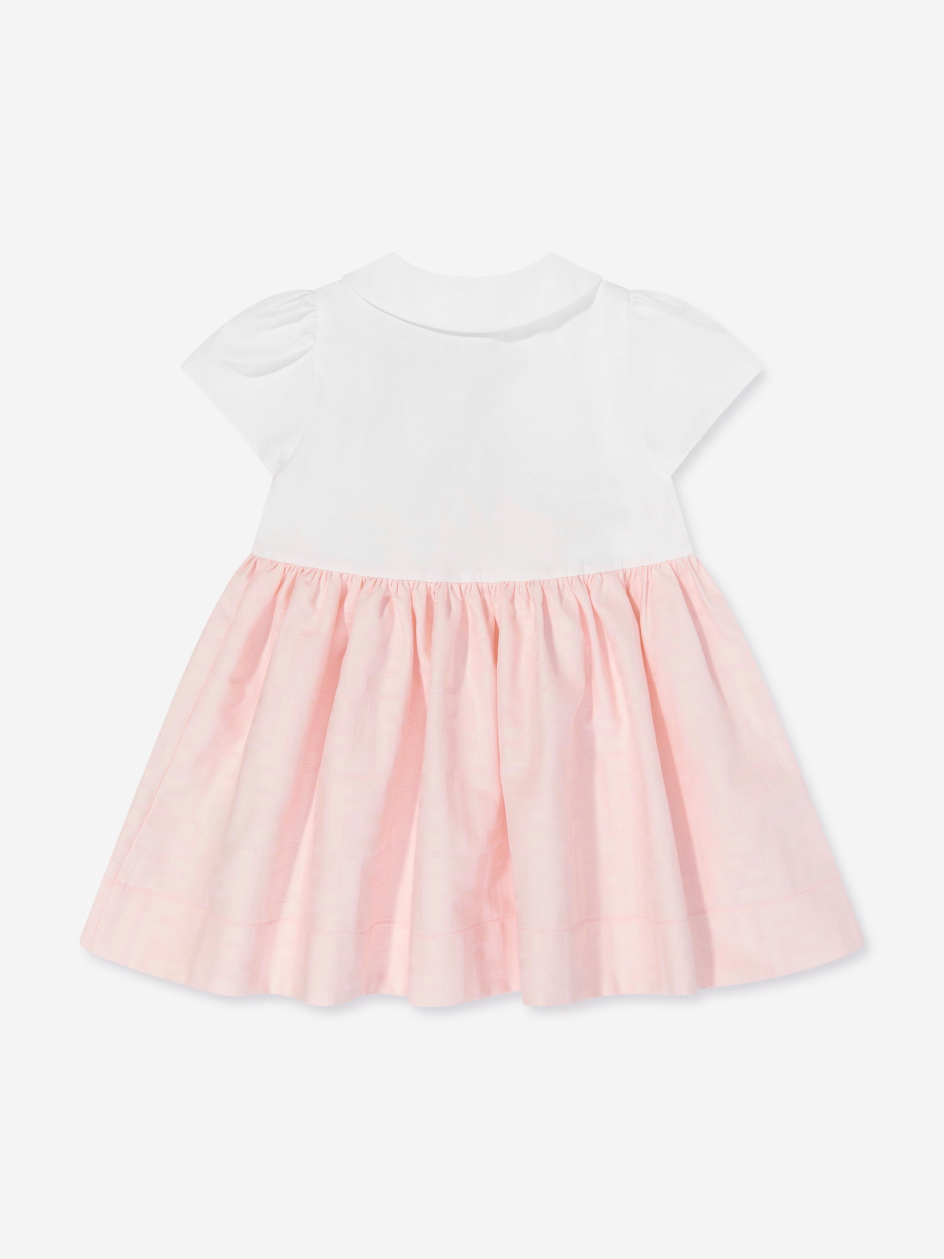 意大利奢侈品牌 Fendi 将新的美学特性融入传统抽象中。这款女婴衬衫裙体现了该品牌对时尚实用时尚的偏爱。采用精美的优质棉制成,配有彼得潘领、白色府绸上衣、精致纽扣、正面有徽标和粉色提花裙,裙身印有同色系 FF 徽标。