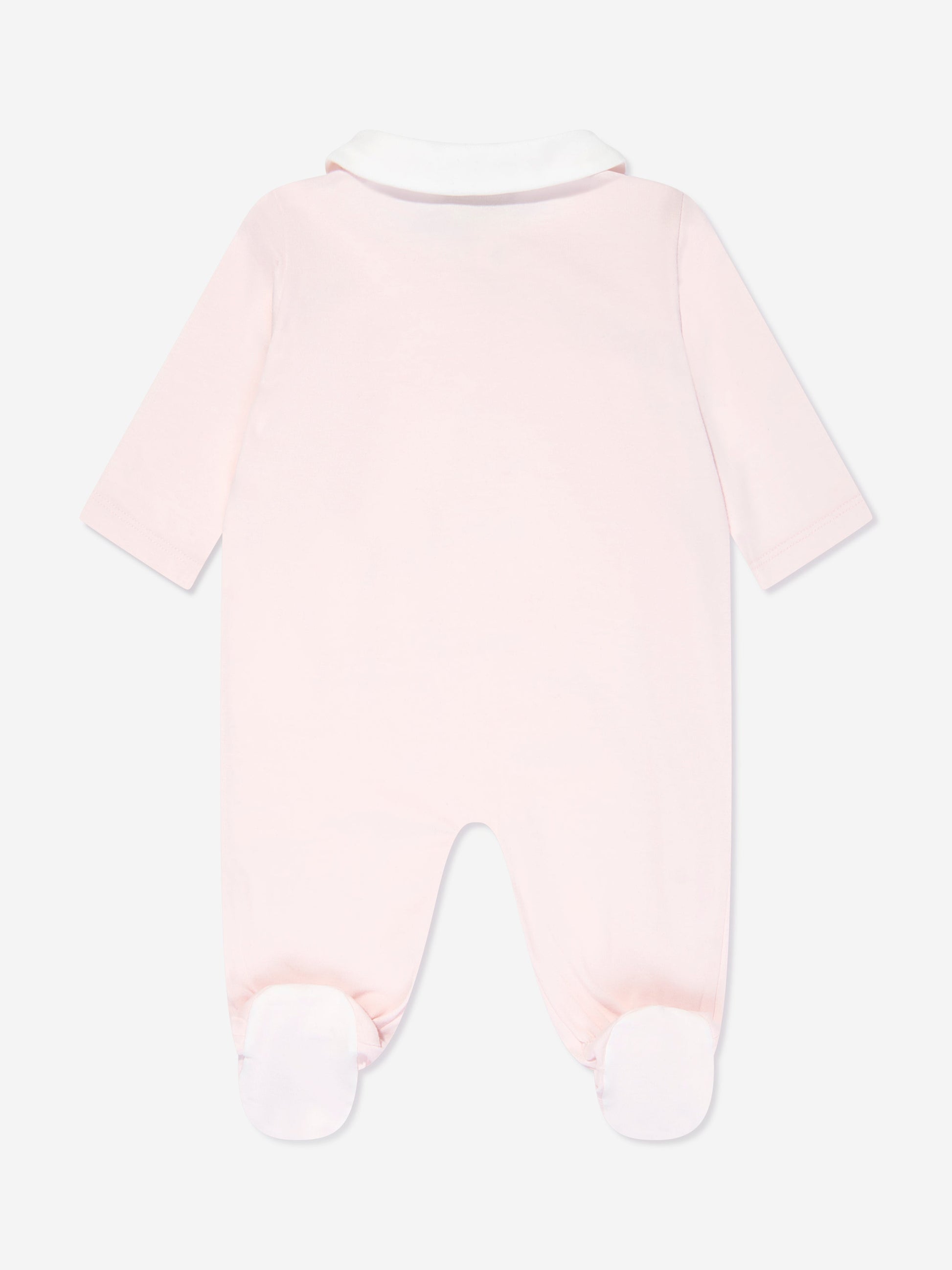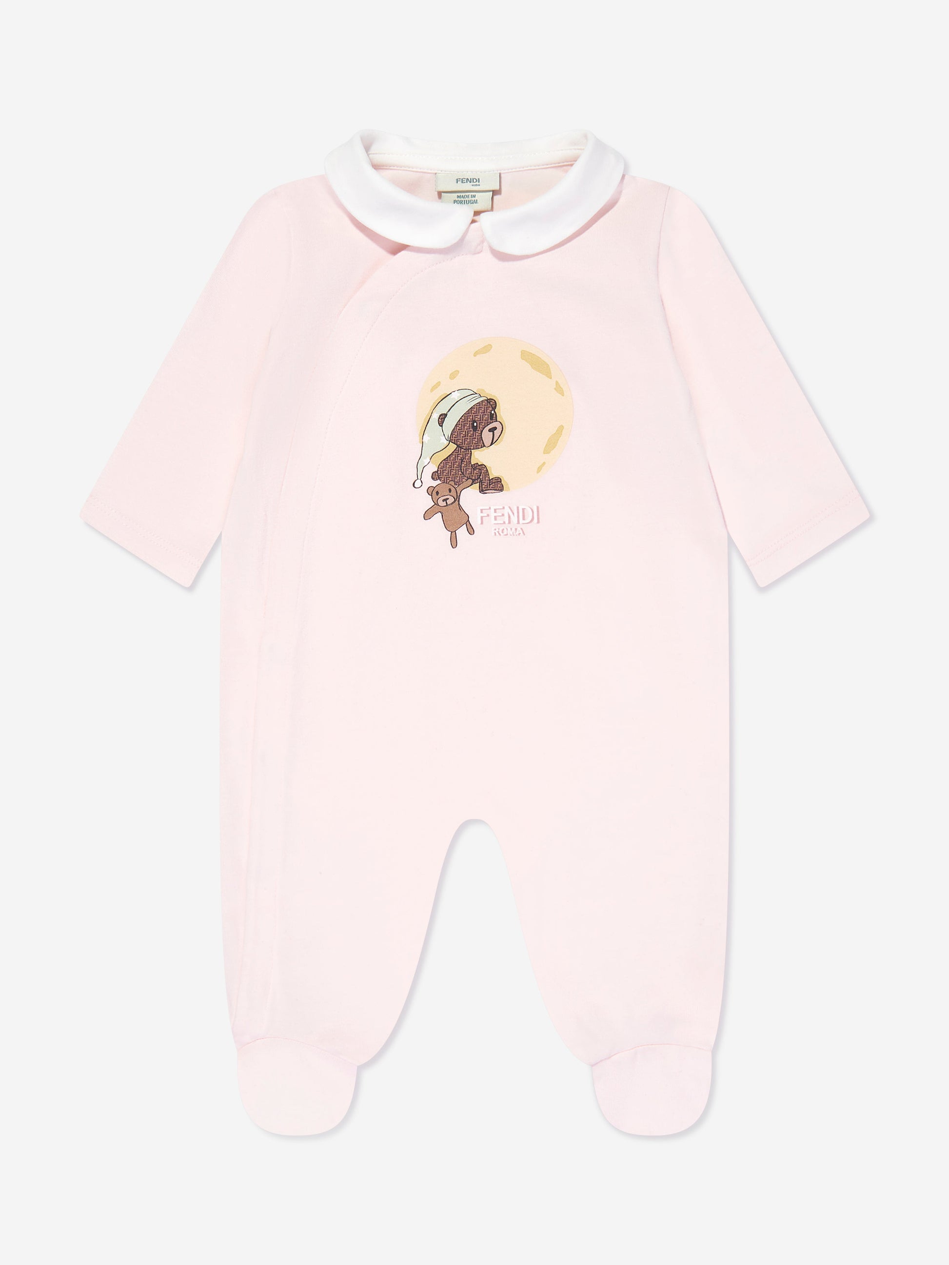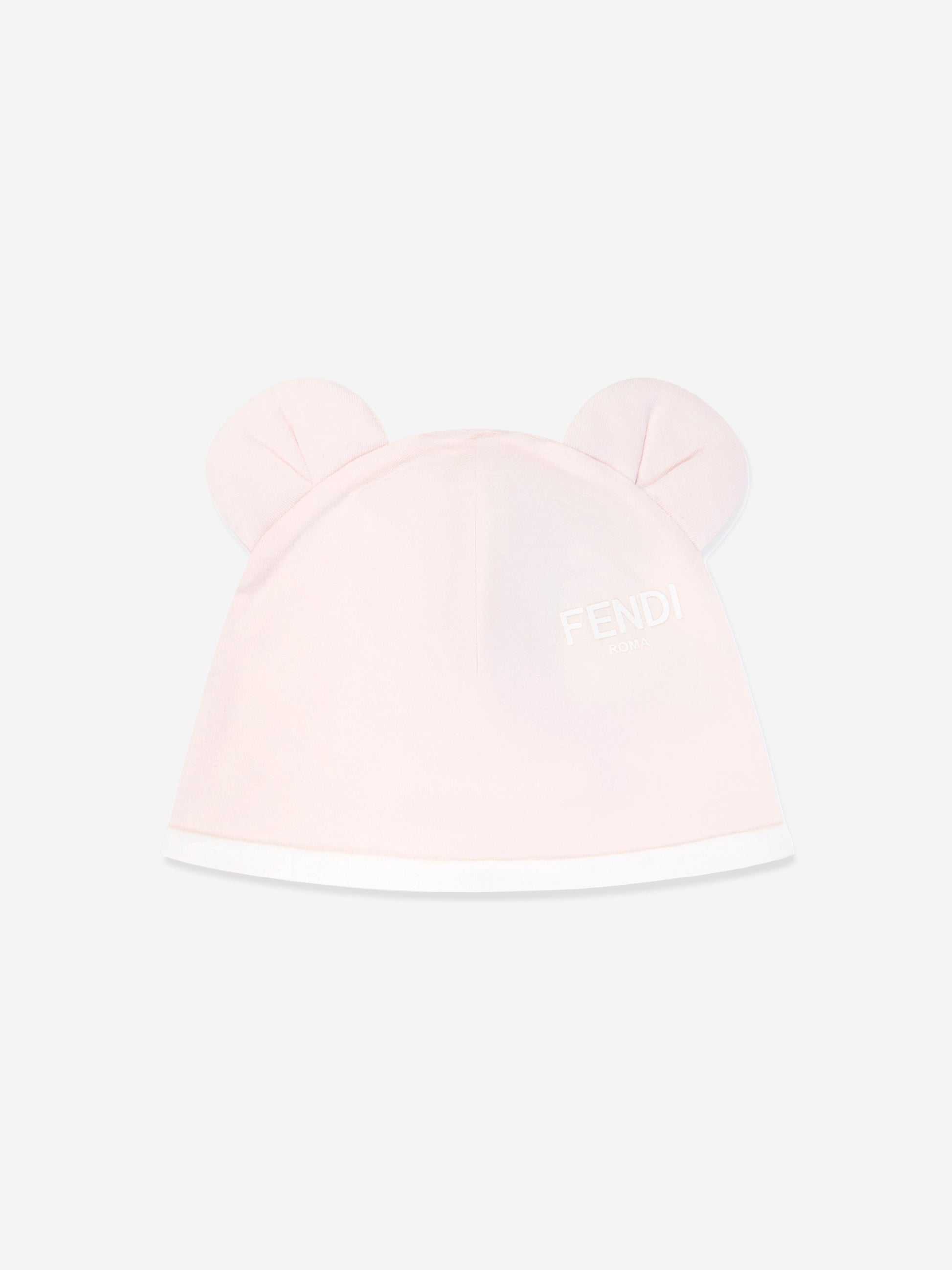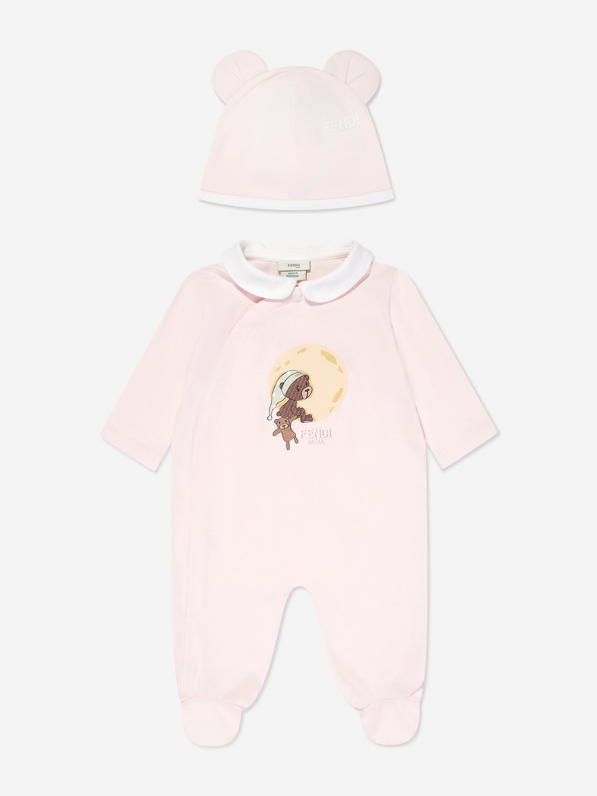 Fendi 将传统与现代融为一体。这款女婴连体衣体现了意大利品牌对时尚、创新抽象的热情。采用粉色棉质针织面料制成,配有带耳朵的帽子和连体裤。正面印有 Fendi 泰迪熊图案,并带有标志性的烟草 FF 标志。