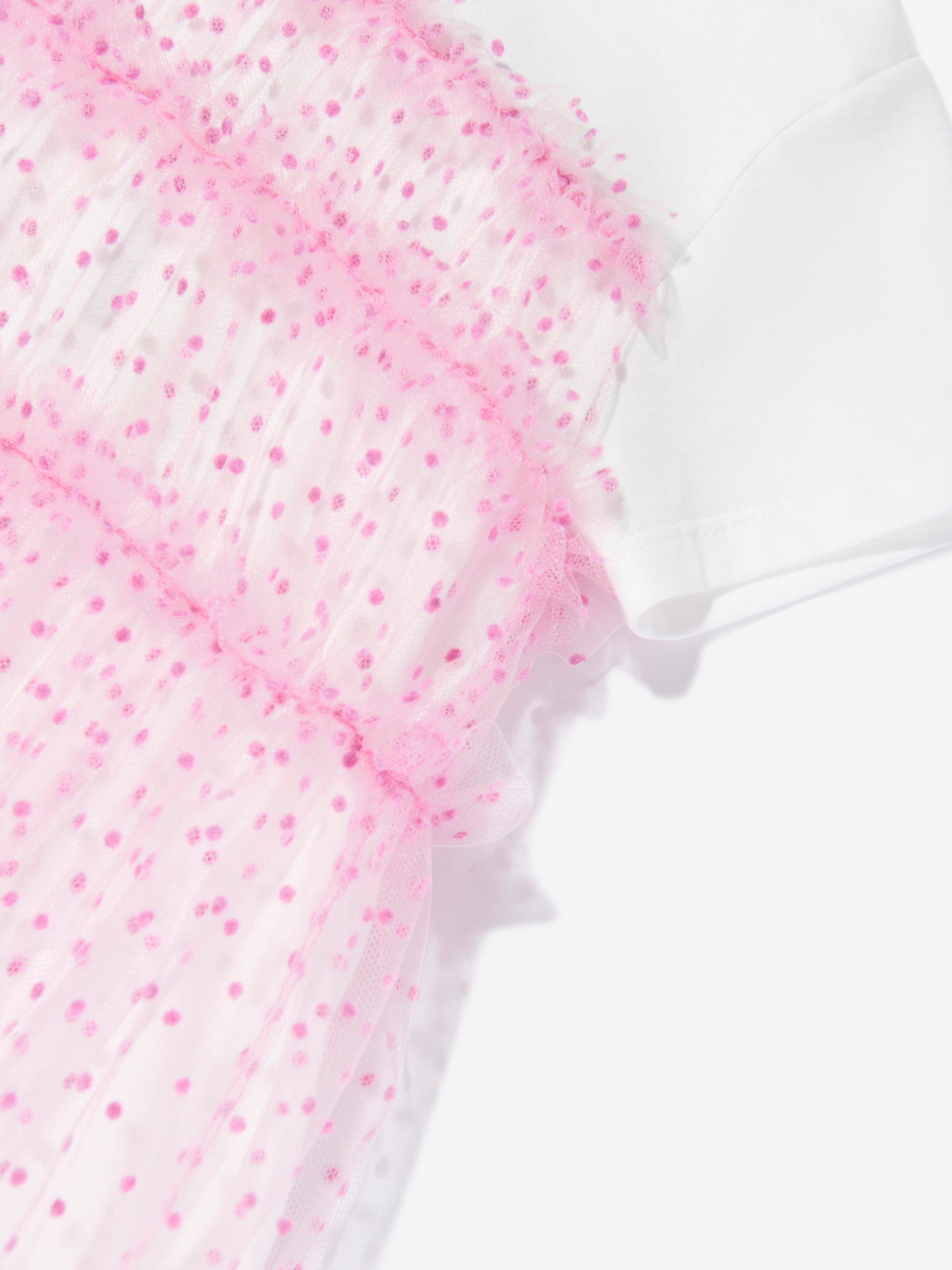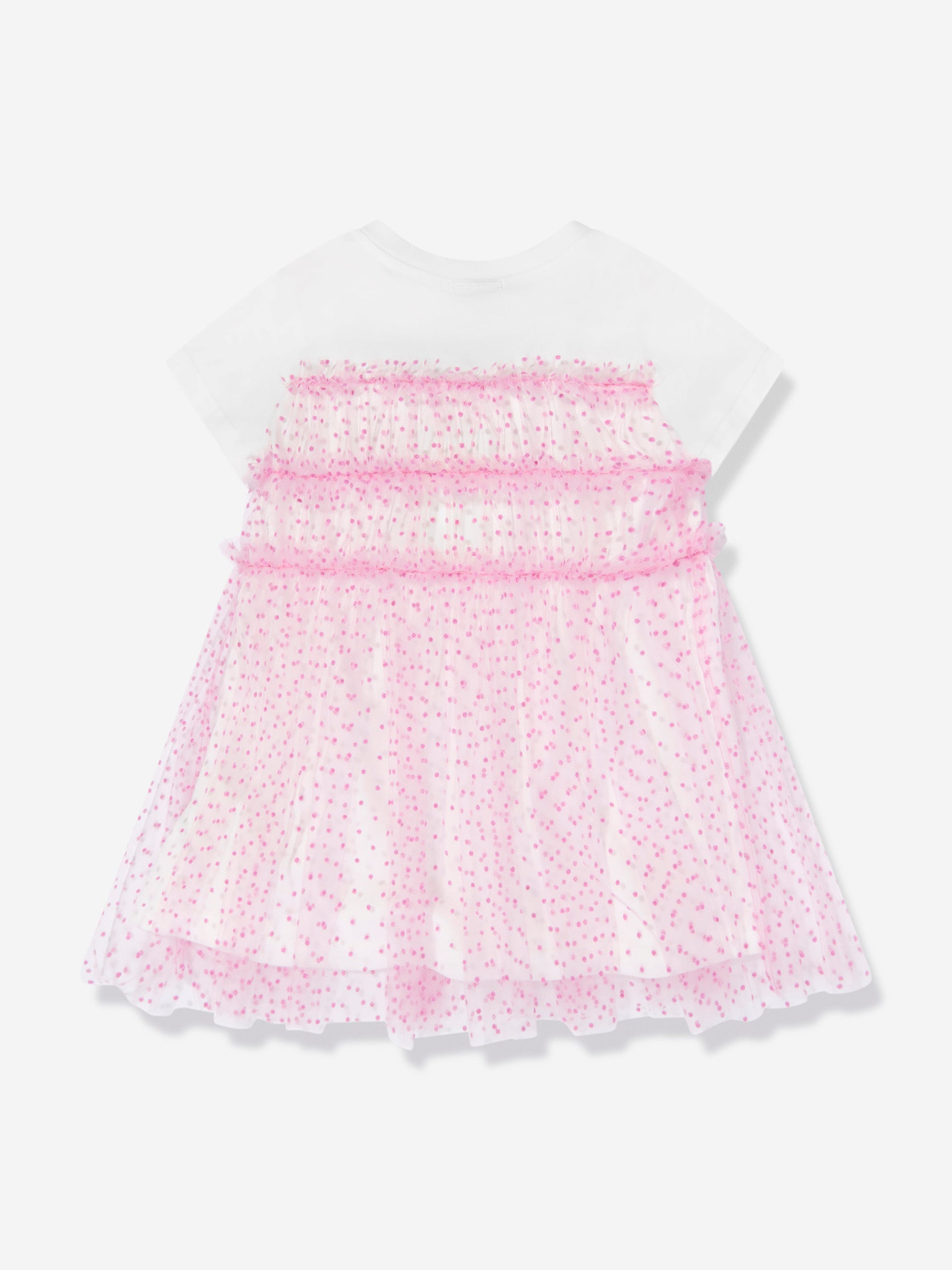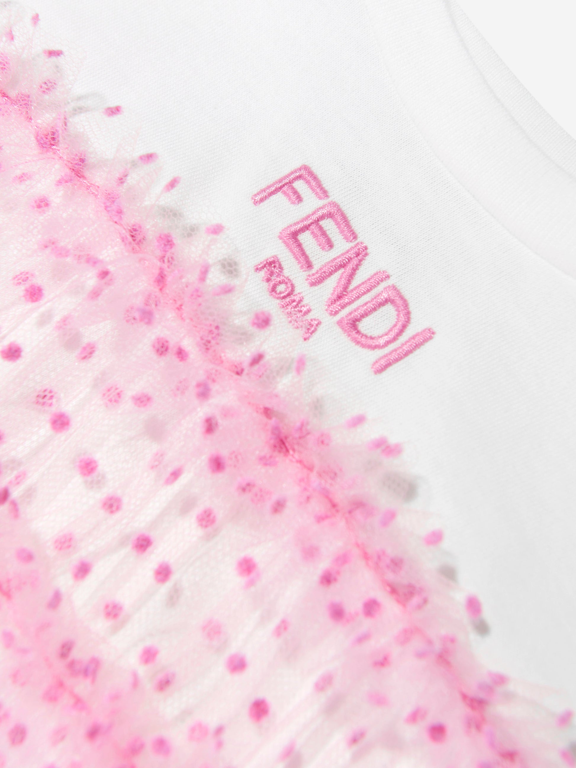 Fendi 体现了高品质工艺设计与精致优雅。这款女婴 T 恤连衣裙体现了该品牌对精致、无限的意大利抽象风格的热爱。采用白色针织衫和粉色羽毛薄纱制成,带有全圆点。