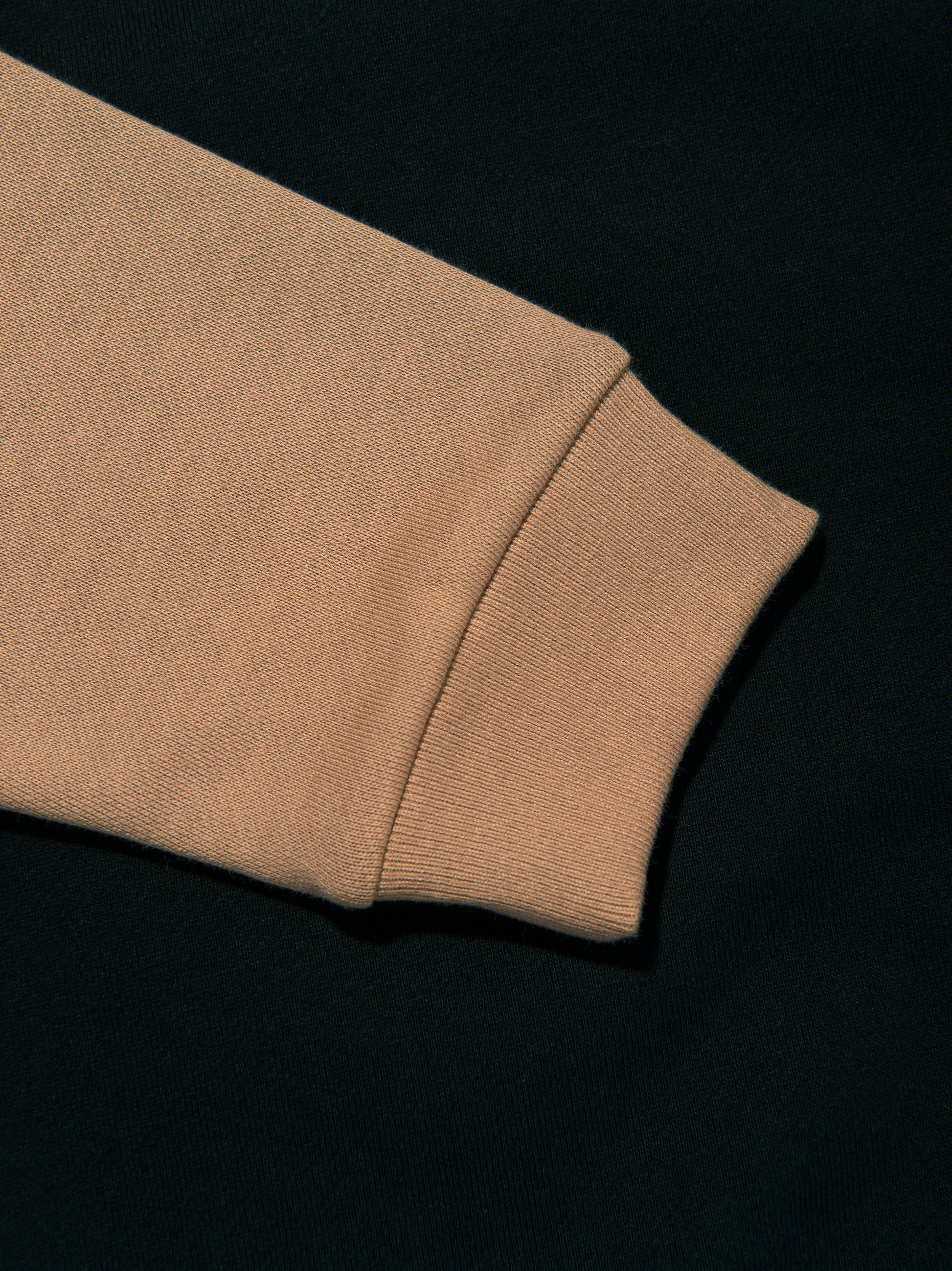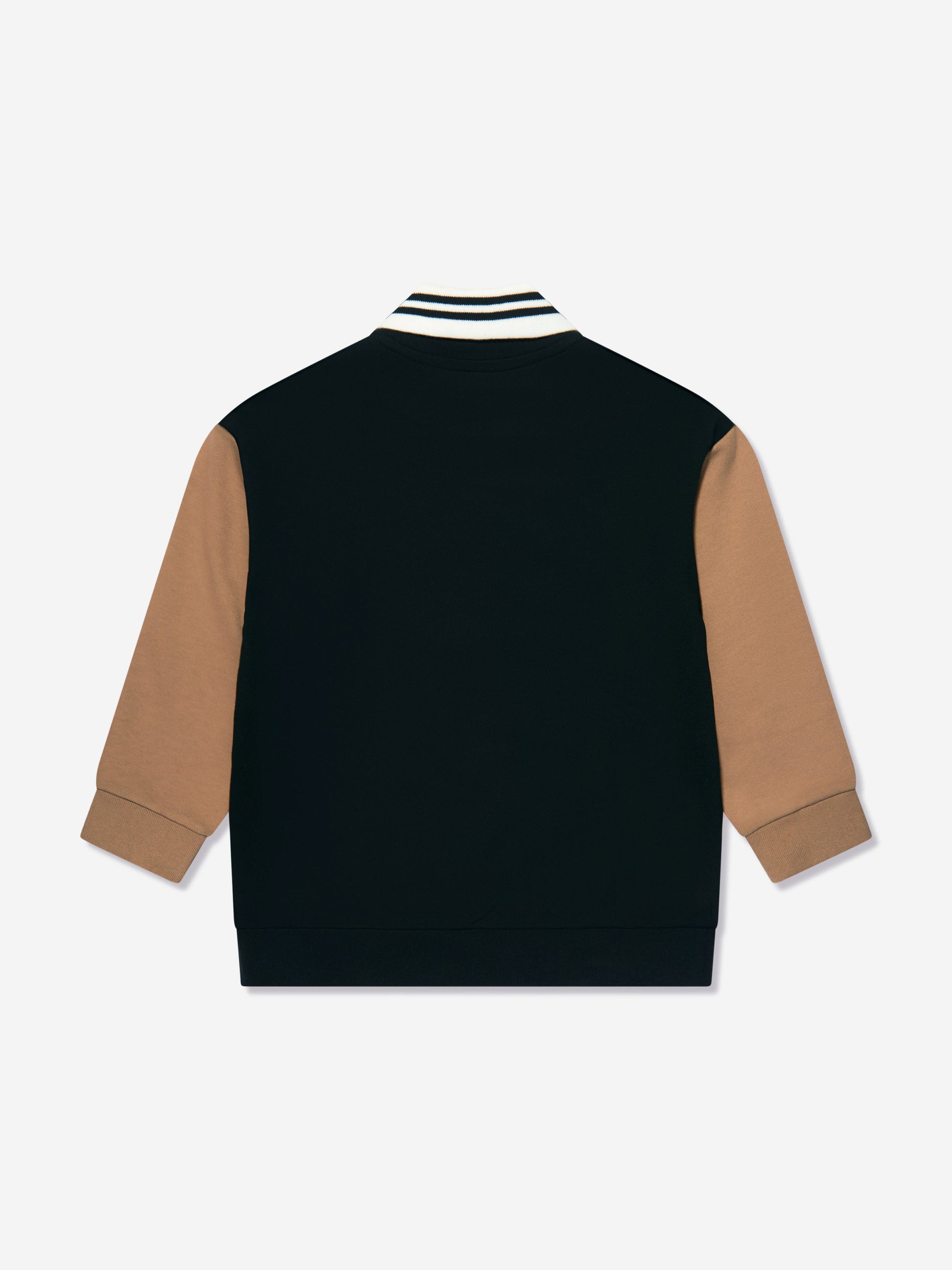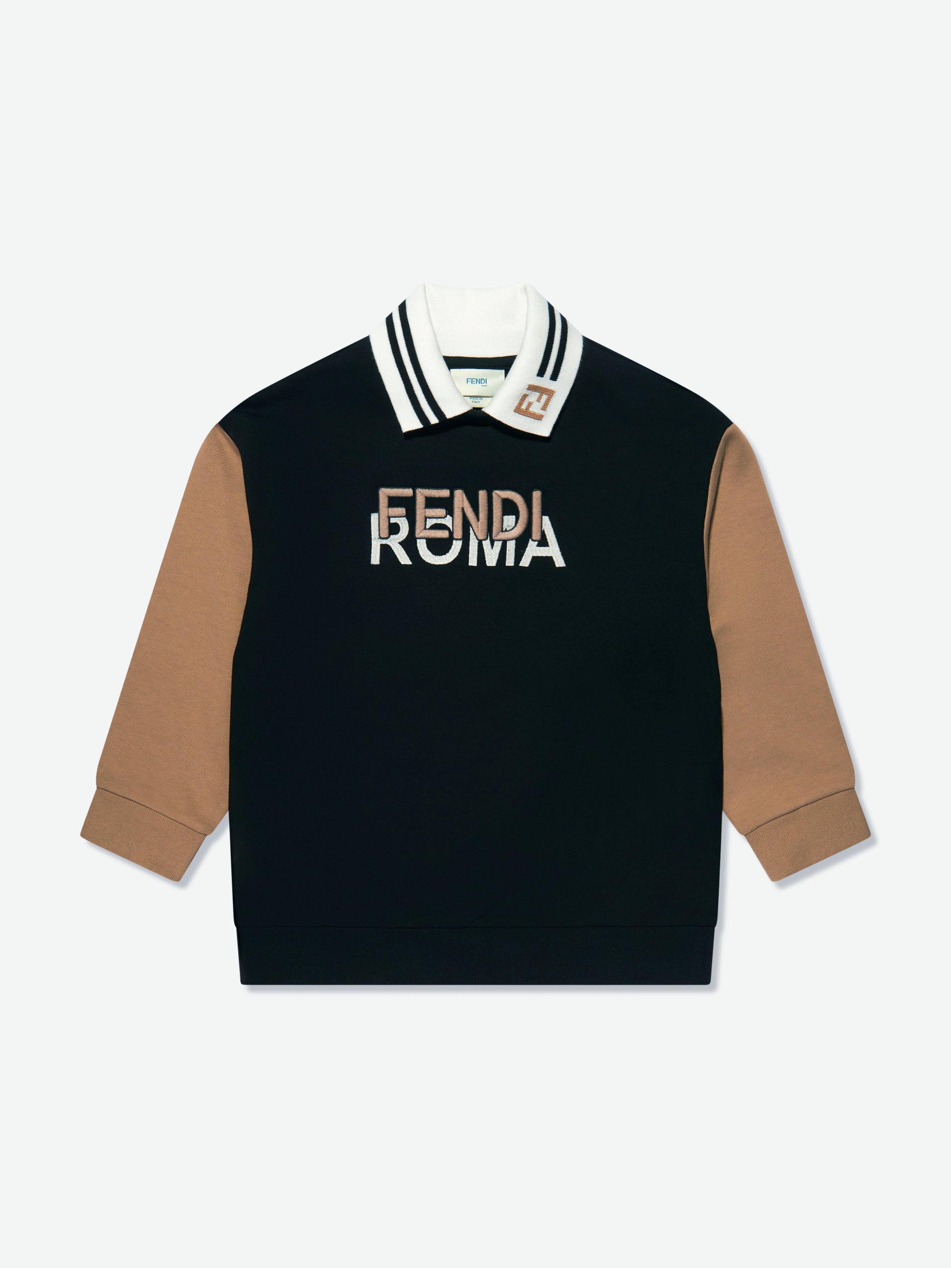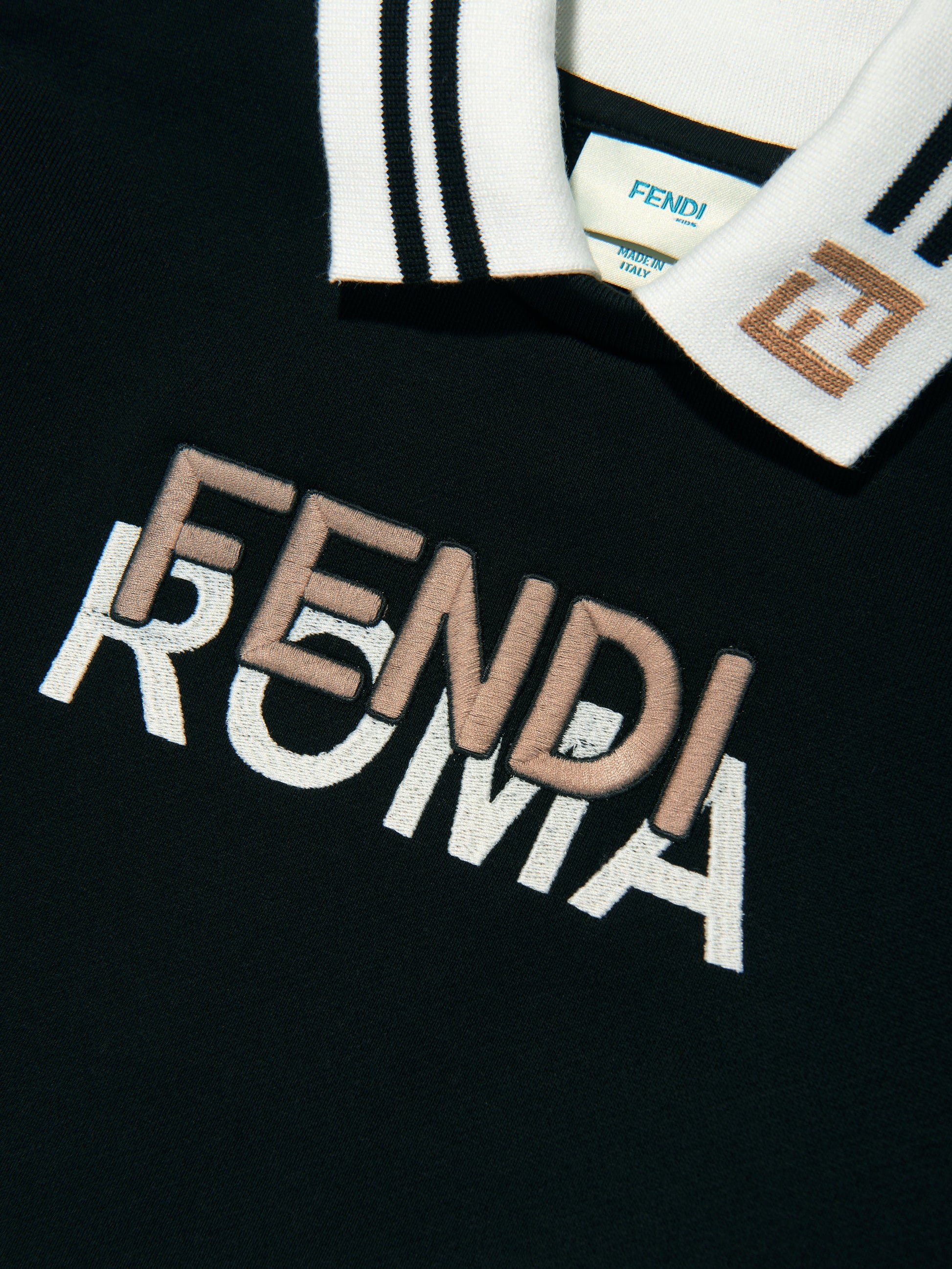 意大利奢侈品牌 Fendi 将新的美学特性融入传统抽象中。这款男孩黑色运动衫体现了精致的休闲风格。袖子为烟草色 FF 字母,针织领口为撞色,正面绣有“Fendi Roma”标志。