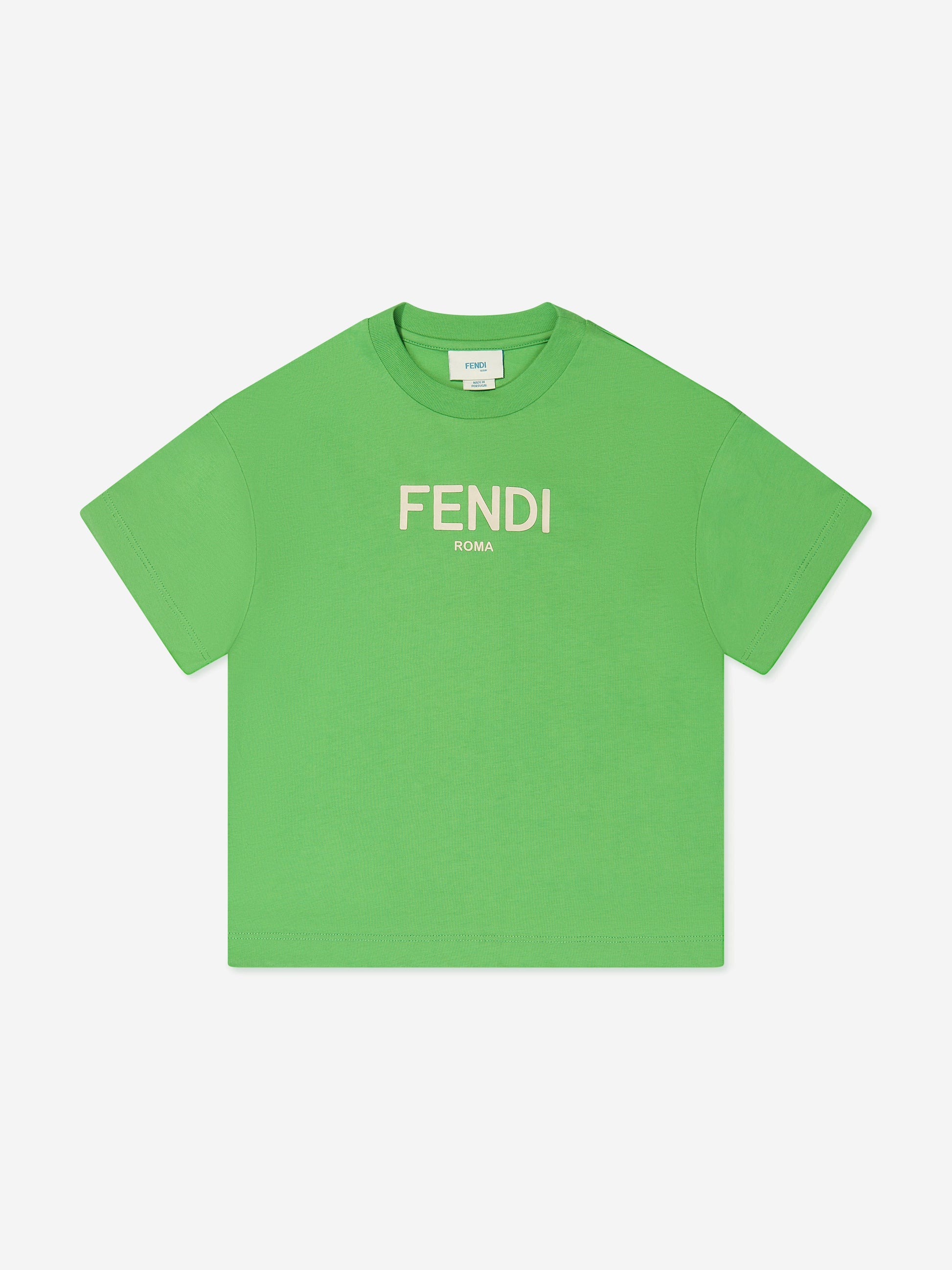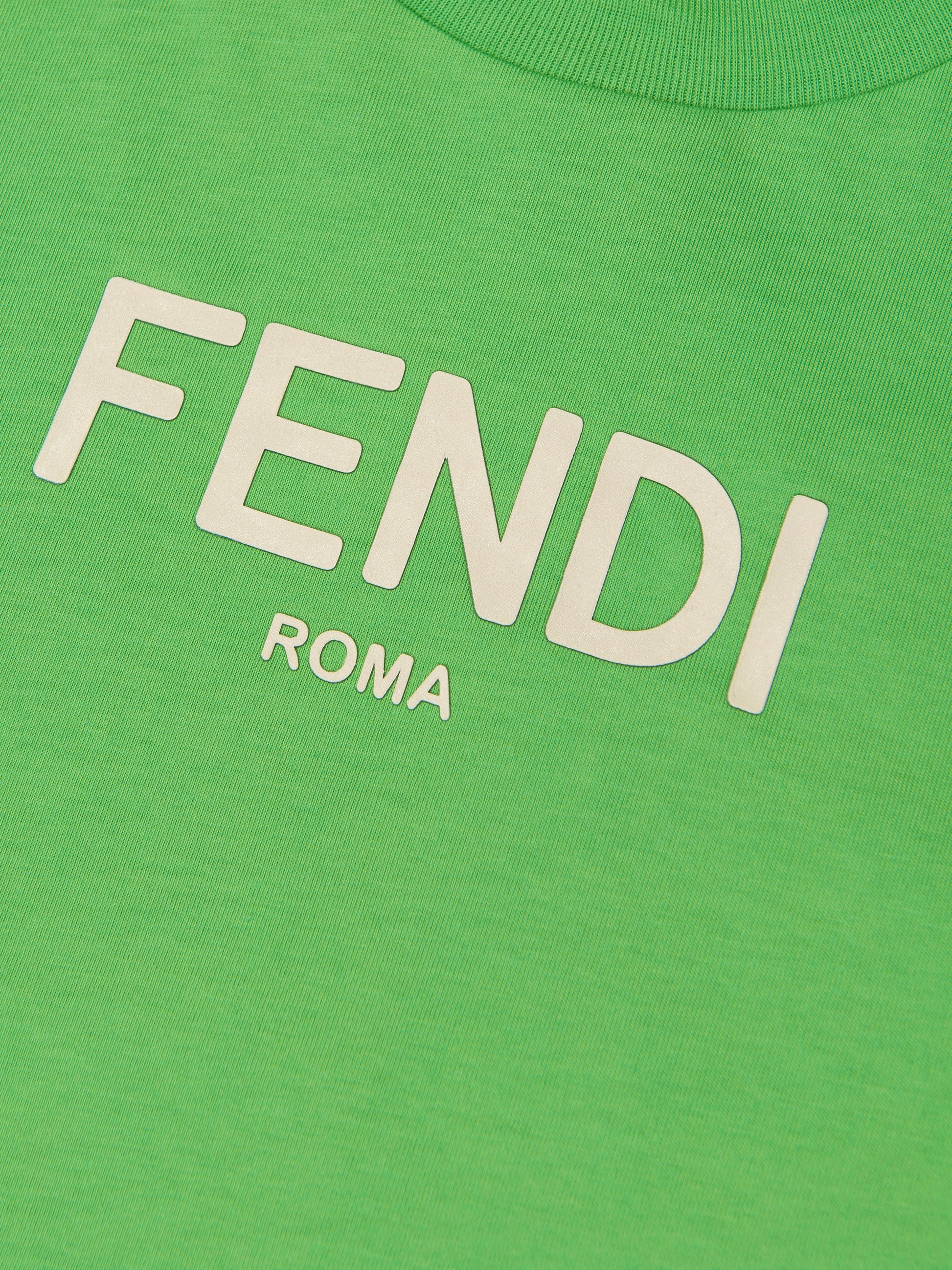 Fendi 通过这款酷炫现代的绿色儿童 T 恤展示了其著名的趣味和大胆精神。这款运动休闲主打产品正面饰有金属银色贴花徽标,更显奢华。该款产品采用柔软舒适的棉布制成,搭配墨黑色牛仔裤,打造时尚休闲造型。