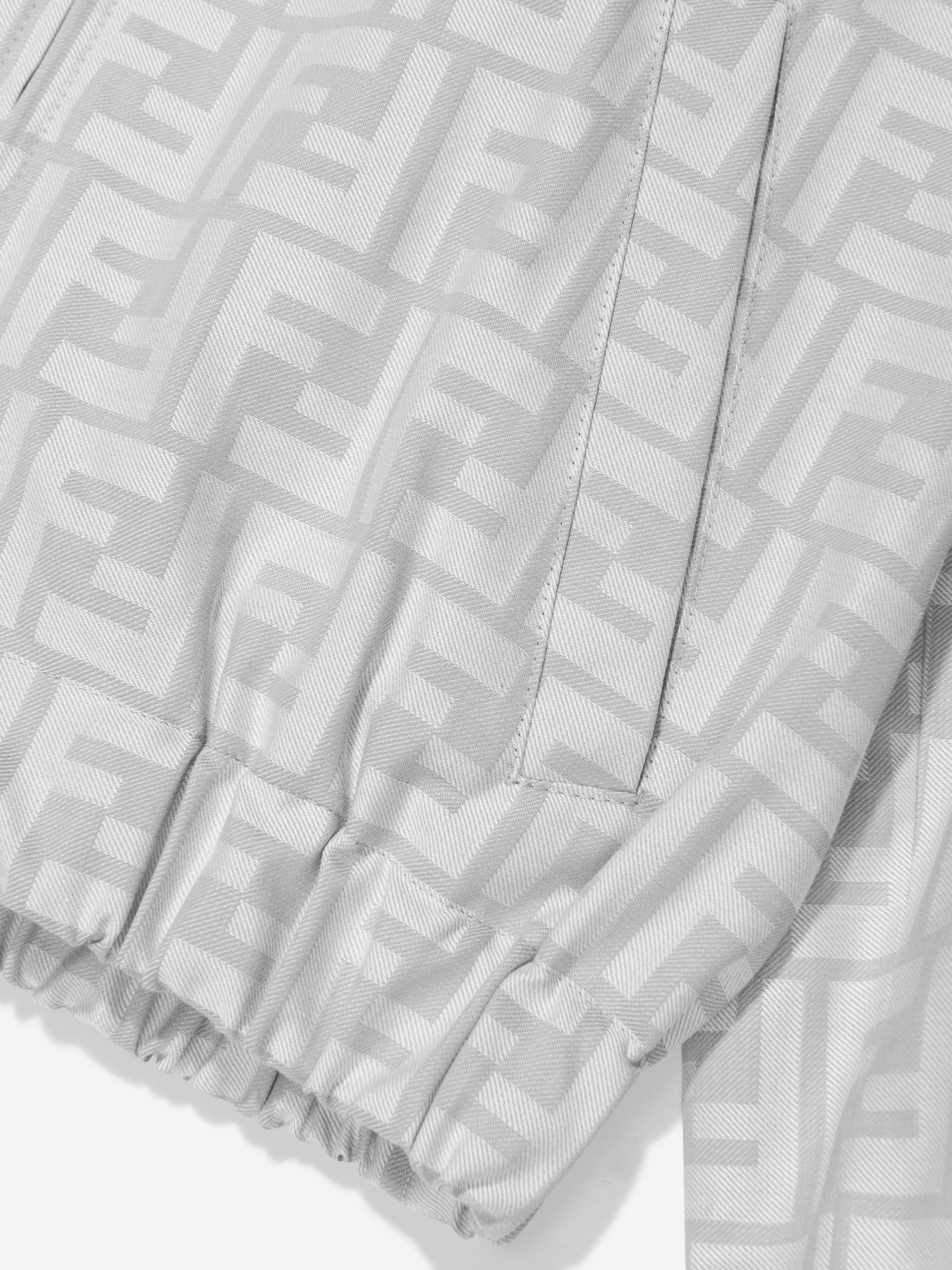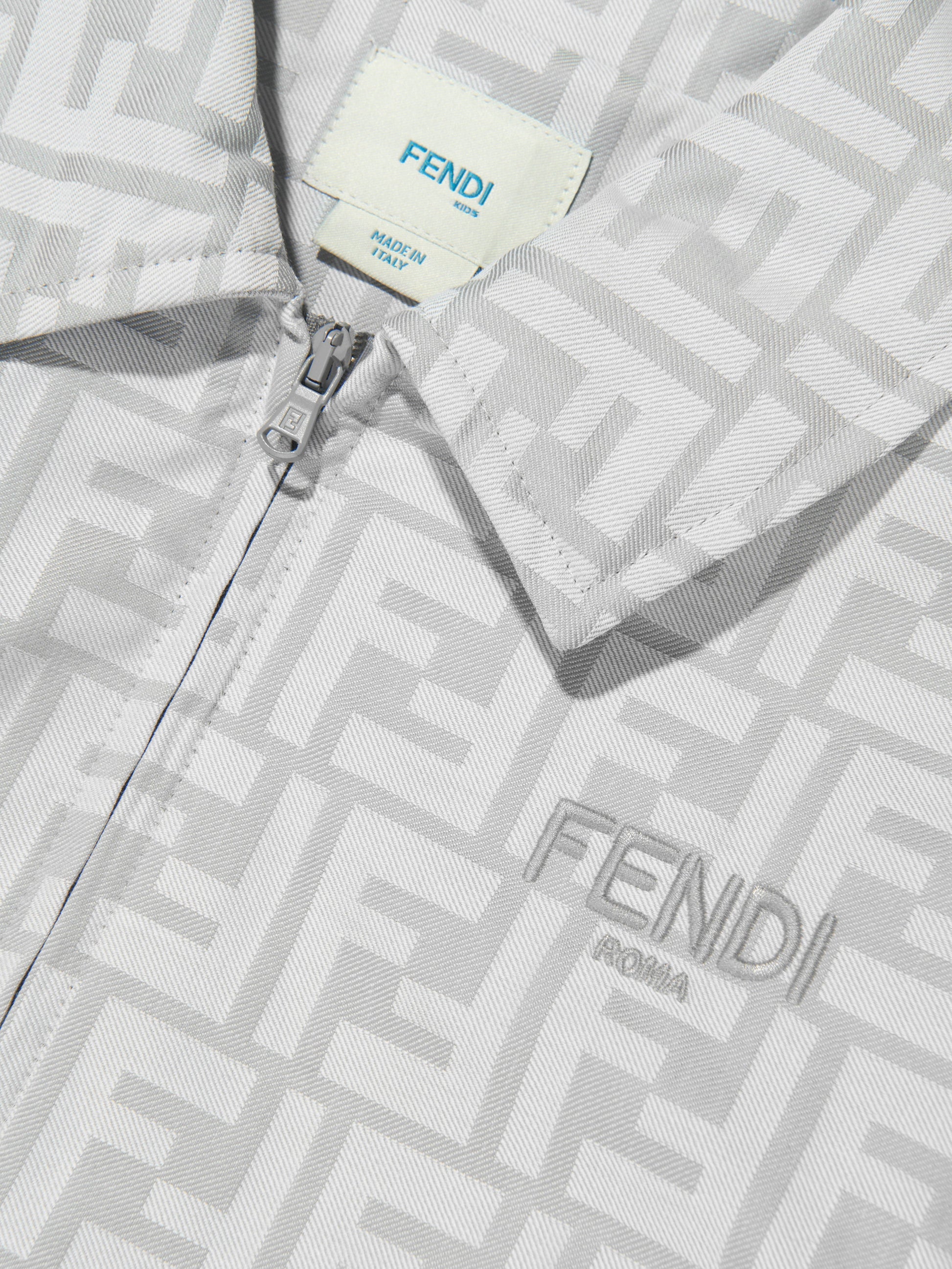 这款 Fendi 浅灰色飞行员夹克酷炫、精致、时尚,是打造休闲装扮的温文尔雅之选。该款夹克采用柔软奢华的棉麻混纺面料制成,以著名的 FF 字母作为全身同色印花。胸前饰有同色刺绣徽标,尽显优雅设计。