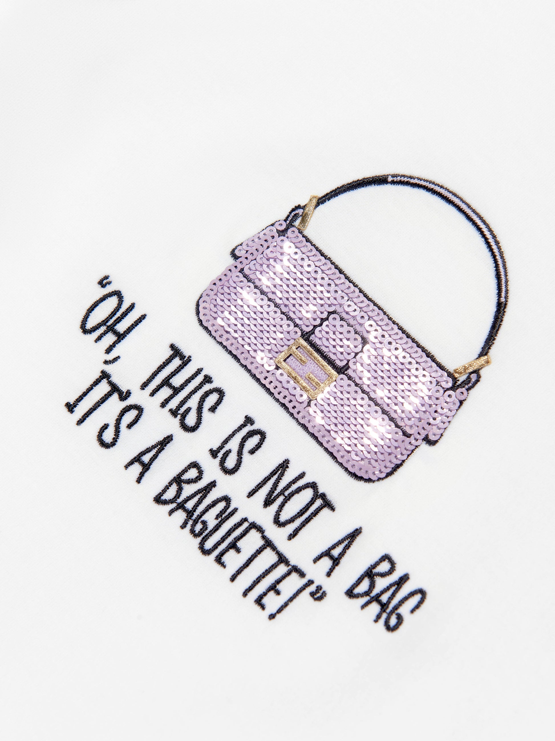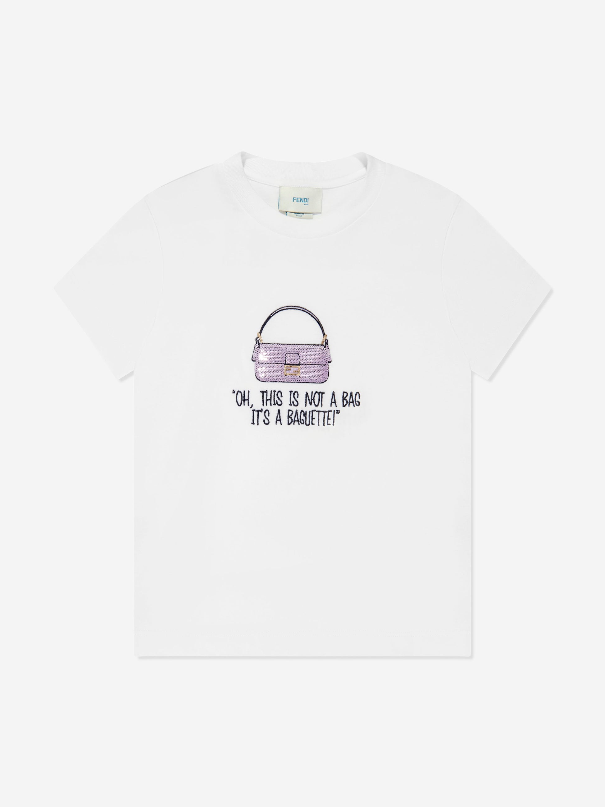 优雅与舒适的完美融合——芬迪 (Fendi) 女童象牙色、白色包袋印花 T 恤!这款独特的 T 恤具有以下特点,可为您的小宝贝的服装增添亮色:
