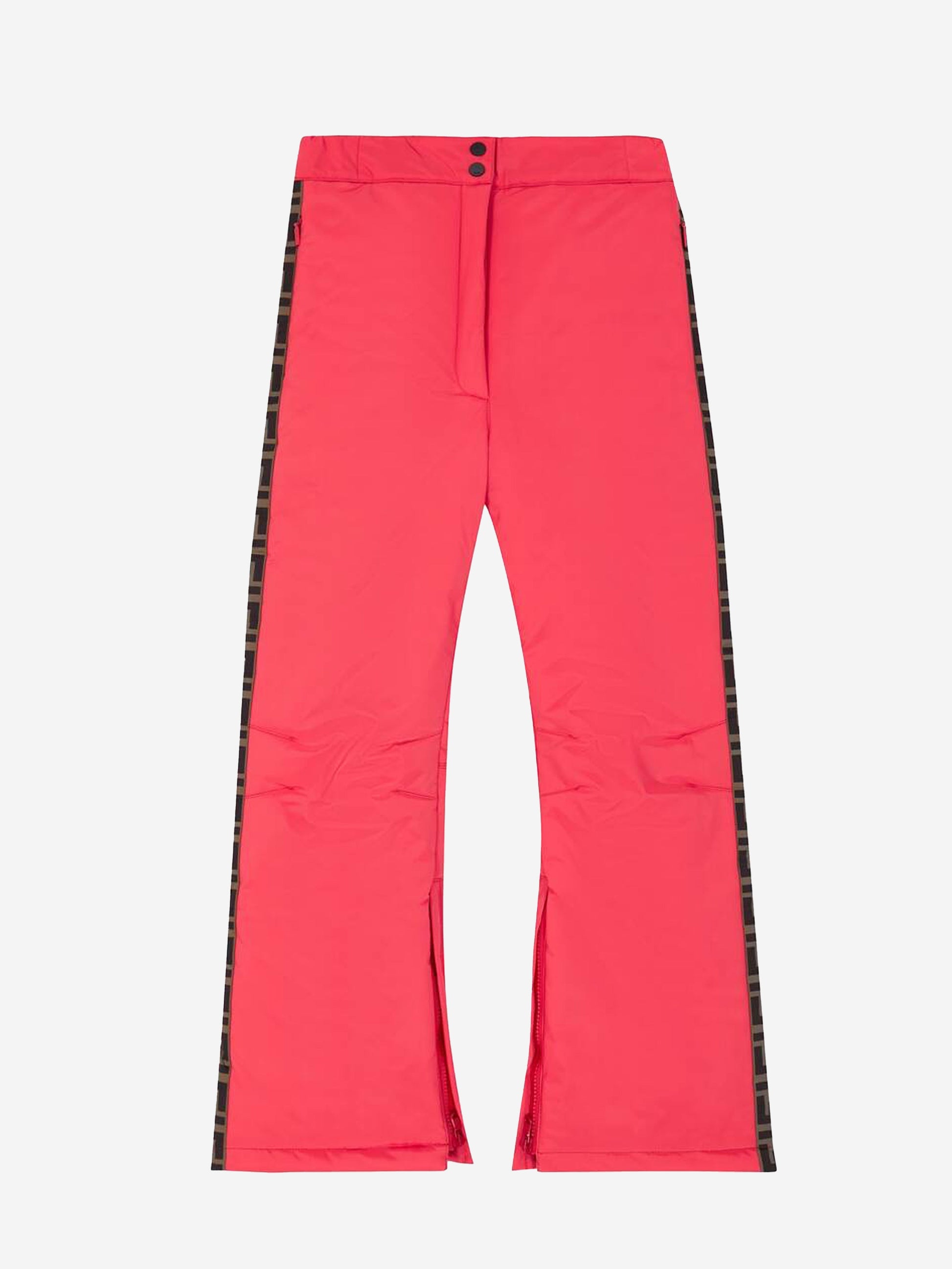 介绍时尚的 Fendi 女童 FF 徽标饰边红色滑雪裤。这款裤子专为冬季风格和舒适而设计,是任何时尚前卫儿童的必备单品。主要特点包括: