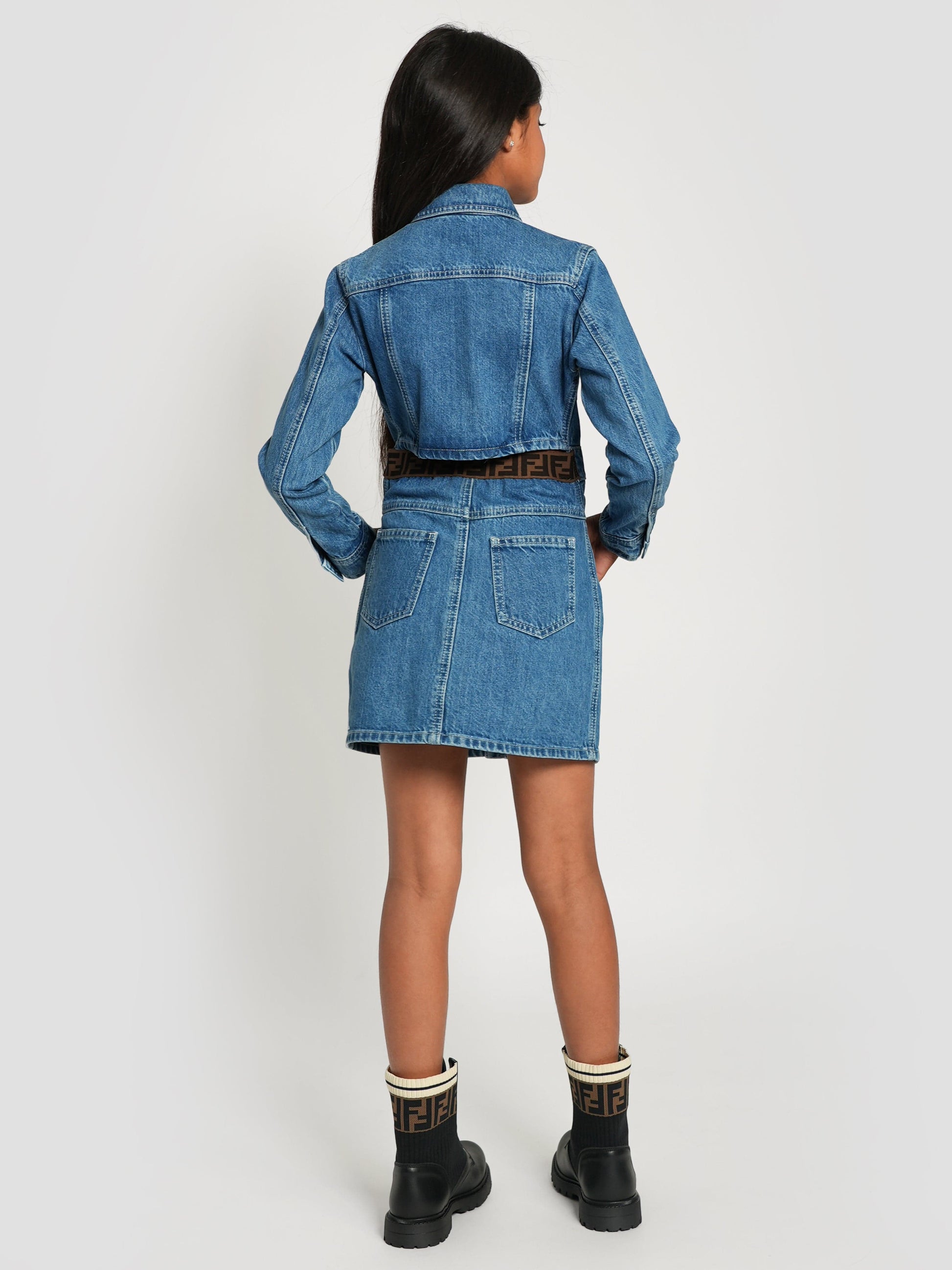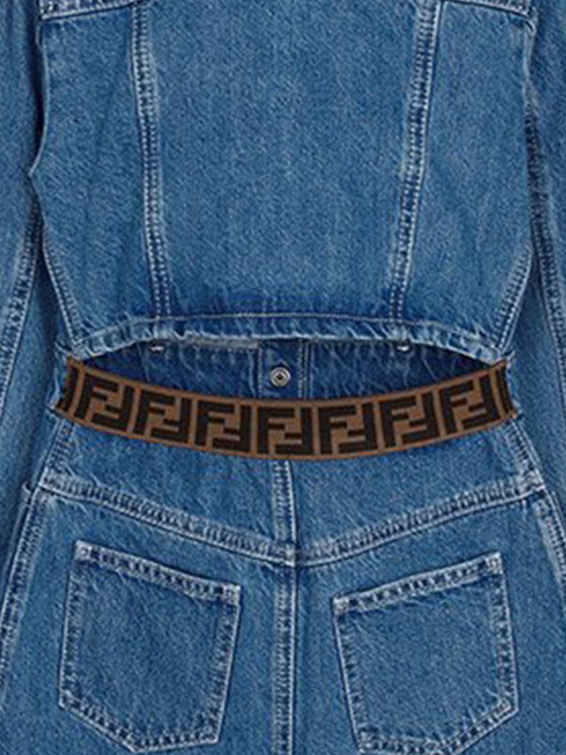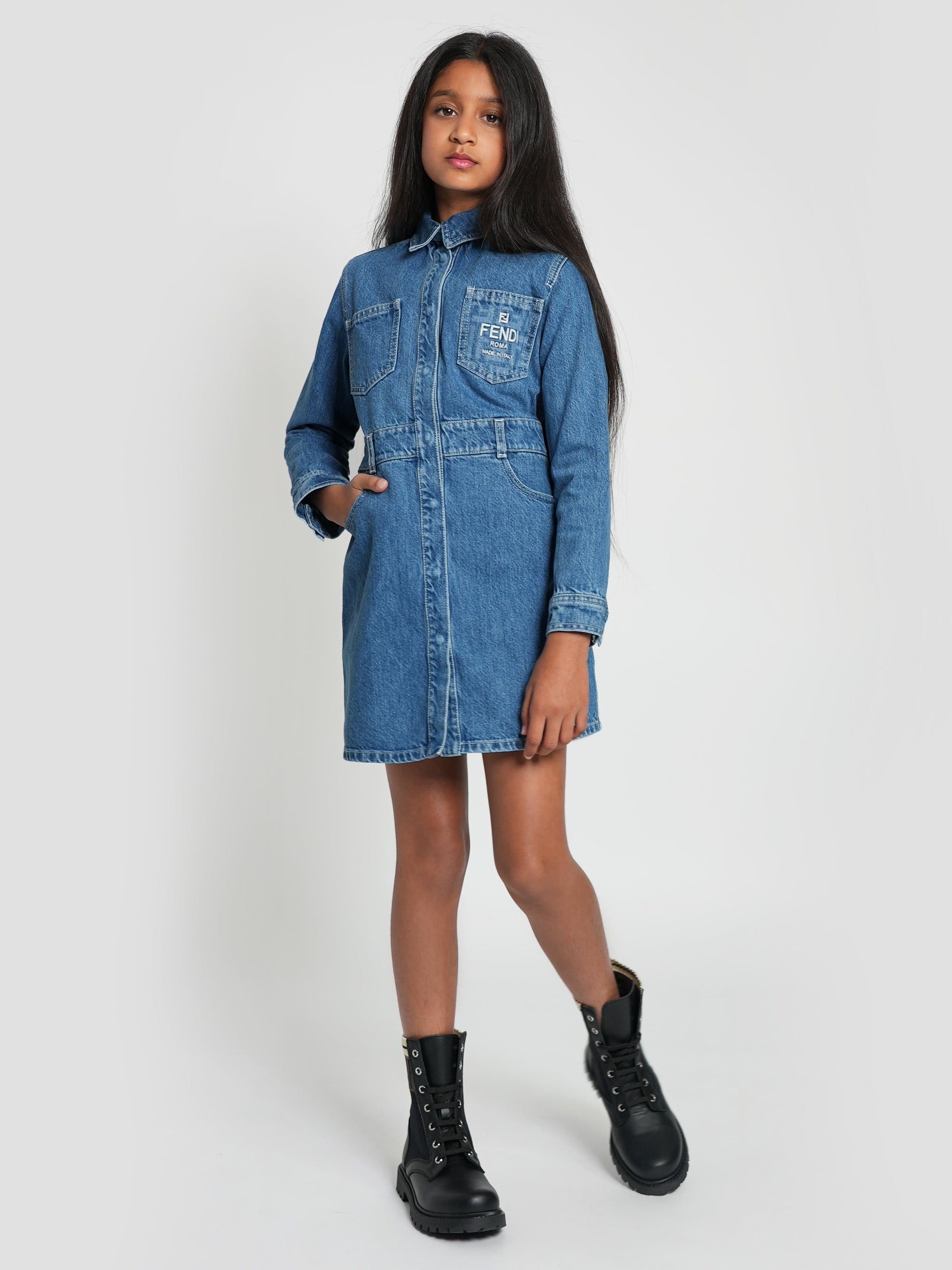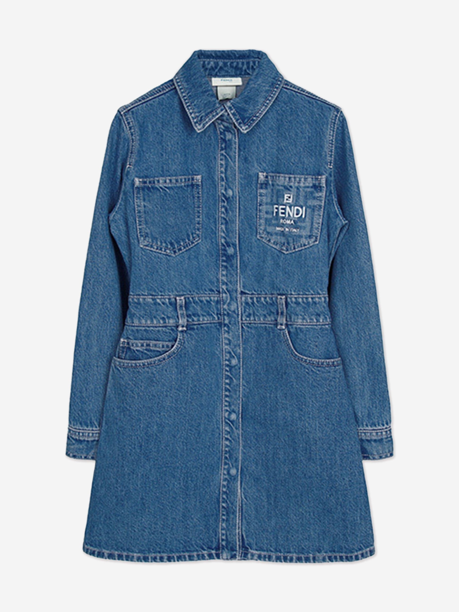 Fendi embody high quality craftsmanship designs with refined elegance. This girls shirt dress captures the luxury Italian label's preference for sleek, uncomplicated fashion. Crafted in beautiful denim cotton via multiple pockets. It is decorated with a white embroidered logo on the pocket and a cut out on the back with an elastic band showcasing a double FF.