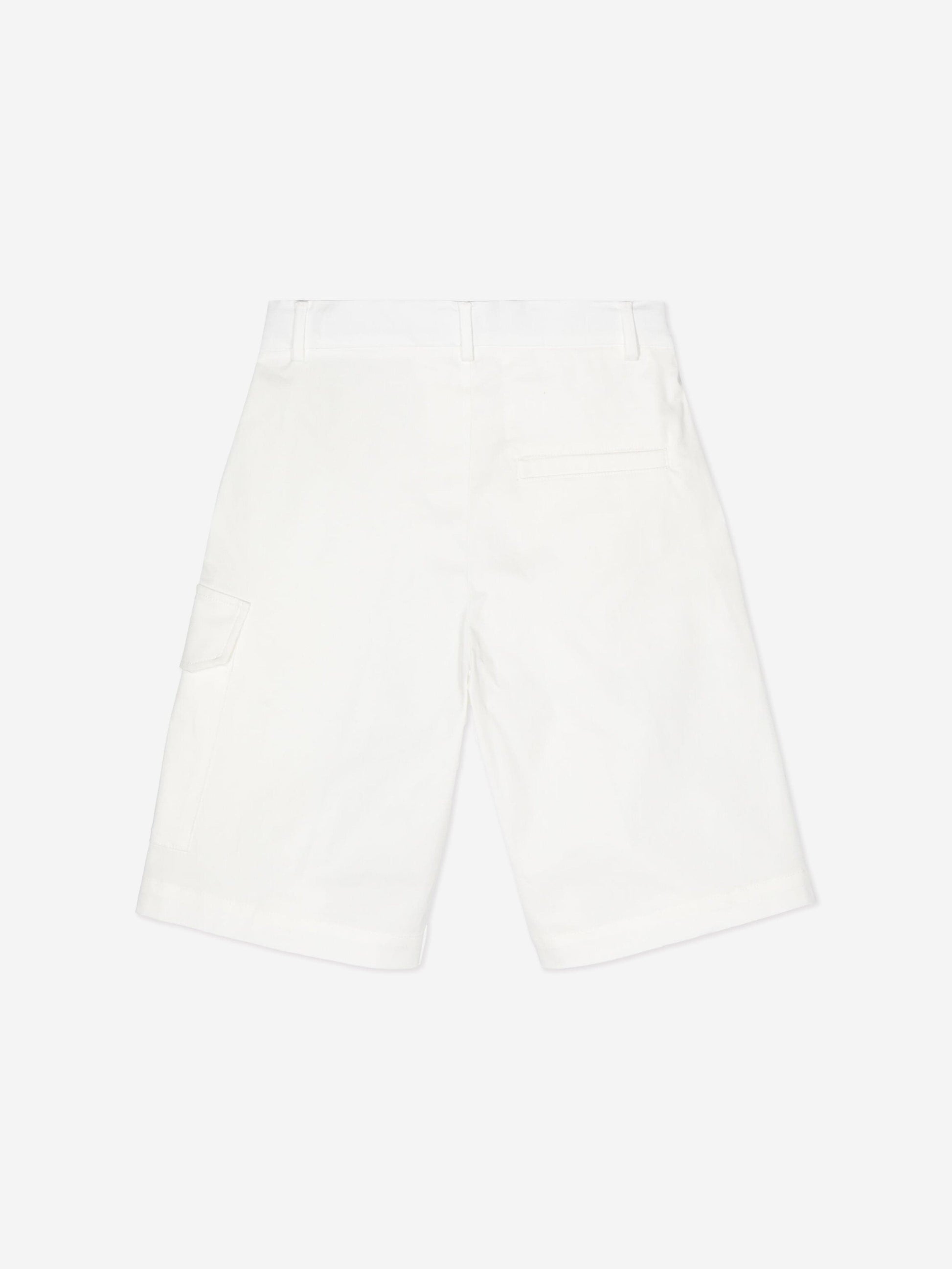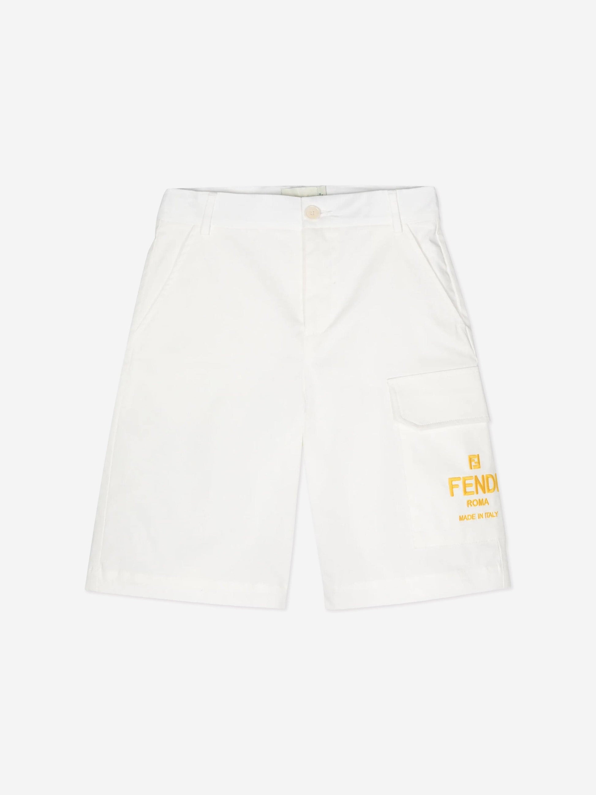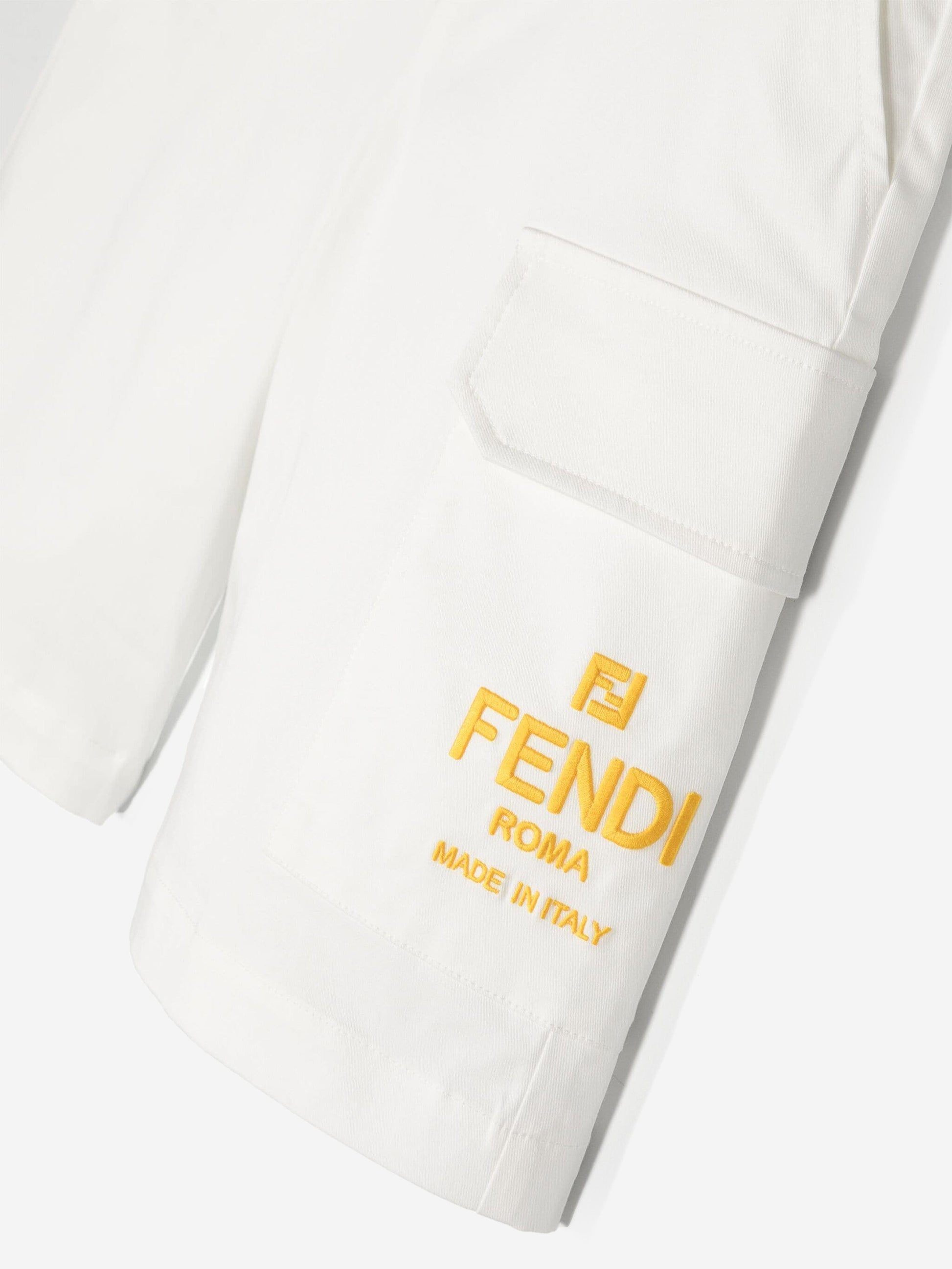 Fendi embody high quality craftsmanship designs with refined elegance. These boys shorts capture the luxury Italian label's preference for sleek, uncomplicated fashion. Envisioned in white stretch gabardine Bermudas. They come with side pockets featuring bellow Fendi Roma embroidery.