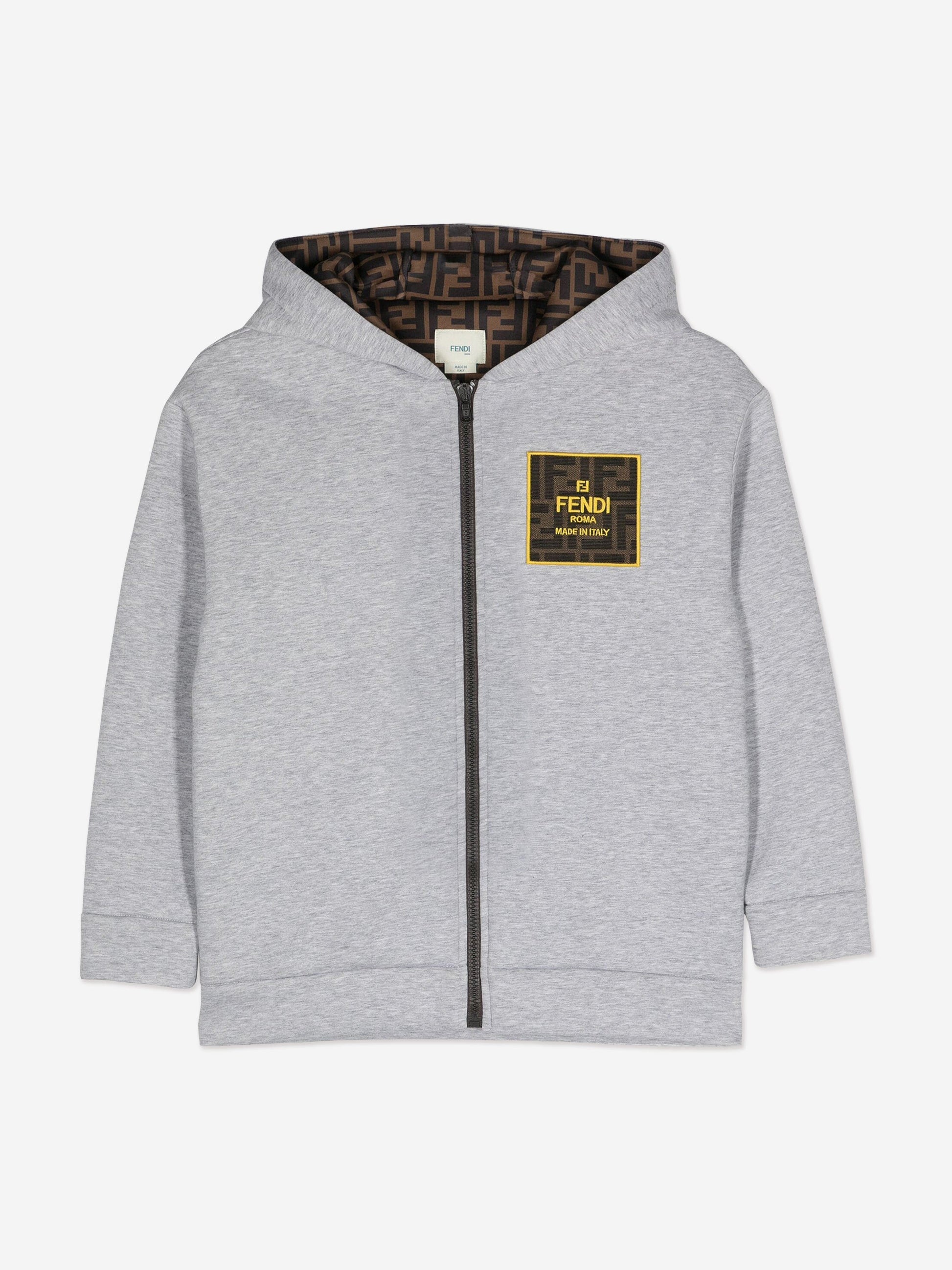 Fendi incorporate the traditional with the modern. This boys hoodie captures the Italian label's reconceptualised outlook on utilitarian fashion. Crafted in beautiful high quality grey cotton via an embroidered tobacco-coloured logo at the front, sleek all-over lining and front zip pockets.