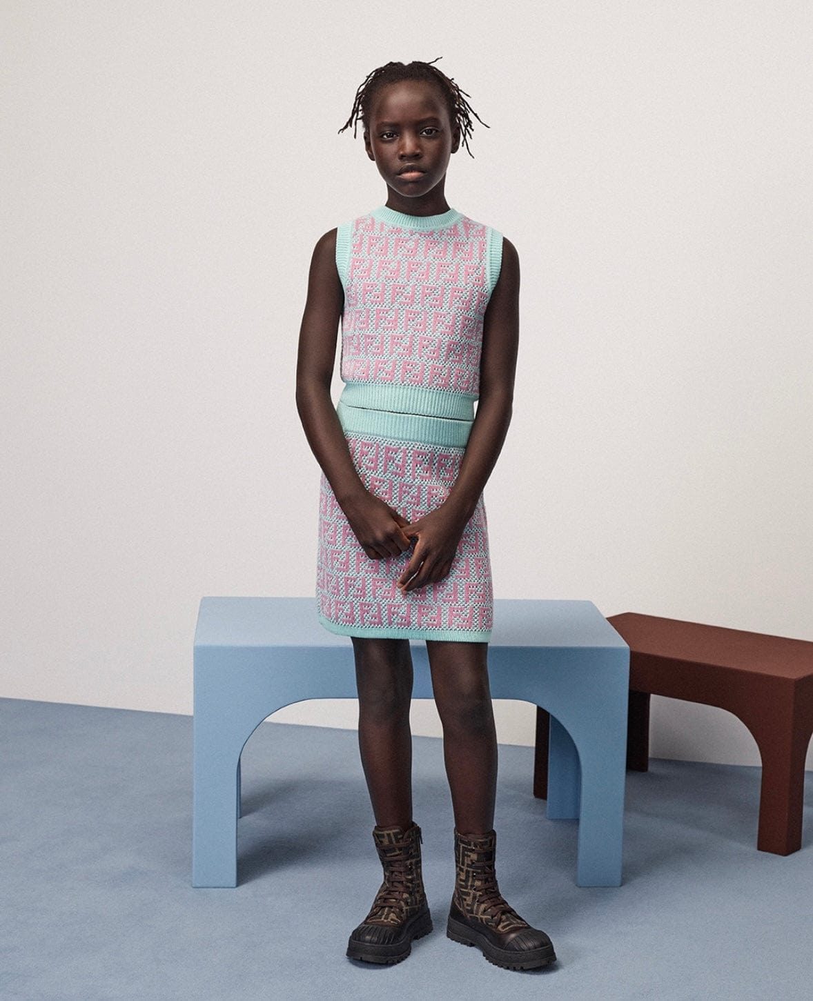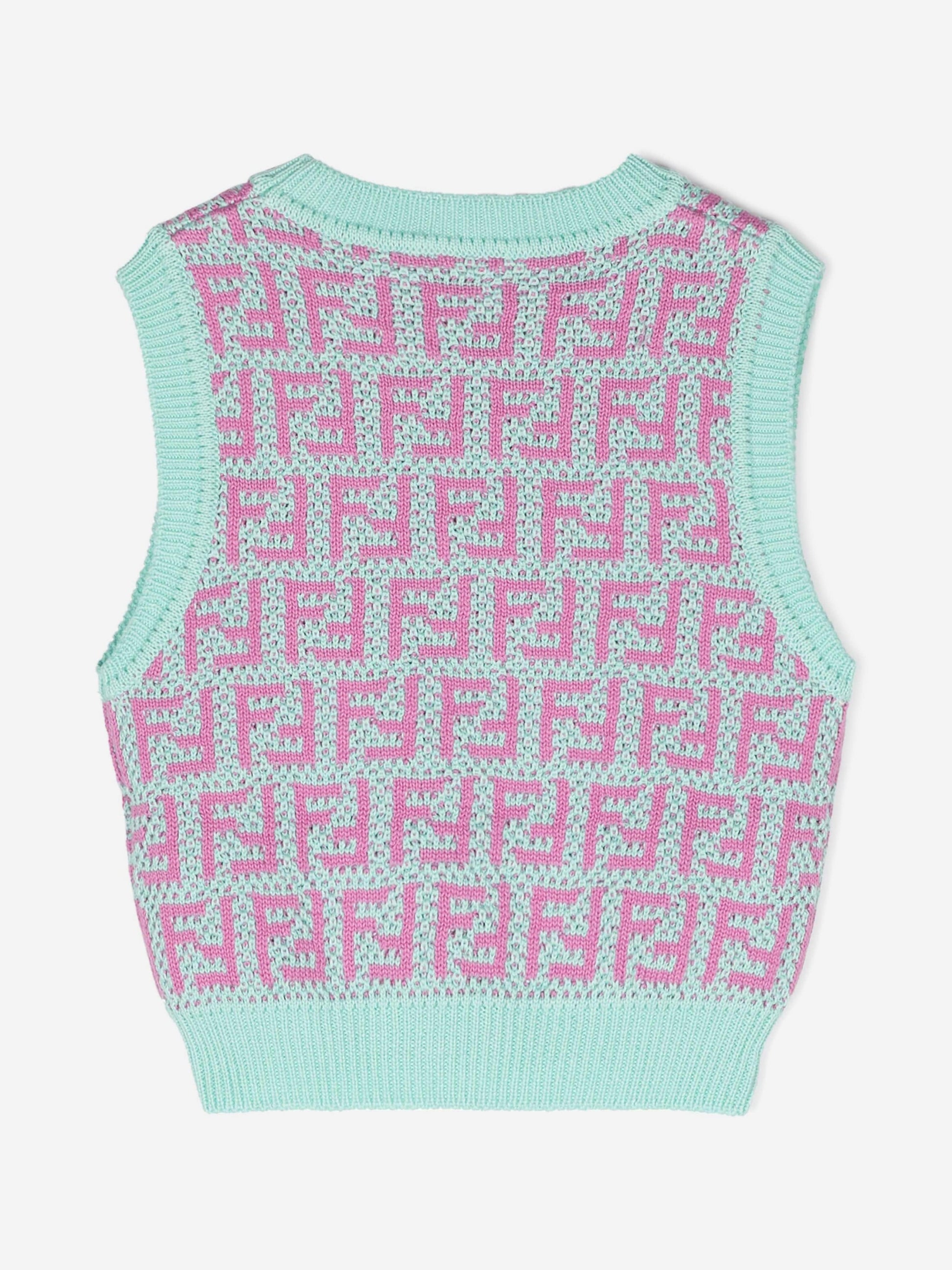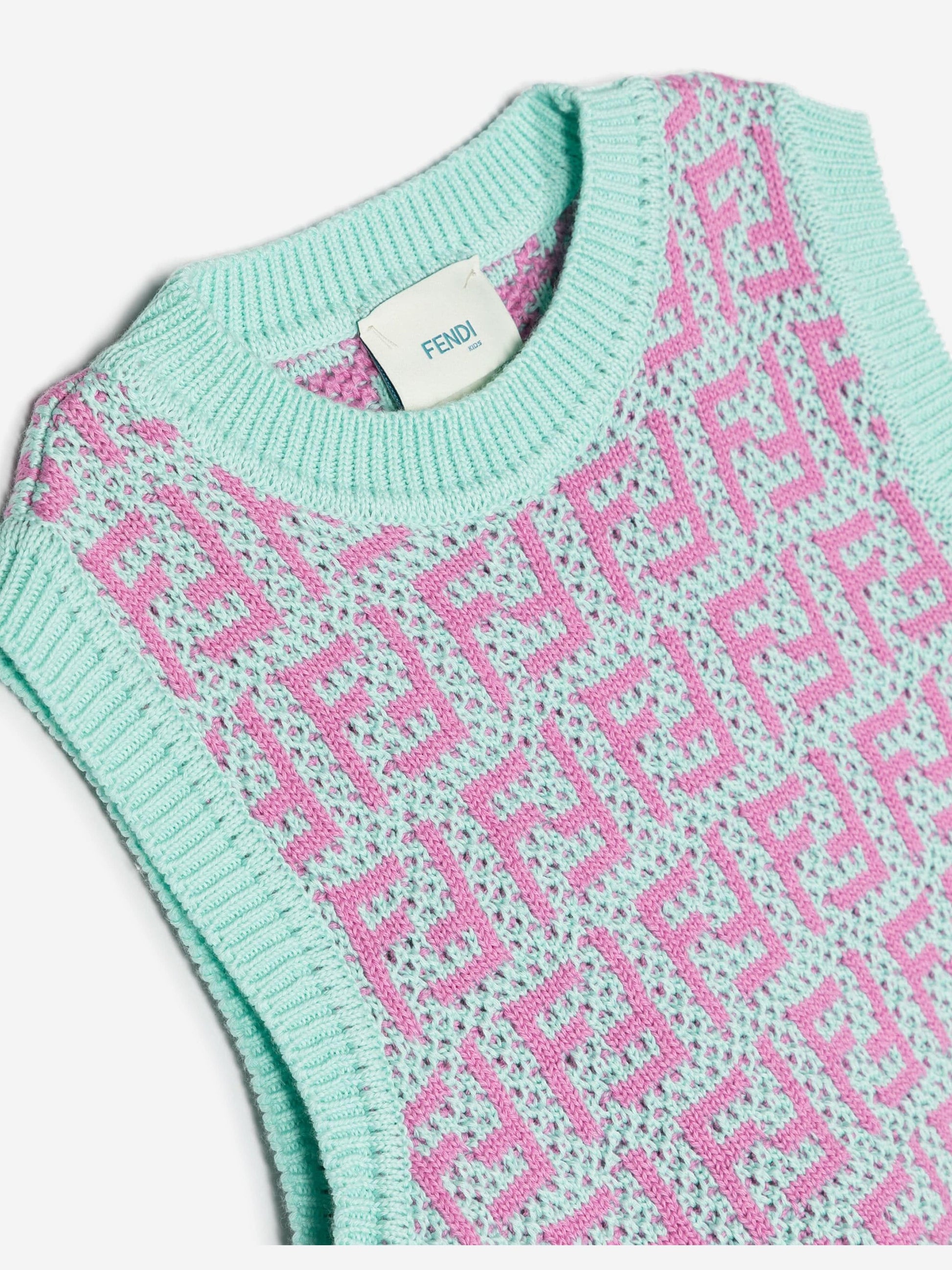 Fendi encapsulate passion and meticulous energy in their beautifully crafted Italian portraits. This girls sweater vest captures the label's unparalleled high quality and preference for monogram abstracts. Crafted in a cropped design via multicolour FF logo patterning and a crocheted cotton in pink and aquamarine.