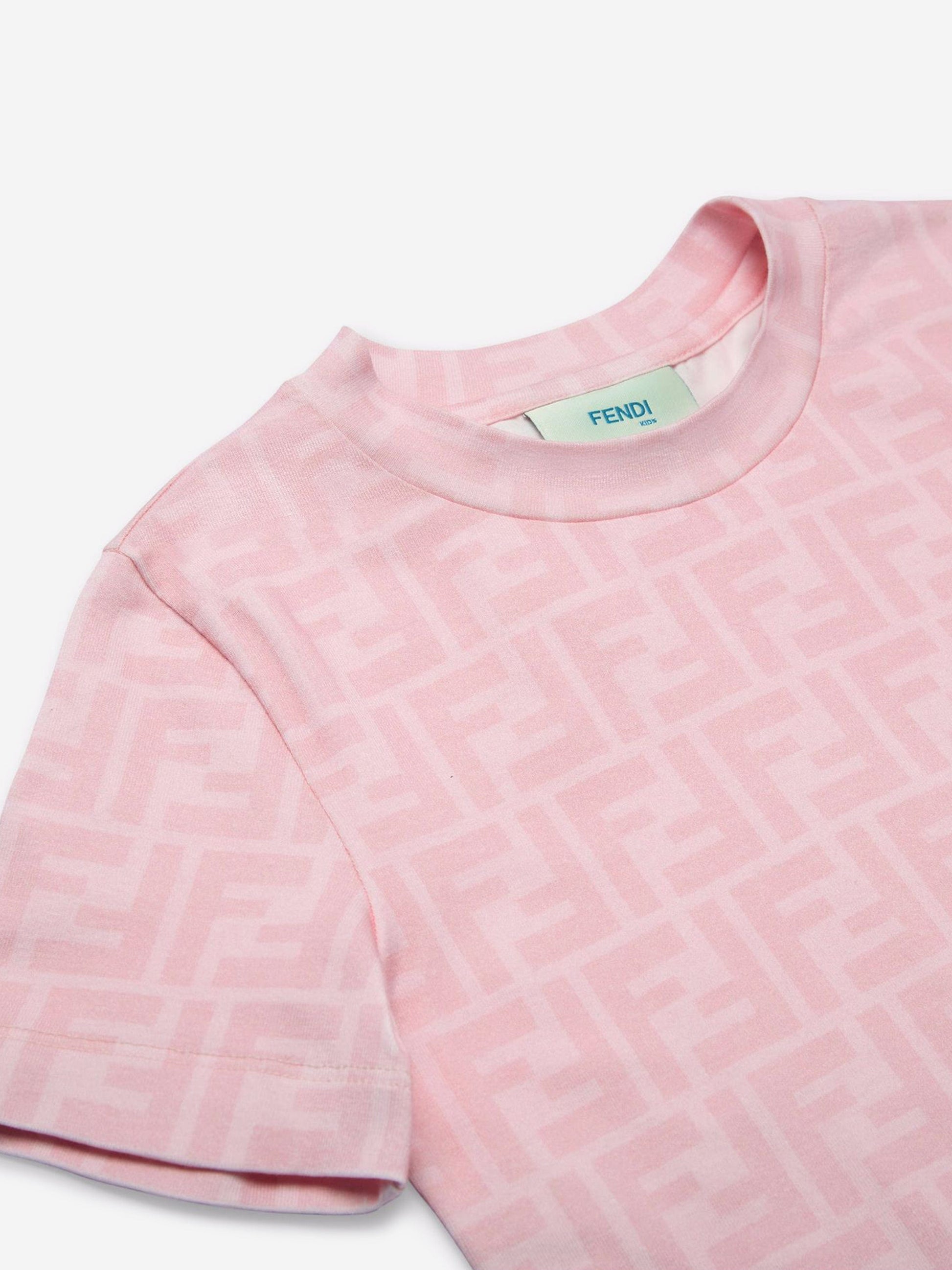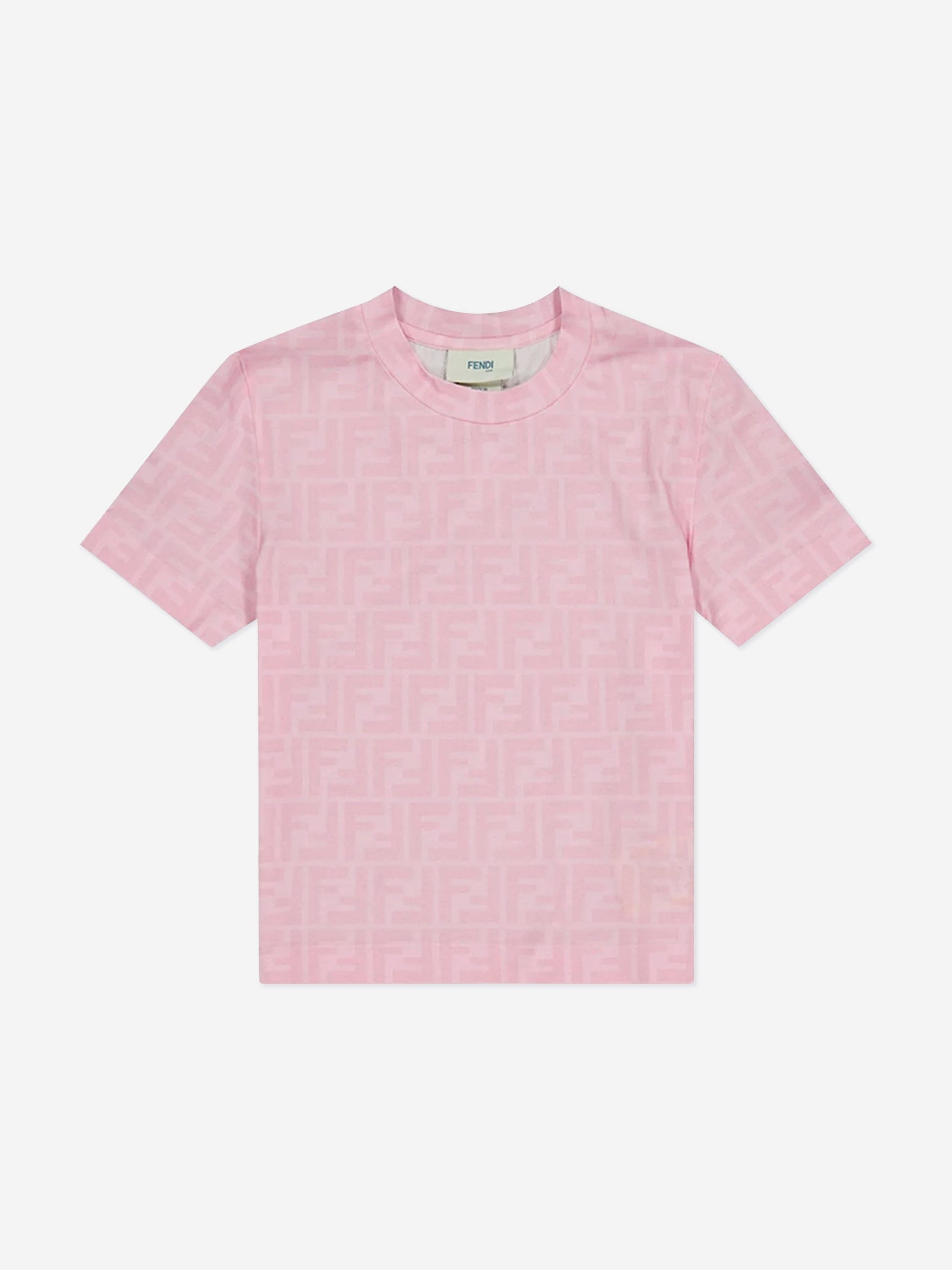 Fendi encapsulate passion and meticulous energy in their beautifully crafted Italian portraits. This girls short sleeve t-shirt is envisioned in pink cotton jersey via tone-on-tone all-over FF logo print, reflective of the label's uncomplicated yet enigmatic nature.