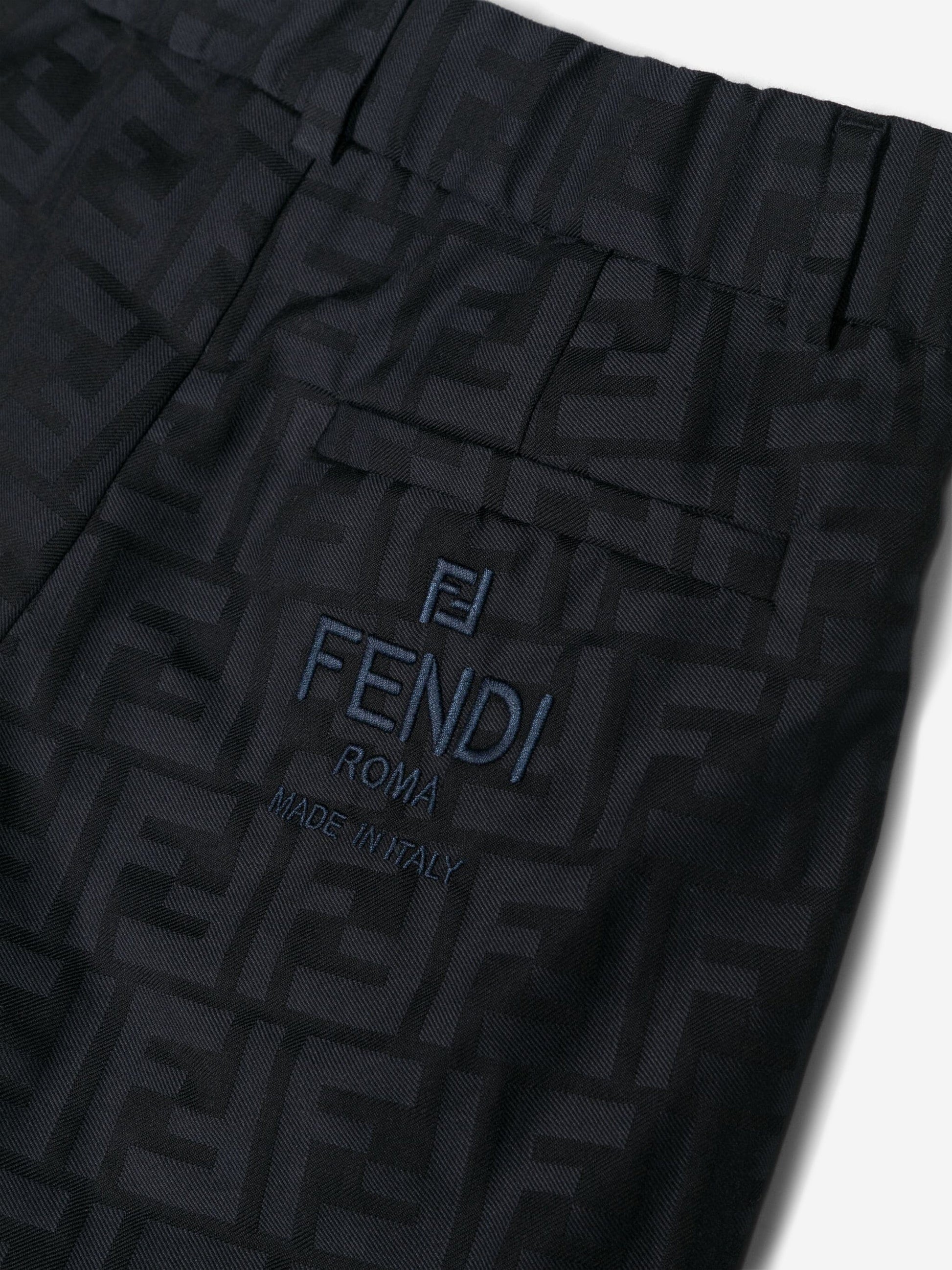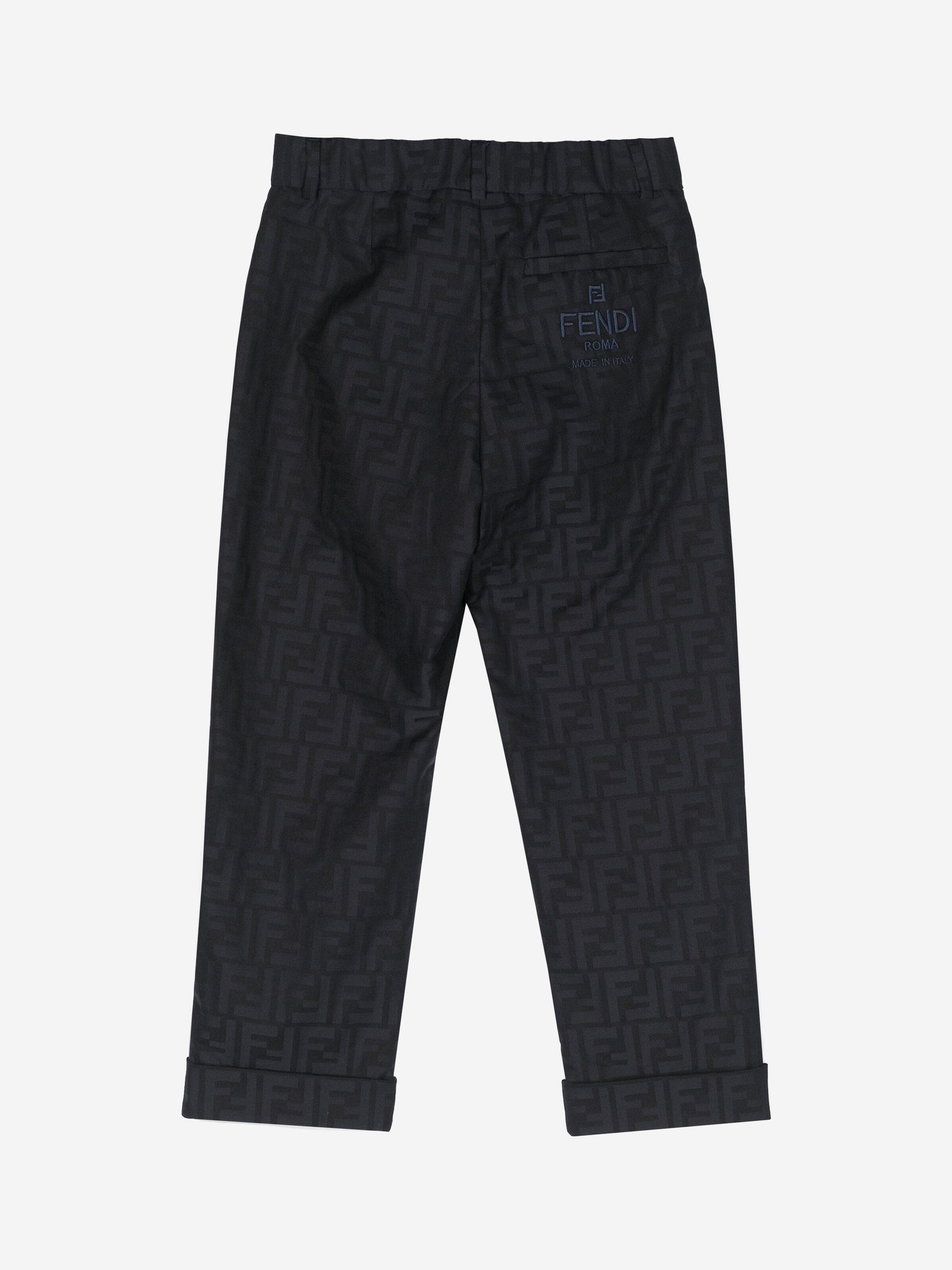 Introduce a touch of luxury to your boy's collection with the Boys FF Jacquard Trousers in Navy, exquisitely made by Fendi. Its exemplary features include:
