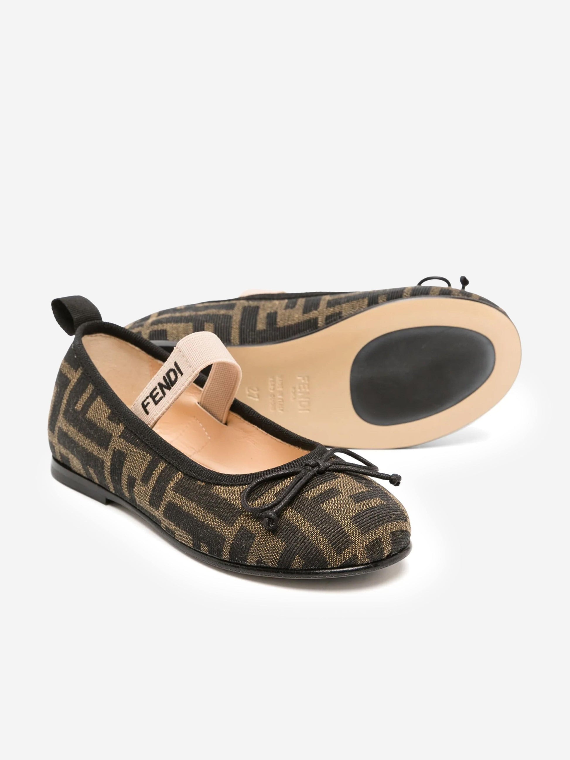 Fendi embody high quality craftsmanship designs with refined elegance. These girls ballerina pumps capture the luxury Italian label's preference for enigmatic imagery. Crafted in a round toe design and made of jacquard fabric jacket with all-over tobacco FF logo patterning. They showcase dainty bows on the front and nude-colour elastics to wrap around the insteps.