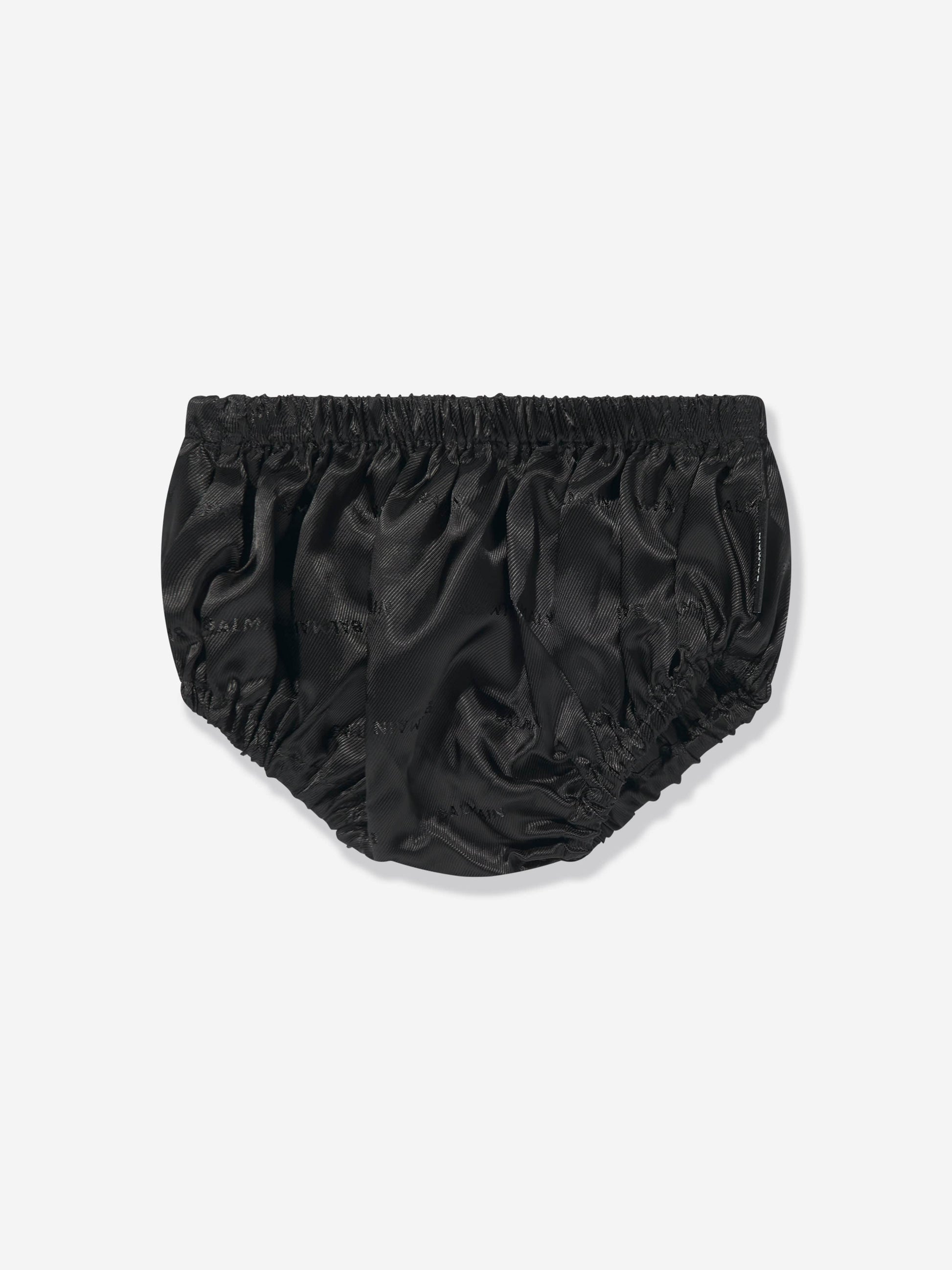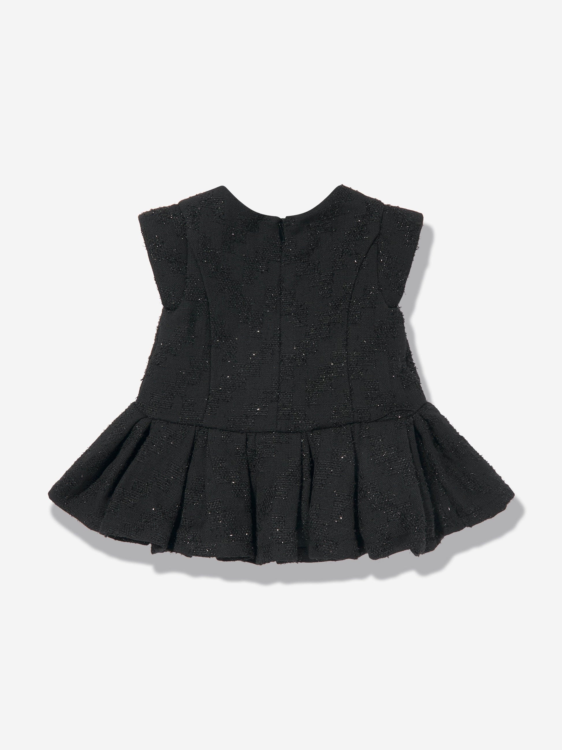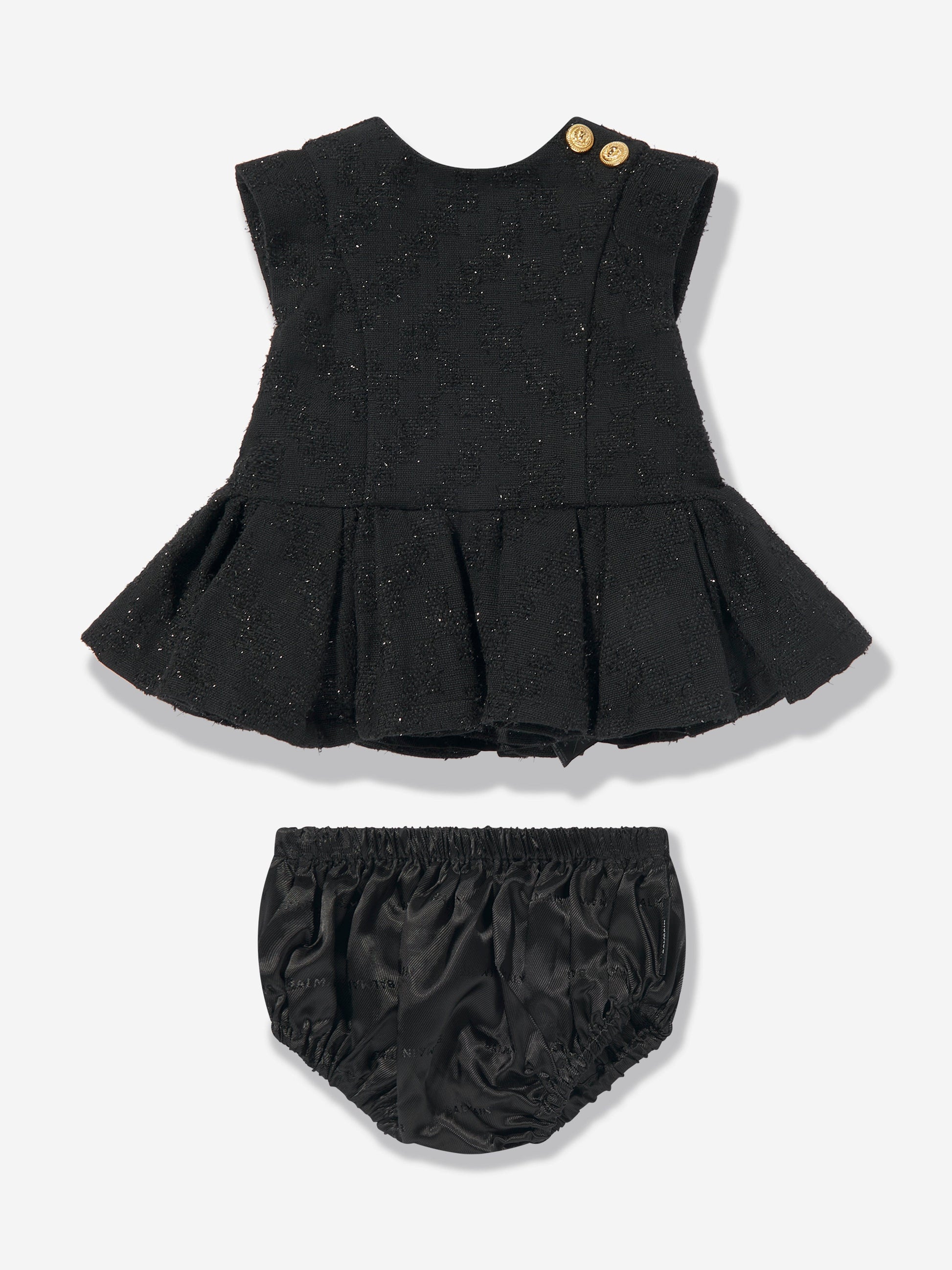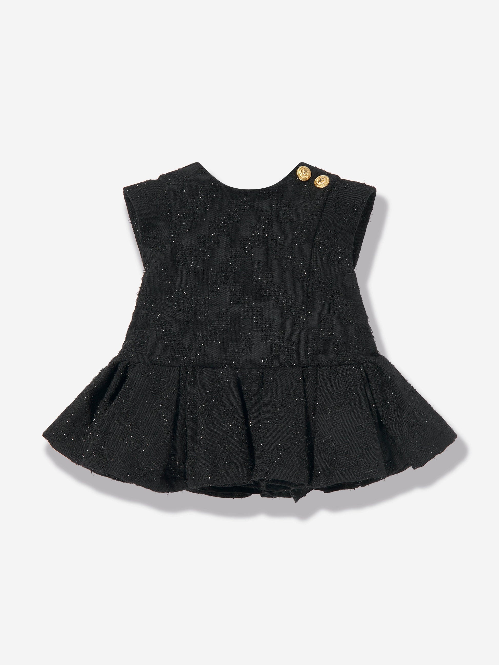温馨提示:该商品下单后不支持取消订单,请您在购买前确认商品信息无误。商品如有缺货情况,订单会自动取消退款。预计收货时间为1至2周。 Balmain project cosmopolitan sensibilities into their aesthetics. This baby girls black woven dress is a captivating construction to adore. Envisioned with a delicate structure, embellished gold buttons, a textured pattern and flared ruffle hem. Complete with matching satin Balmain print elasticated bloomers. She will look and feel divine.