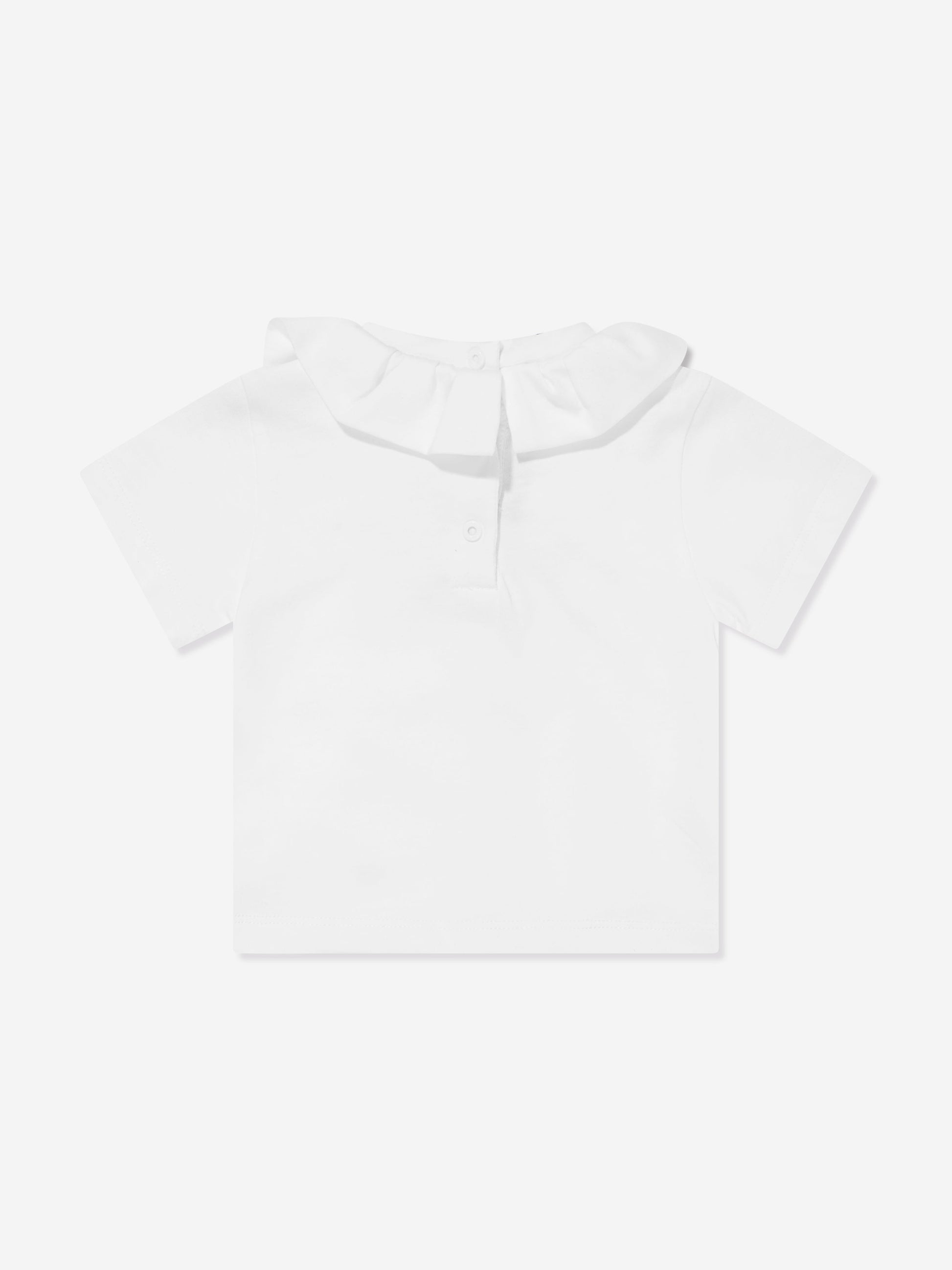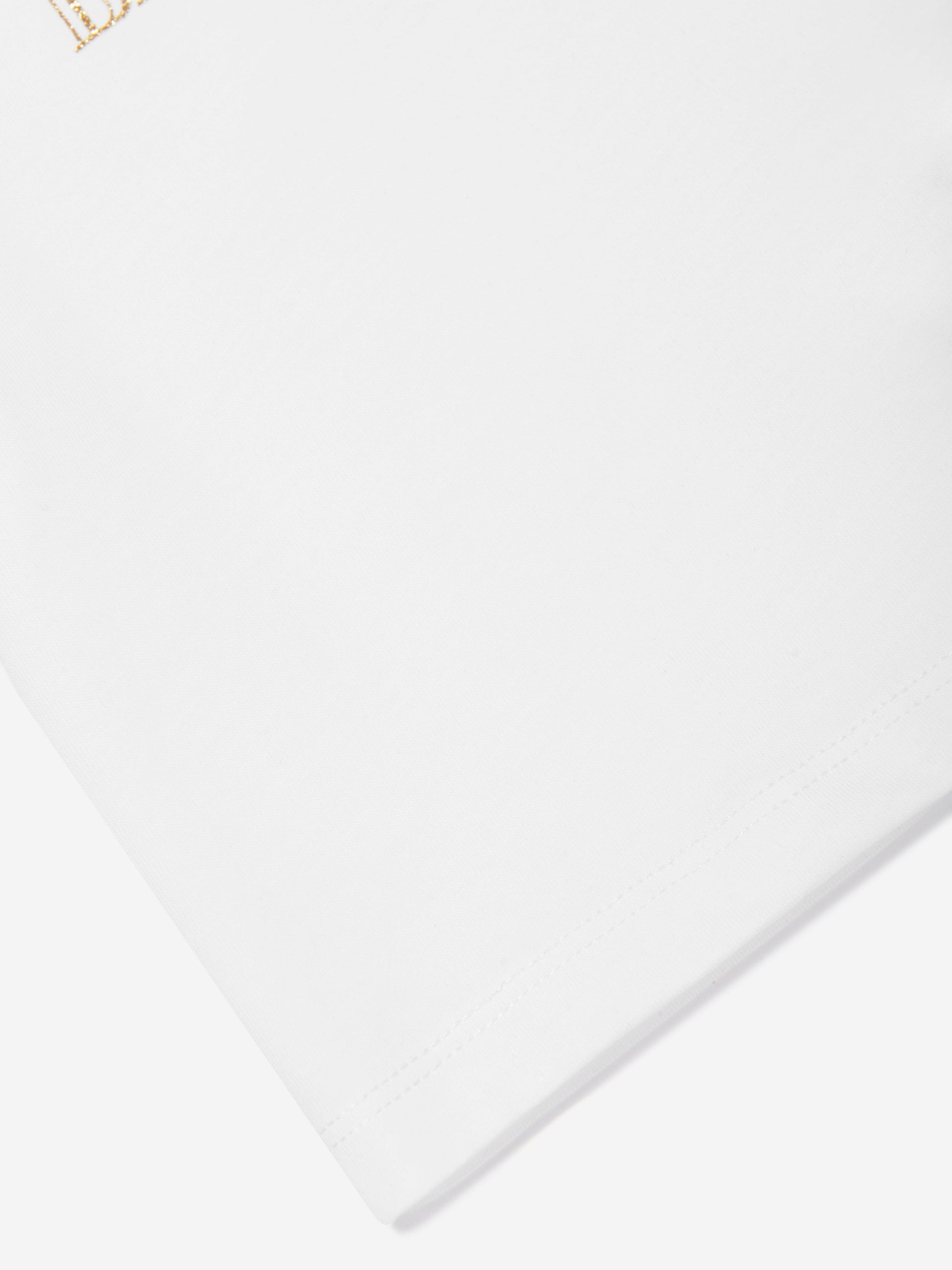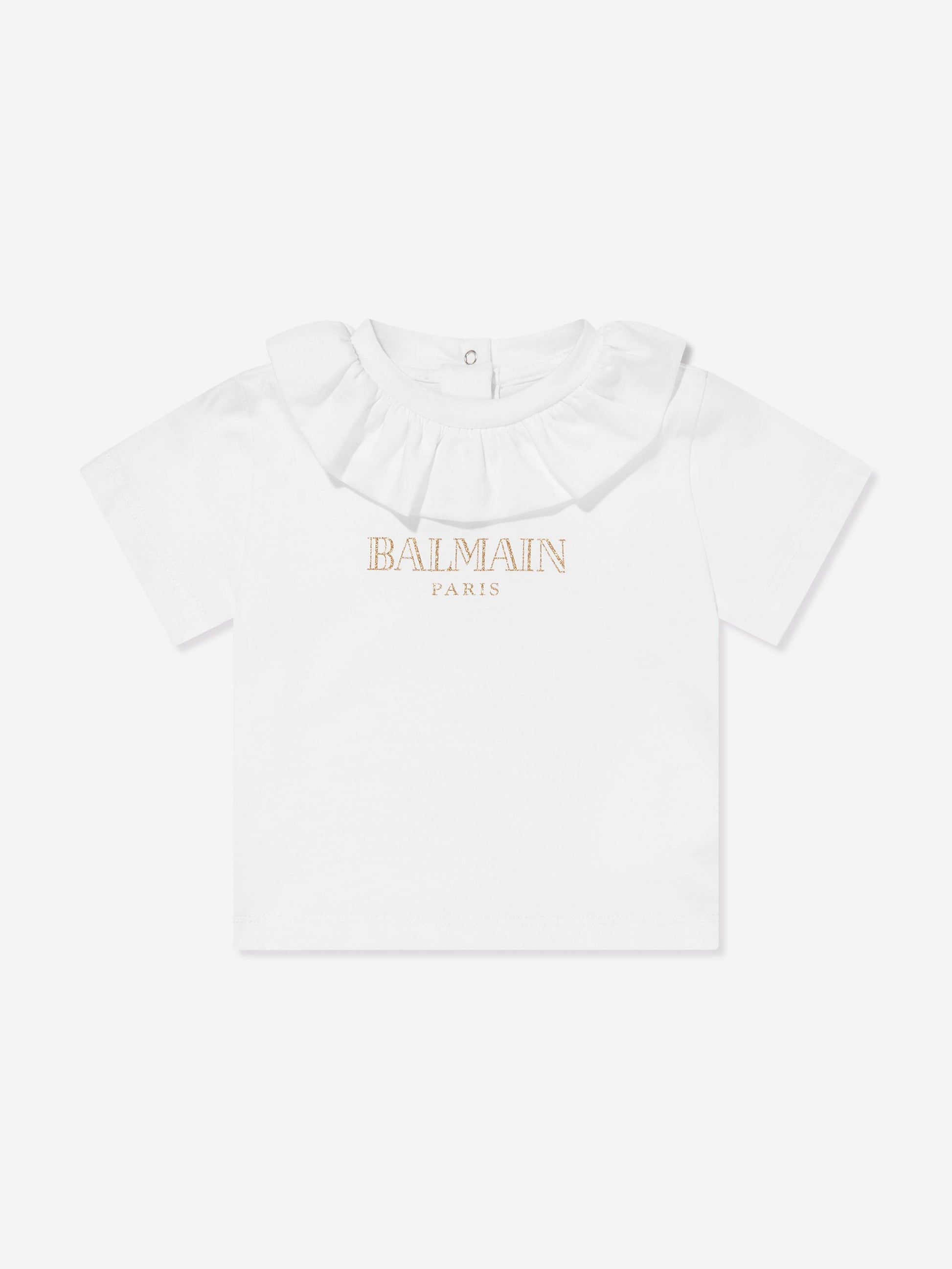 温馨提示:该商品下单后不支持取消订单,请您在购买前确认商品信息无误。商品如有缺货情况,订单会自动取消退款。预计收货时间为1至2周。 French luxury label Balmain breach the constraints of tradition by exploring new forms of innovation. This baby girls white gold short sleeve t-shirt is depicted in refined cotton and showcases a flared ruffle neckline and beautiful golden glitter 'Balmain Paris' print. Both stylish and sophisticated, she will be obsessed.