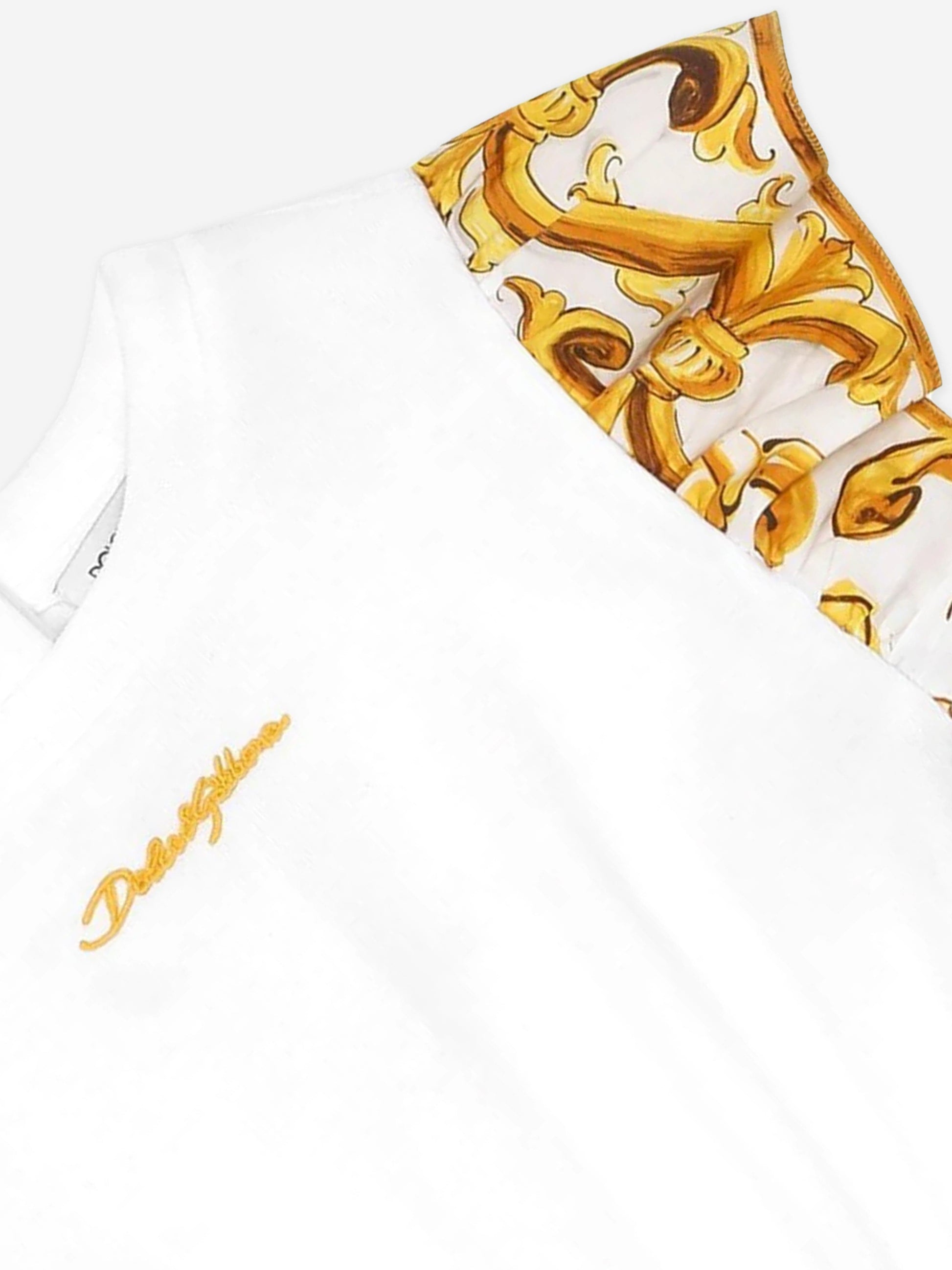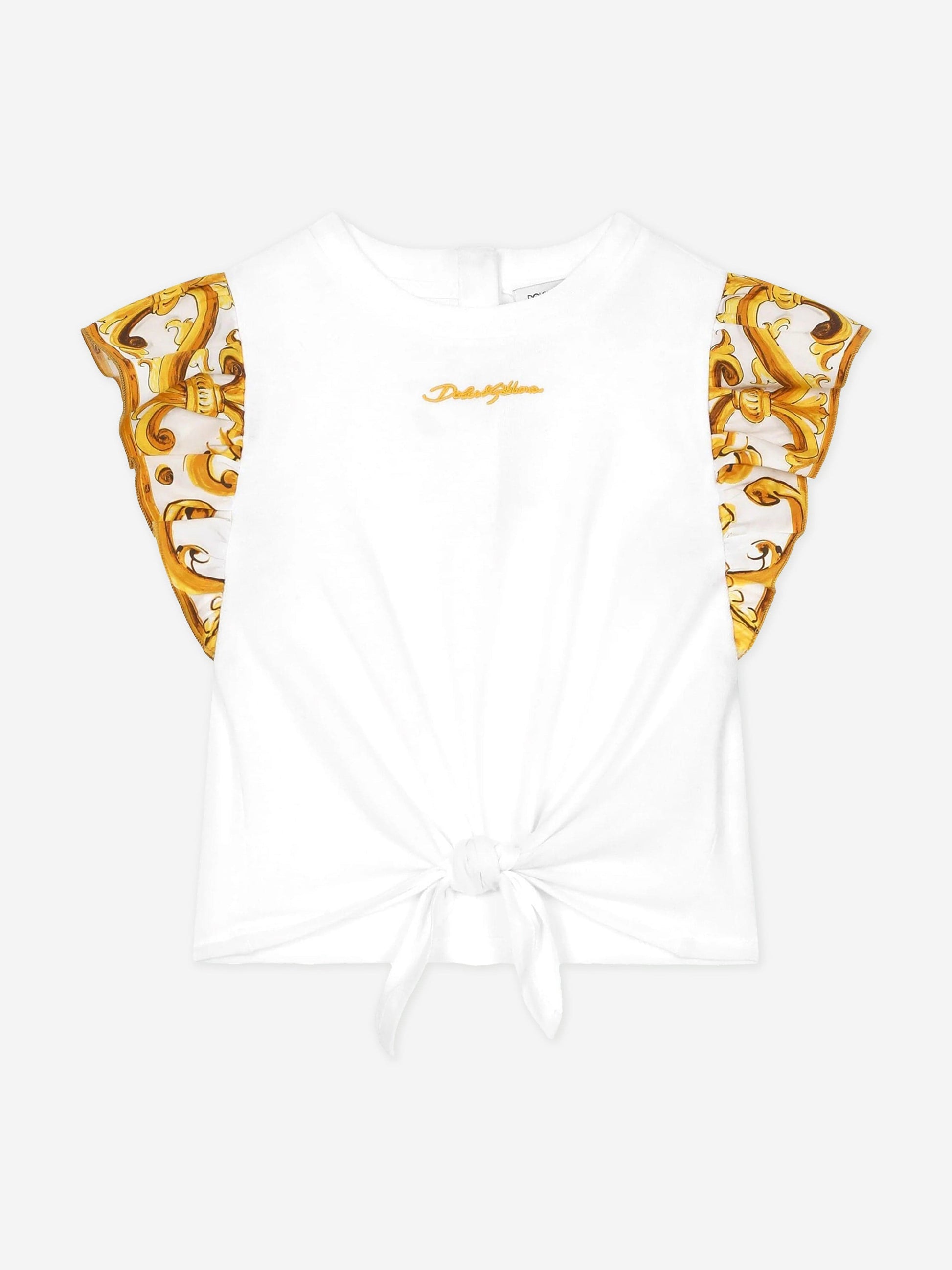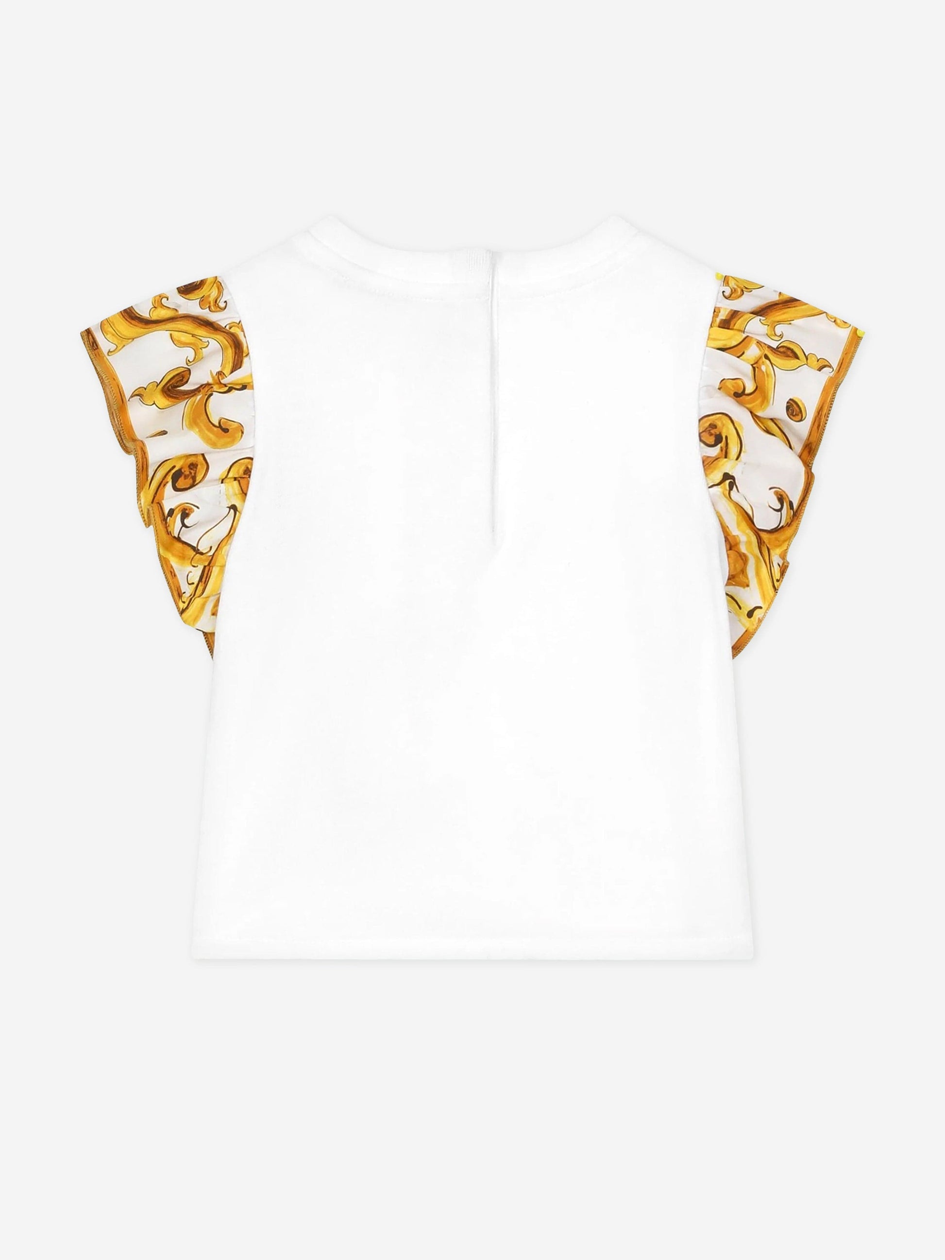 温馨提示:该商品下单后不支持取消订单,请您在购买前确认商品信息无误。商品如有缺货情况,订单会自动取消退款。预计收货时间为1至2周。 Dolce & Gabbana utilise new technological properties to create captivating aesthetics. This baby girls t-shirt is a part of the FW24/25 Girl’s Collection. Depicted in Majolica, a symbol of Italian craftsmanship, it explores lemon yellow, brightened up by pure white, inspired by the ancient tiles of Sicily. Crafted from white cotton with elegant frilled trims for shoulders. She will look and feel divine.