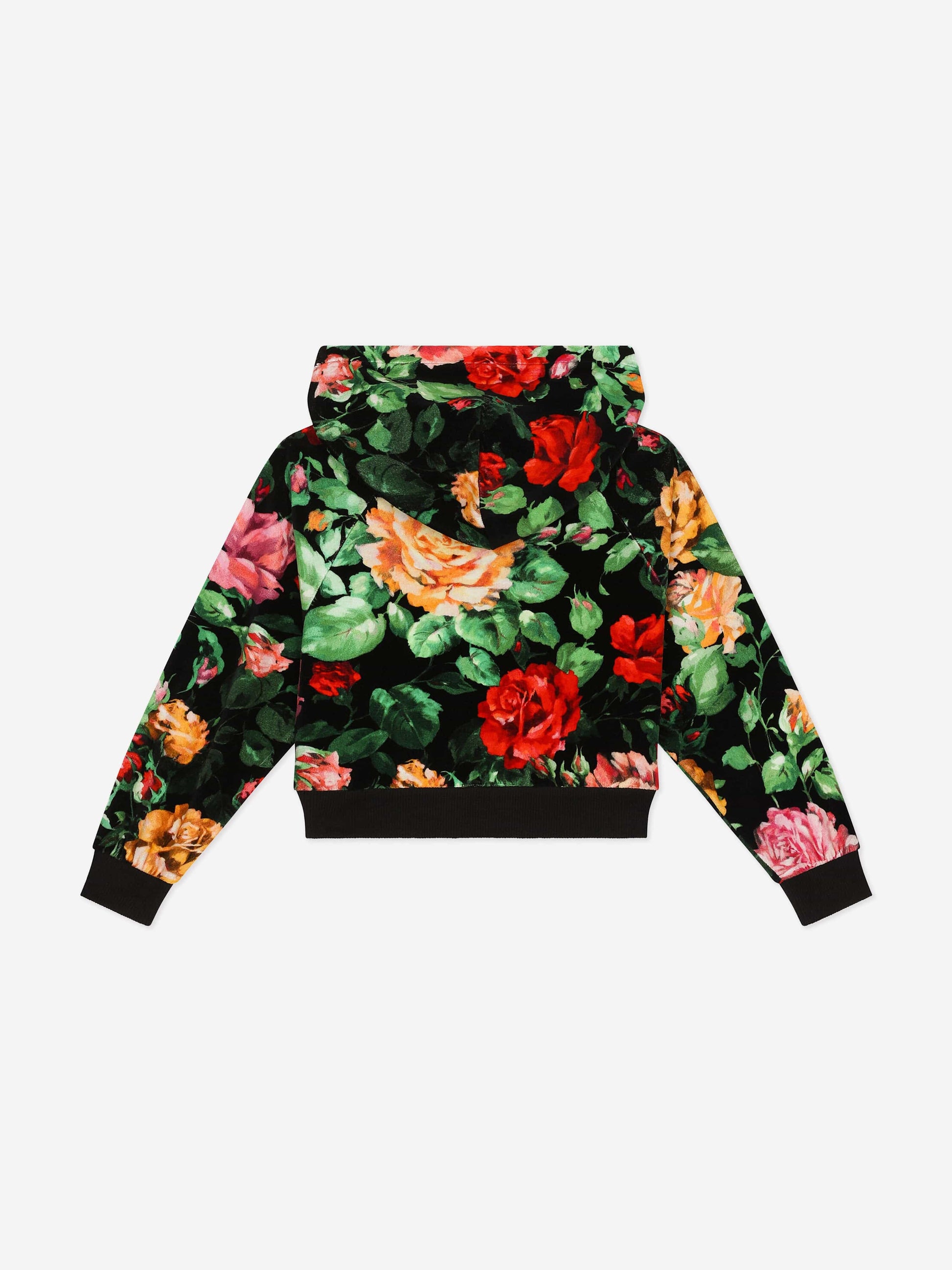 温馨提示:该商品下单后不支持取消订单,请您在购买前确认商品信息无误。商品如有缺货情况,订单会自动取消退款。预计收货时间为1至2周。 Dolce & Gabbana is giving shape to a timeless wardrobe, composed of iconic pieces that are perfect for everyday wear. This girls Chenille hoodie is a captivating construction with all-over rose print over a black background. Envisioned in a cropped fit with stretch knit cuffs.