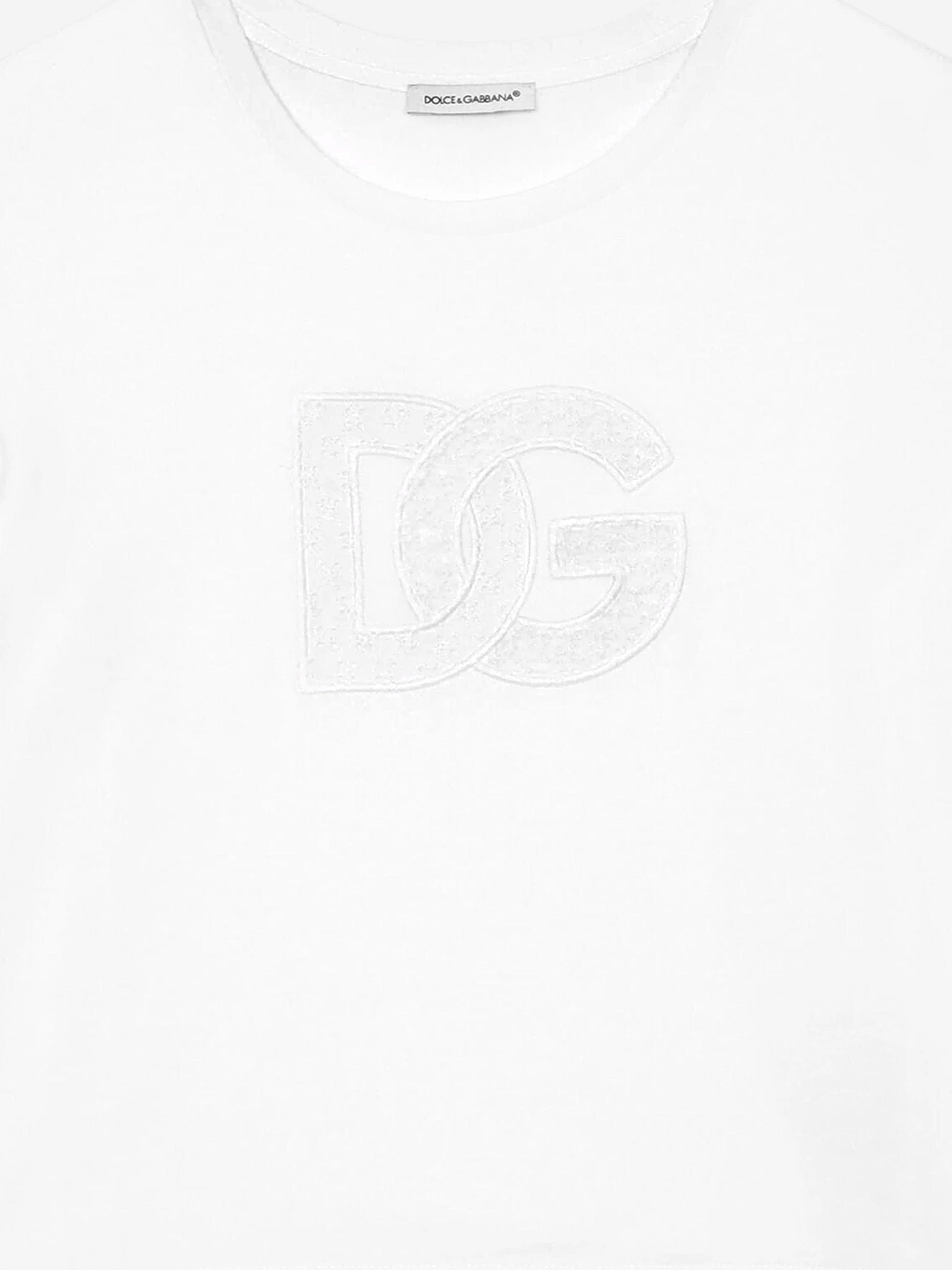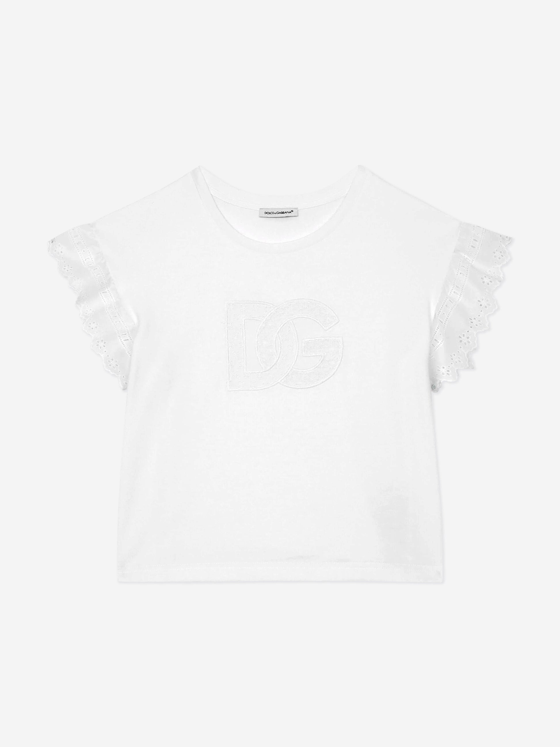 温馨提示:该商品下单后不支持取消订单,请您在购买前确认商品信息无误。商品如有缺货情况,订单会自动取消退款。预计收货时间为1至2周。 Evoking the charm of the 1960s in Capri and it's iconic pure white colour palette. This girls beautiful cotton jersey t-shirt is the perfect A/W piece woven with the perfect mix of summer nostalgia. It showcases delicate broderie anglaise and macramé lace detail, adorned with the iconic DG logo. With demure, whimsical trims and short cap sleeves, she will embody unparalleled style in the cooler months.