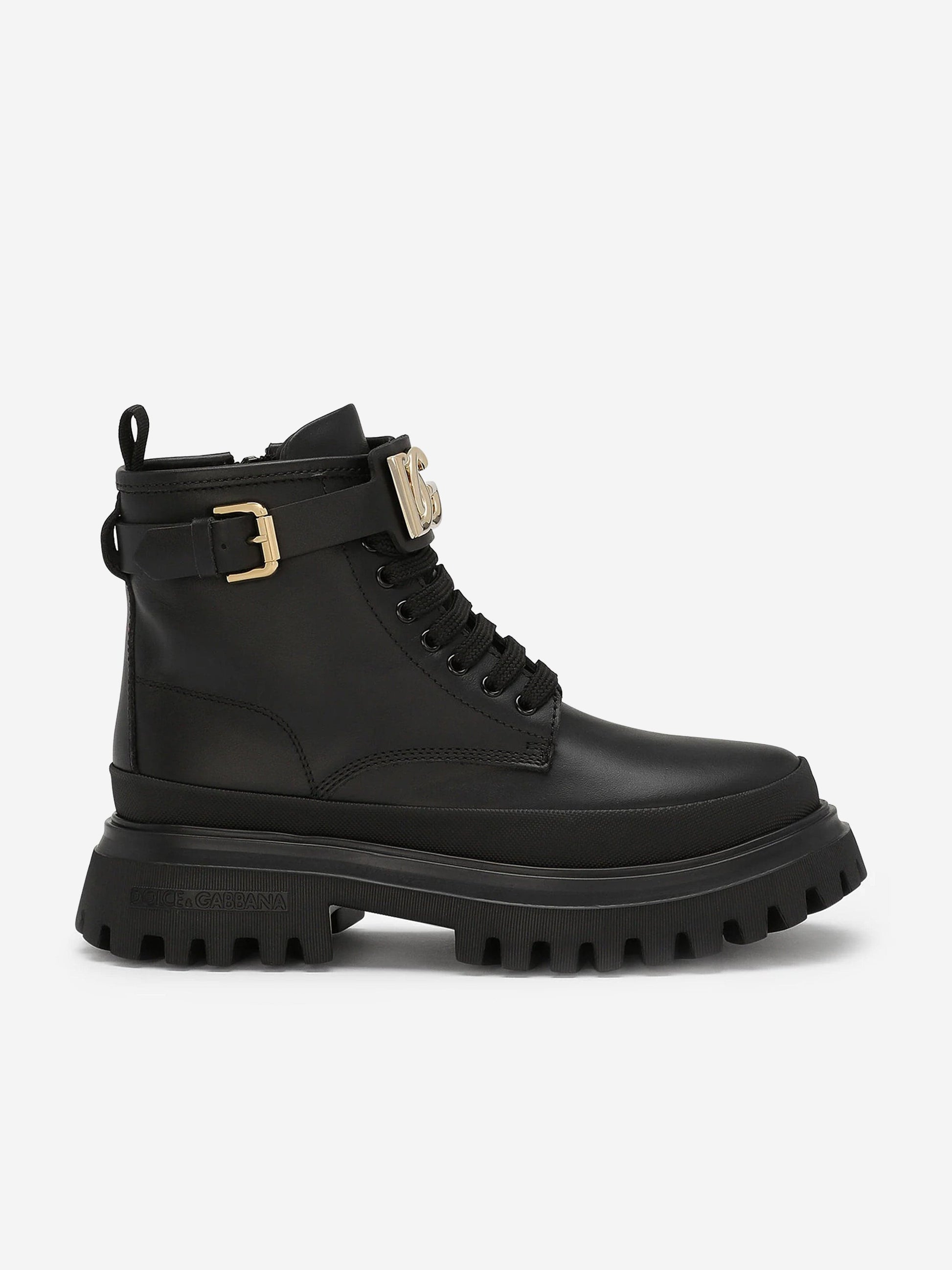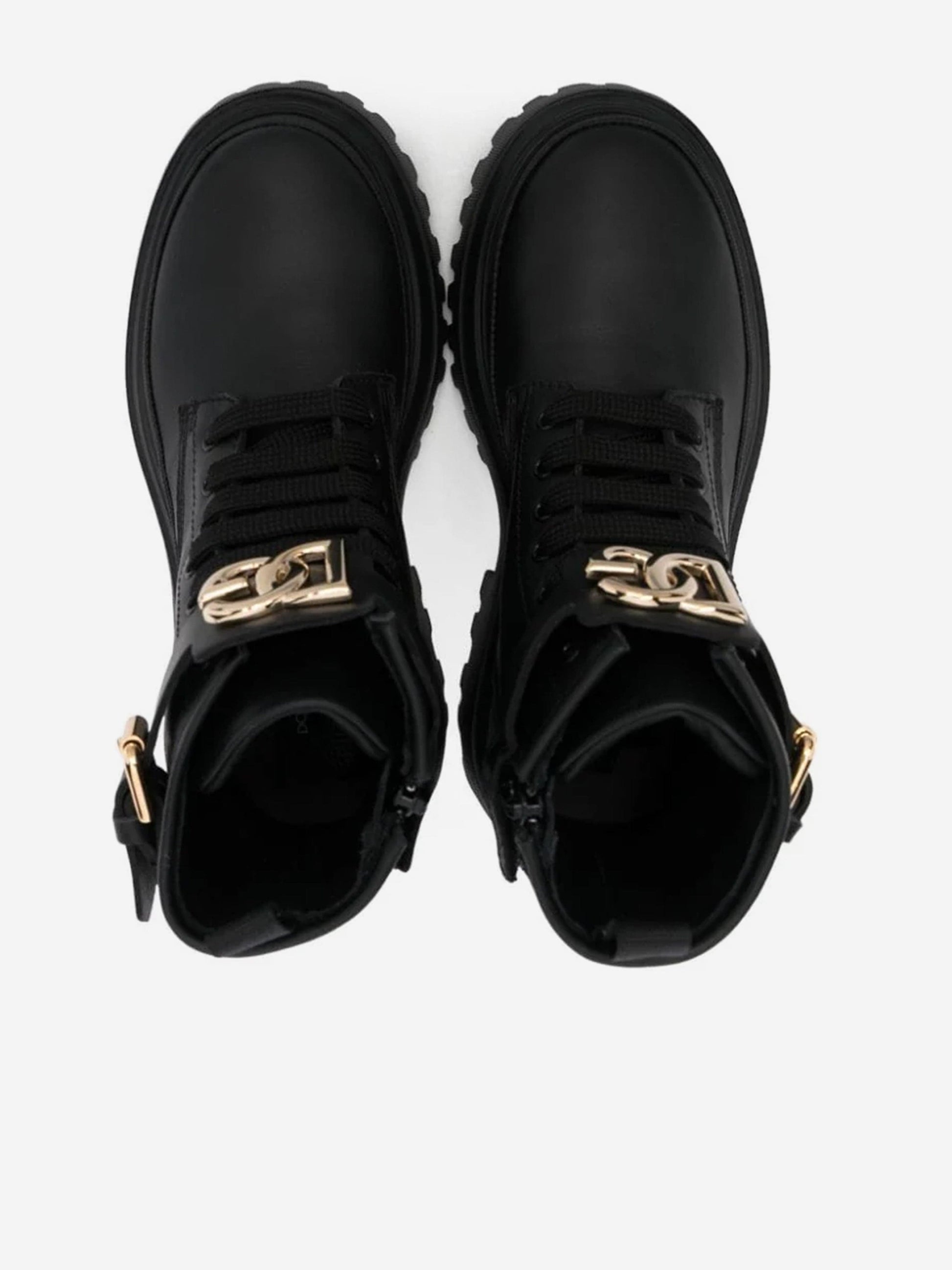 温馨提示:该商品下单后不支持取消订单,请您在购买前确认商品信息无误。商品如有缺货情况,订单会自动取消退款。预计收货时间为1至2周。 Introducing the Girls Leather Combat Boots in Black by Dolce_Gabbana – the epitome of chic resilience for your girl's AW2024 collection.