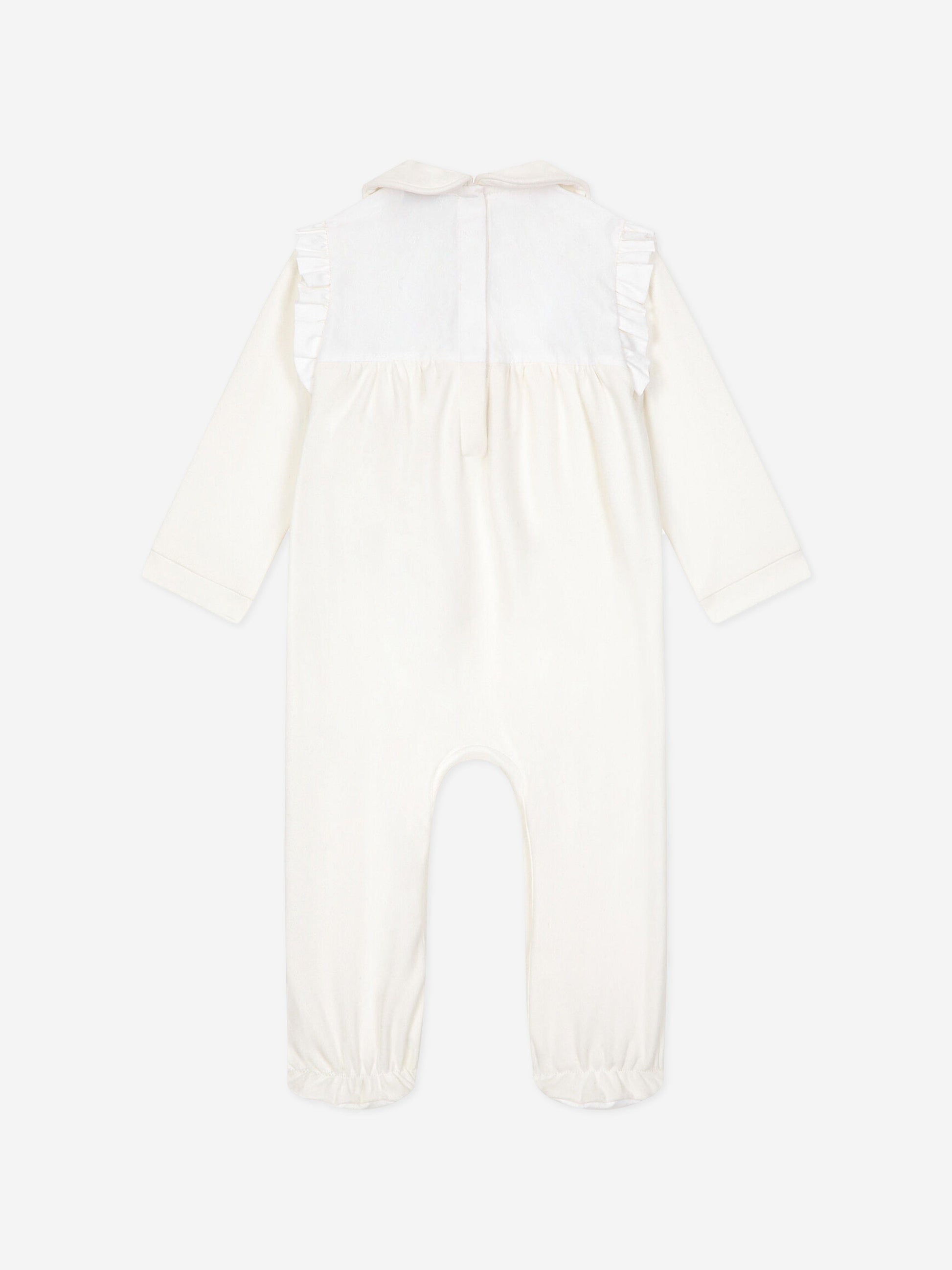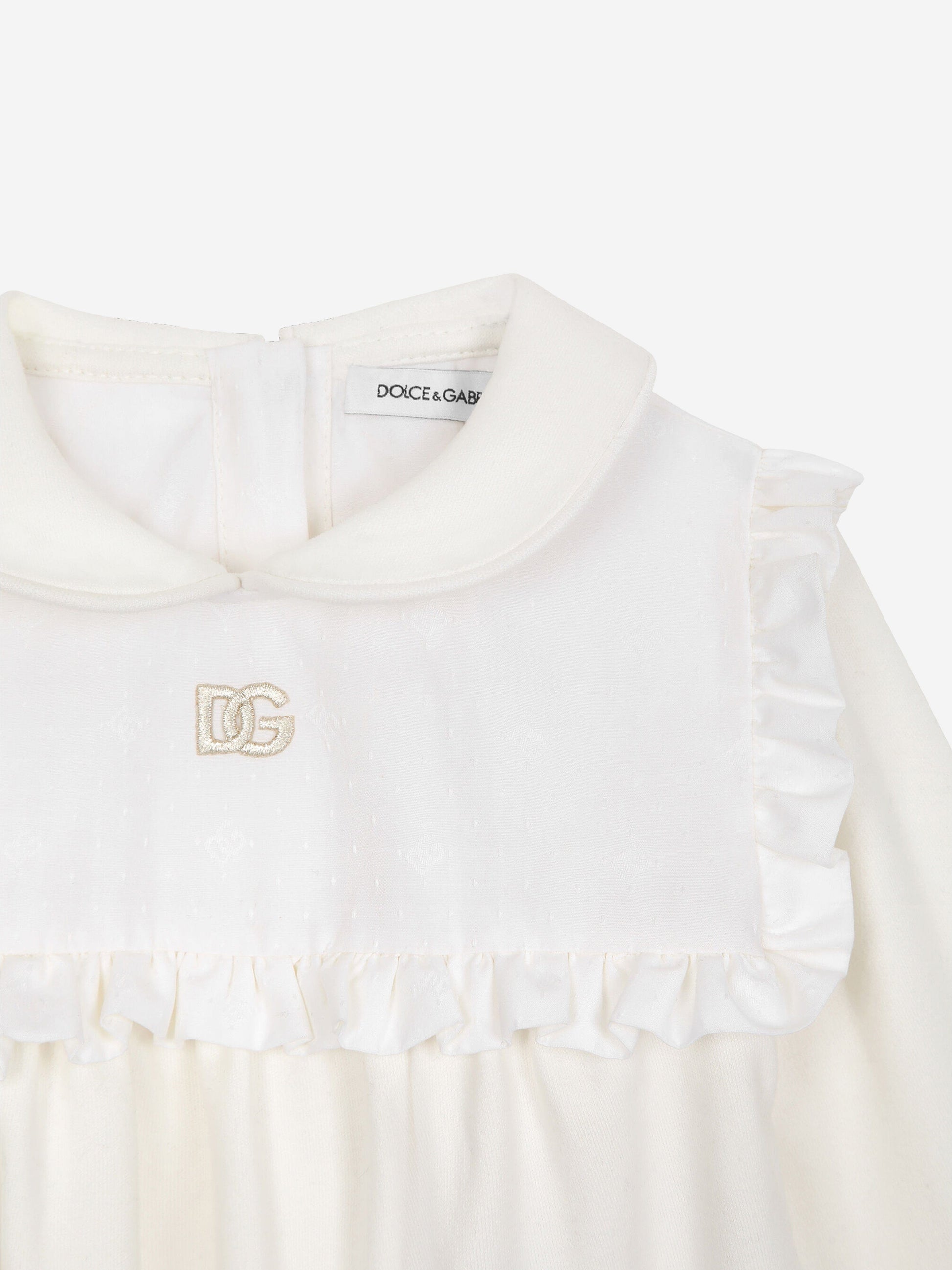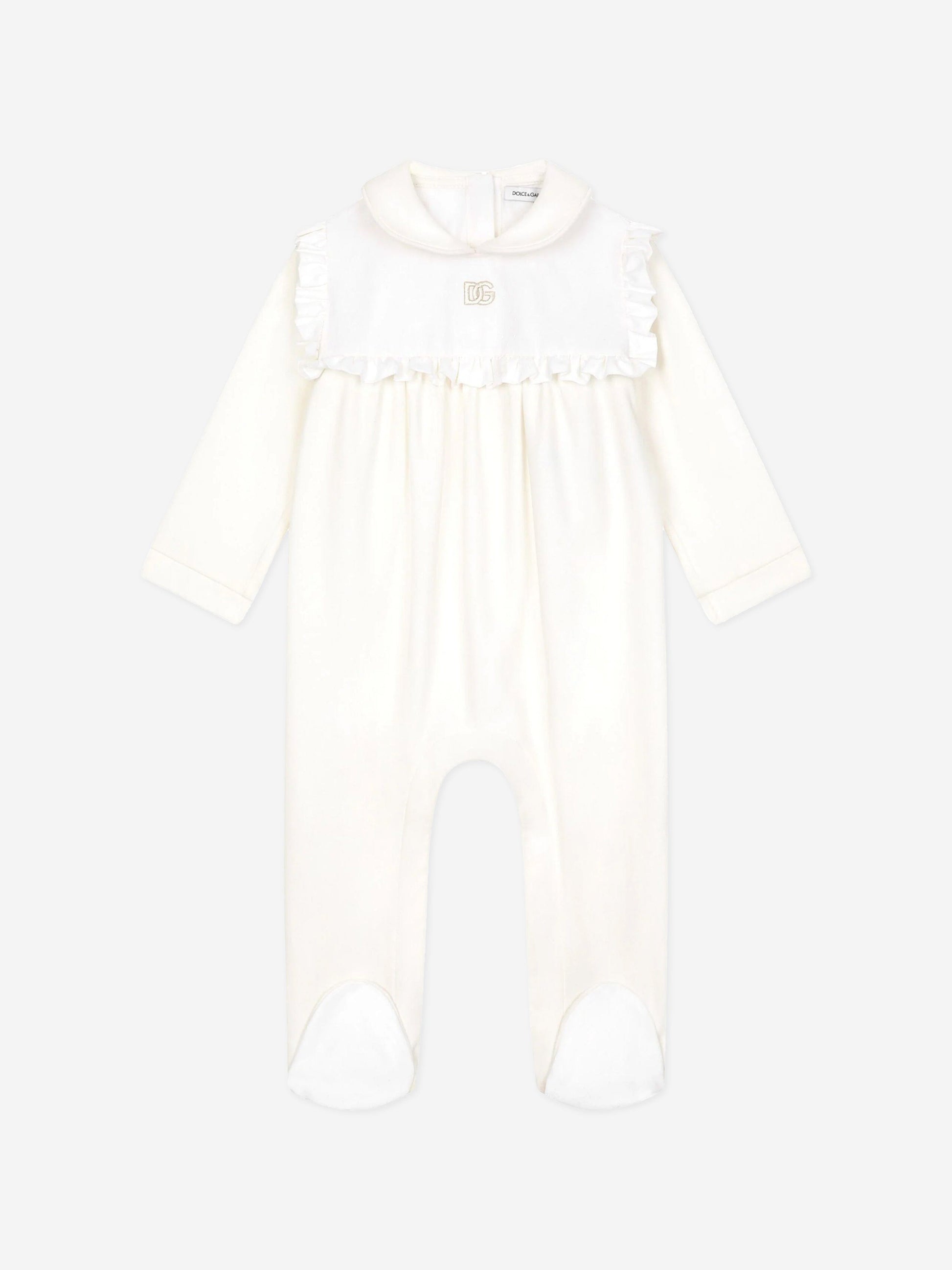 • Onesie: Regular fit, Round Neck with Interlock Collar, Branded Jacquard Yoke With Ruched Trim, Embroidered DG Logo Patch, Long Sleeves With Cuffs, Footed Pants With Branded Jacquard On Bottom Feet, Press-Stud Fastenings