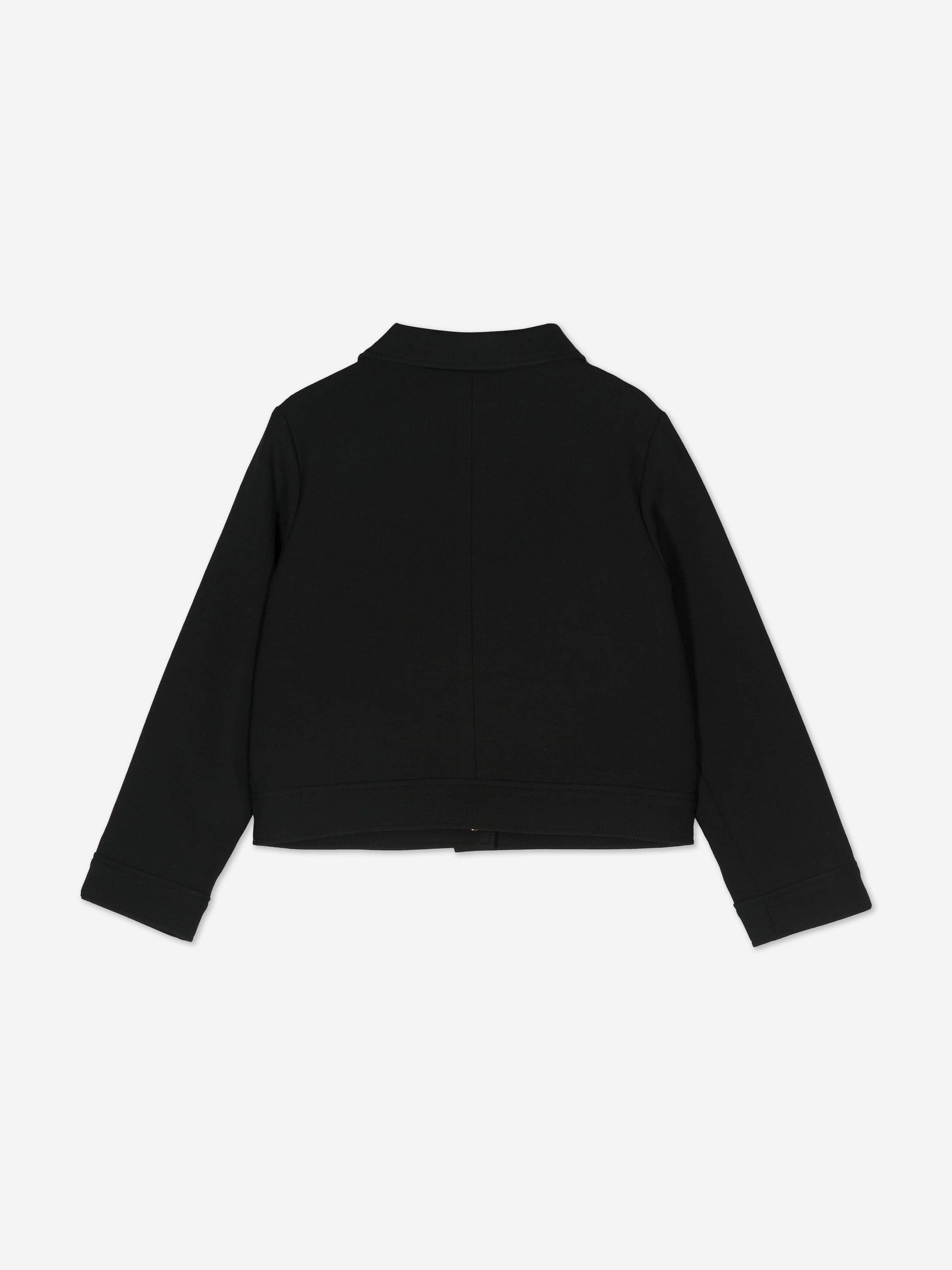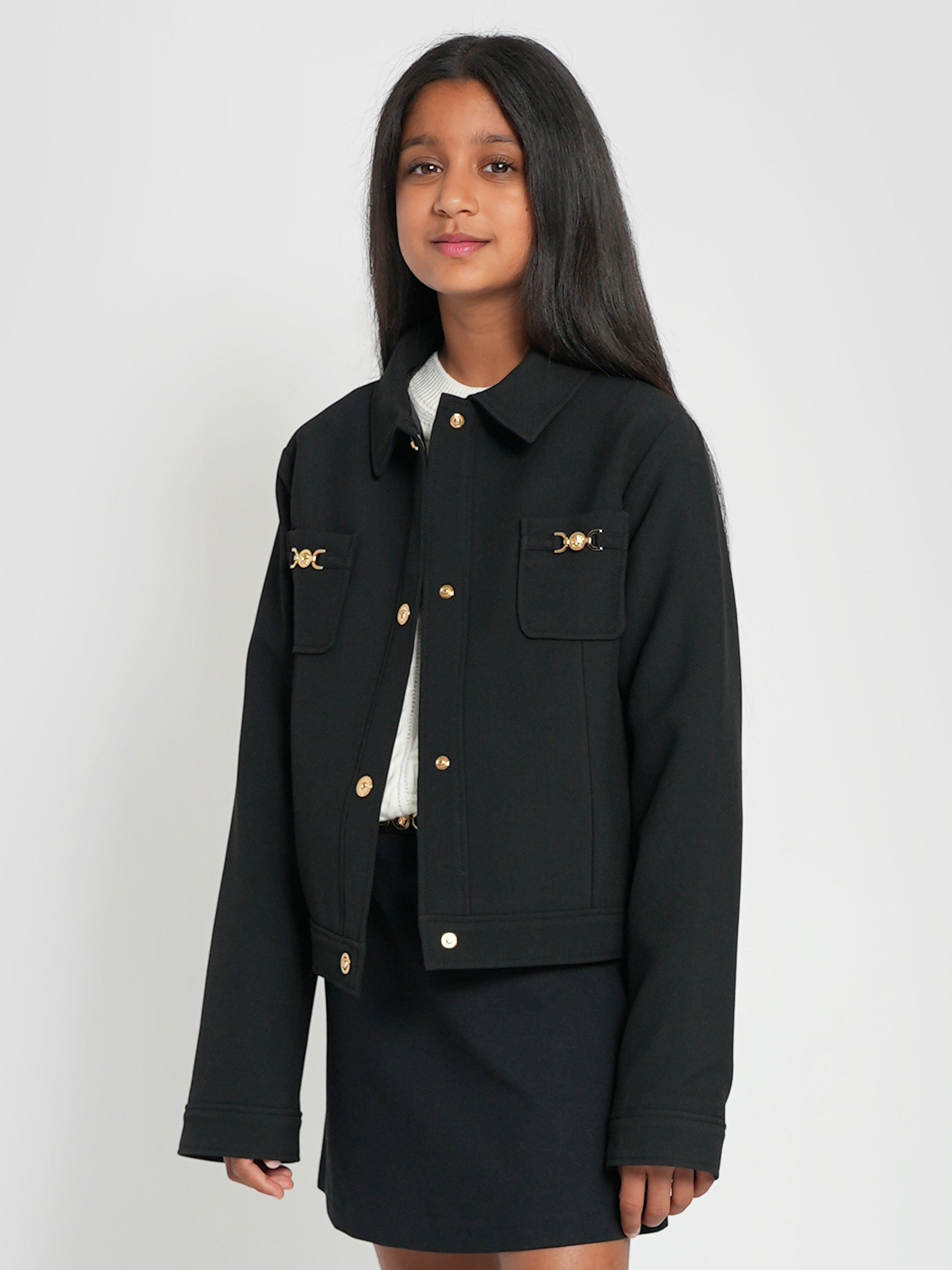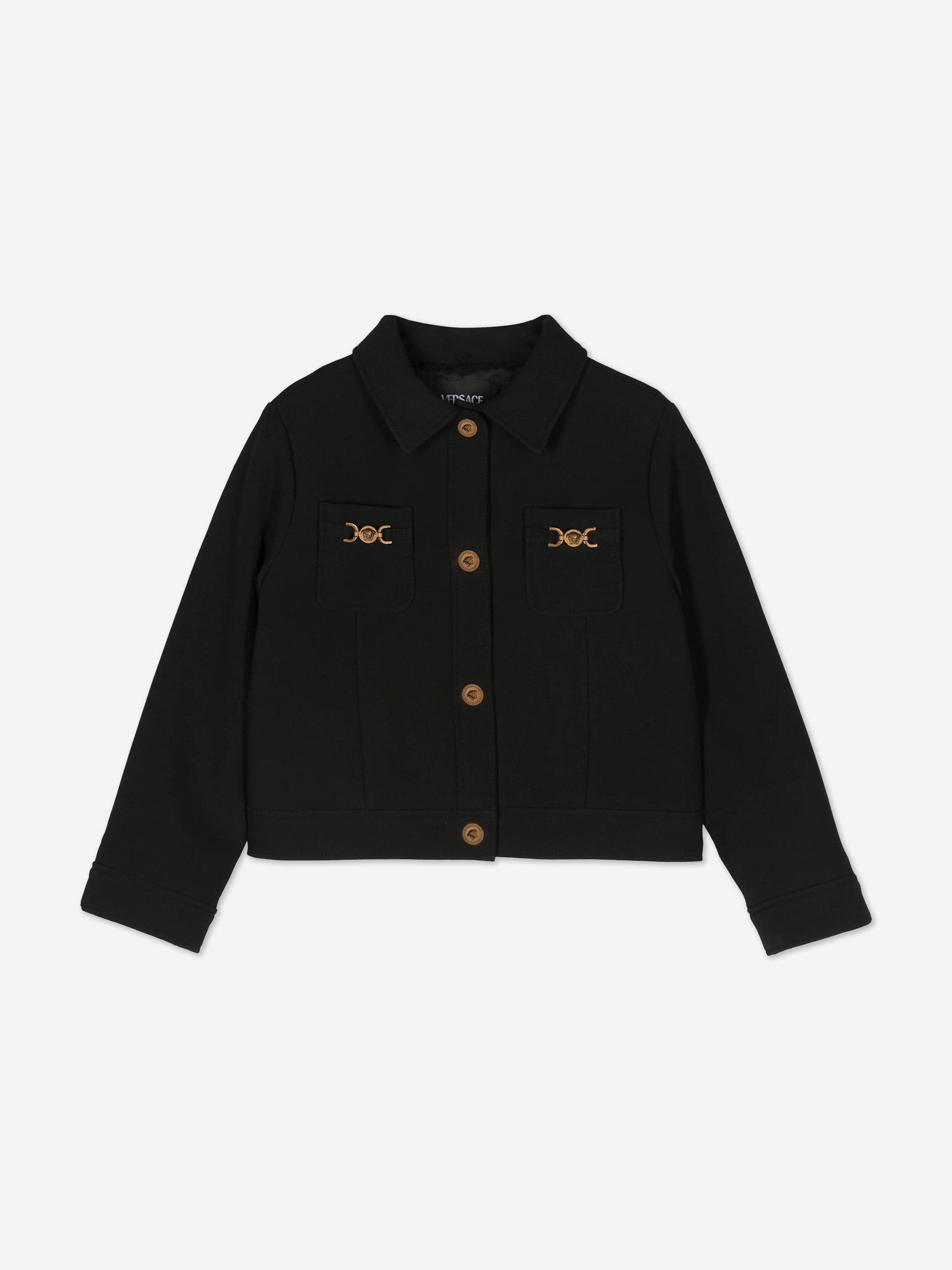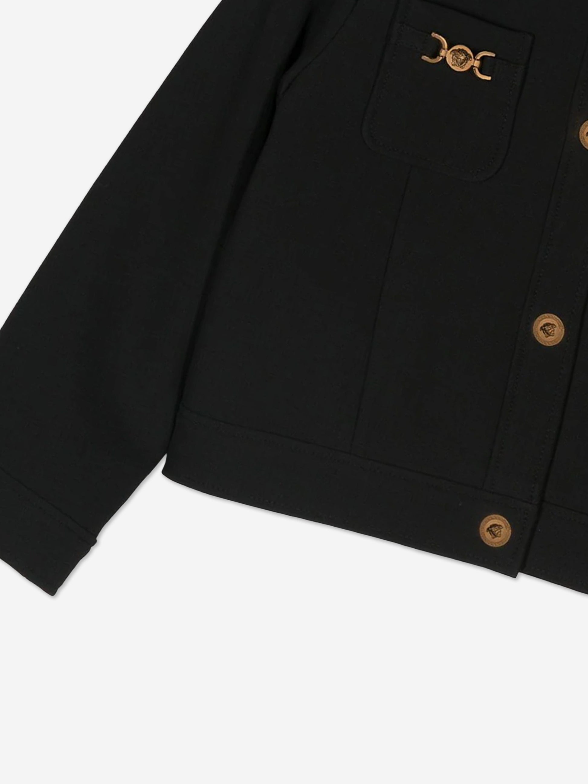 温馨提示:该商品下单后不支持取消订单,请您在购买前确认商品信息无误。商品如有缺货情况,订单会自动取消退款。预计收货时间为1至2周。 Versace envision bold, innovative abstracts in their beautifully crafted aesthetics. This girls black short jacket captures the Italian label's passion for daring and unparalleled technology. Envisioned with a classic collar, Medusa plaque detail via two chest patch pockets and signature Medusa Head buttons.